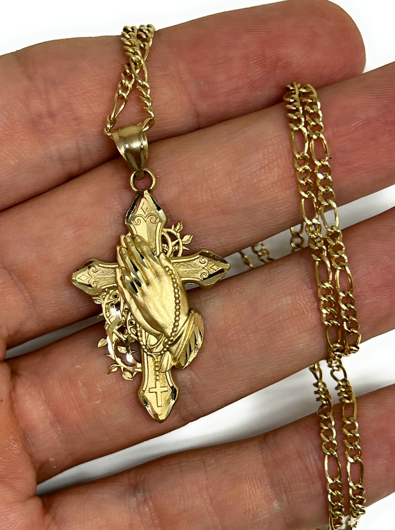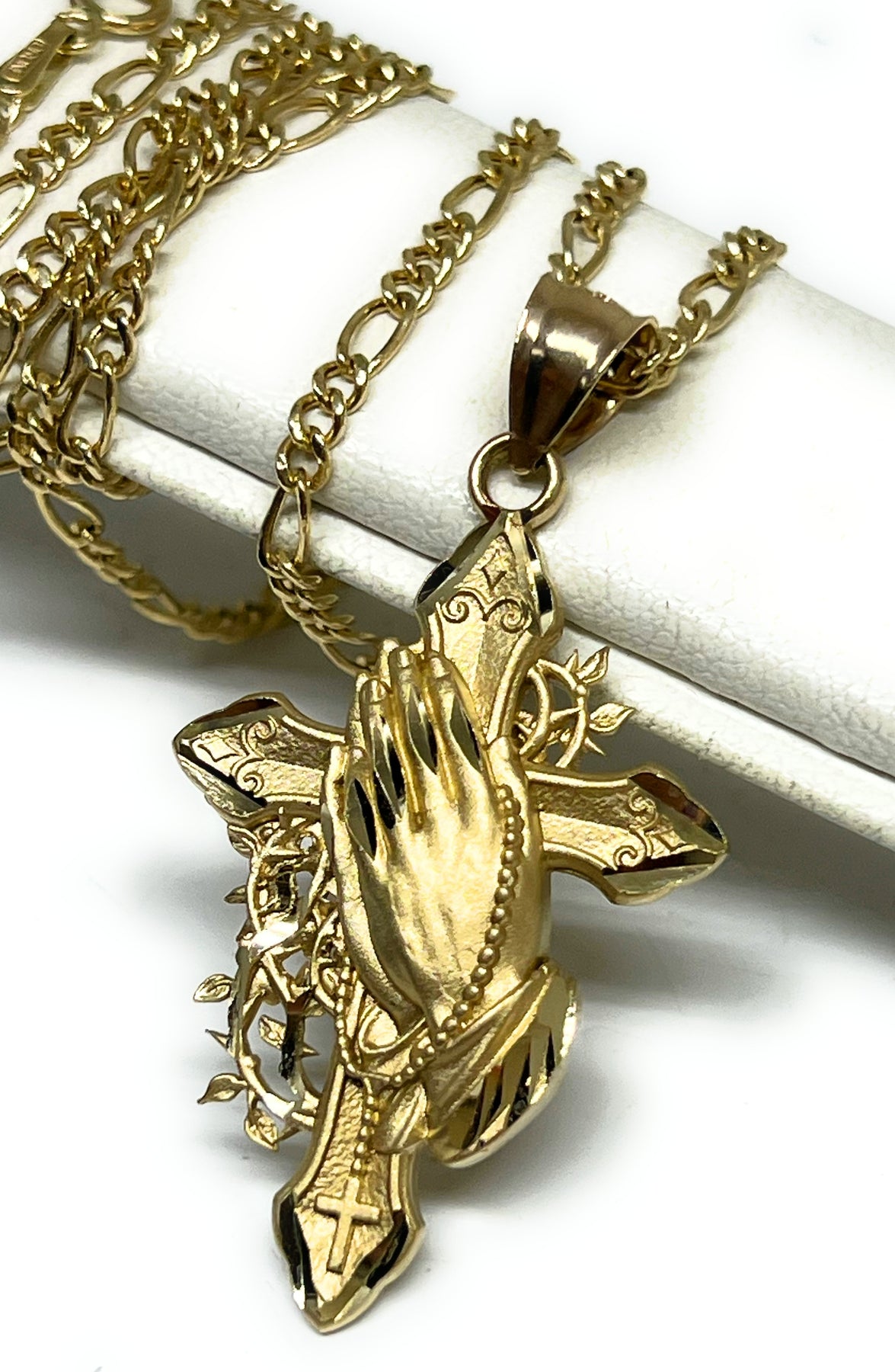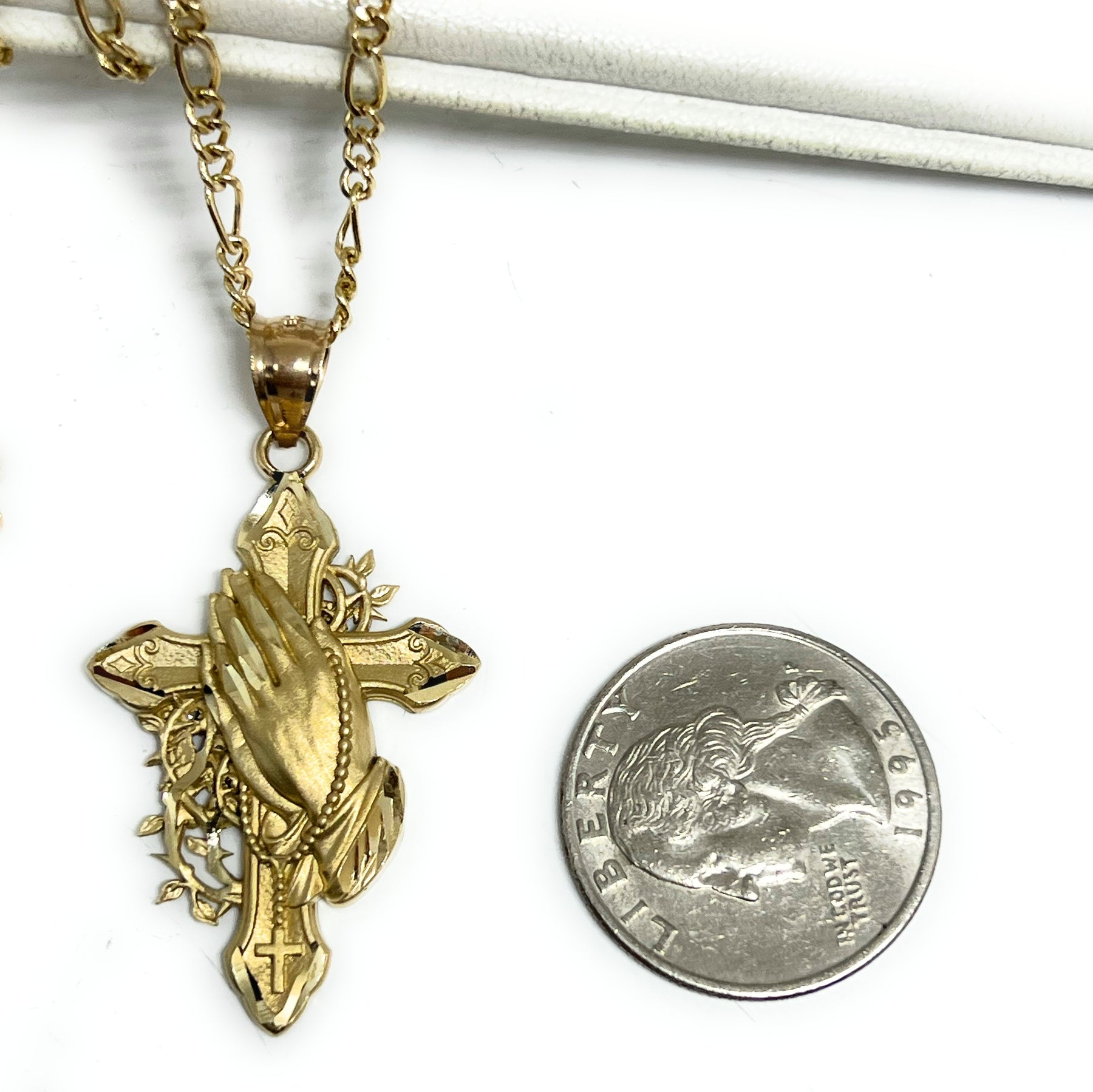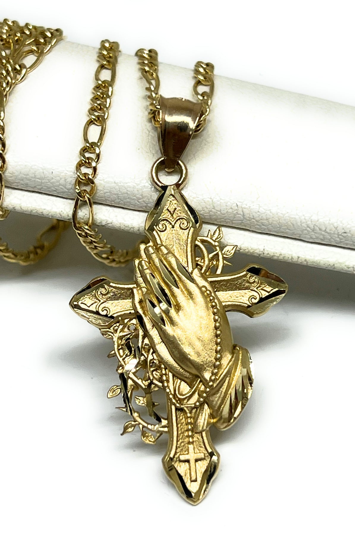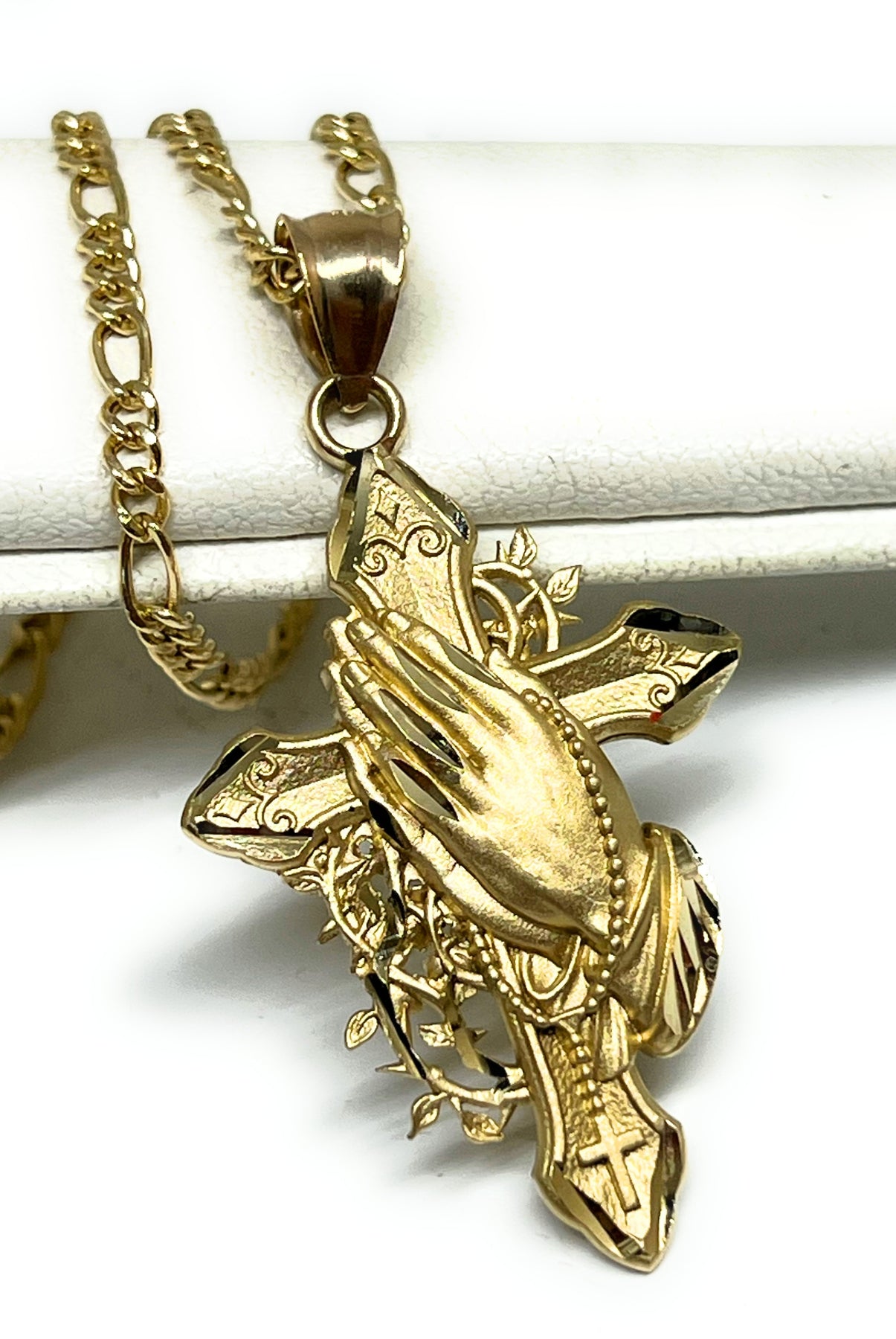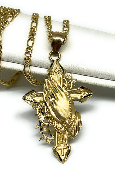 10k Solid Gold Praying Hands Cross Pendant Necklace (LG, MED, SM)
