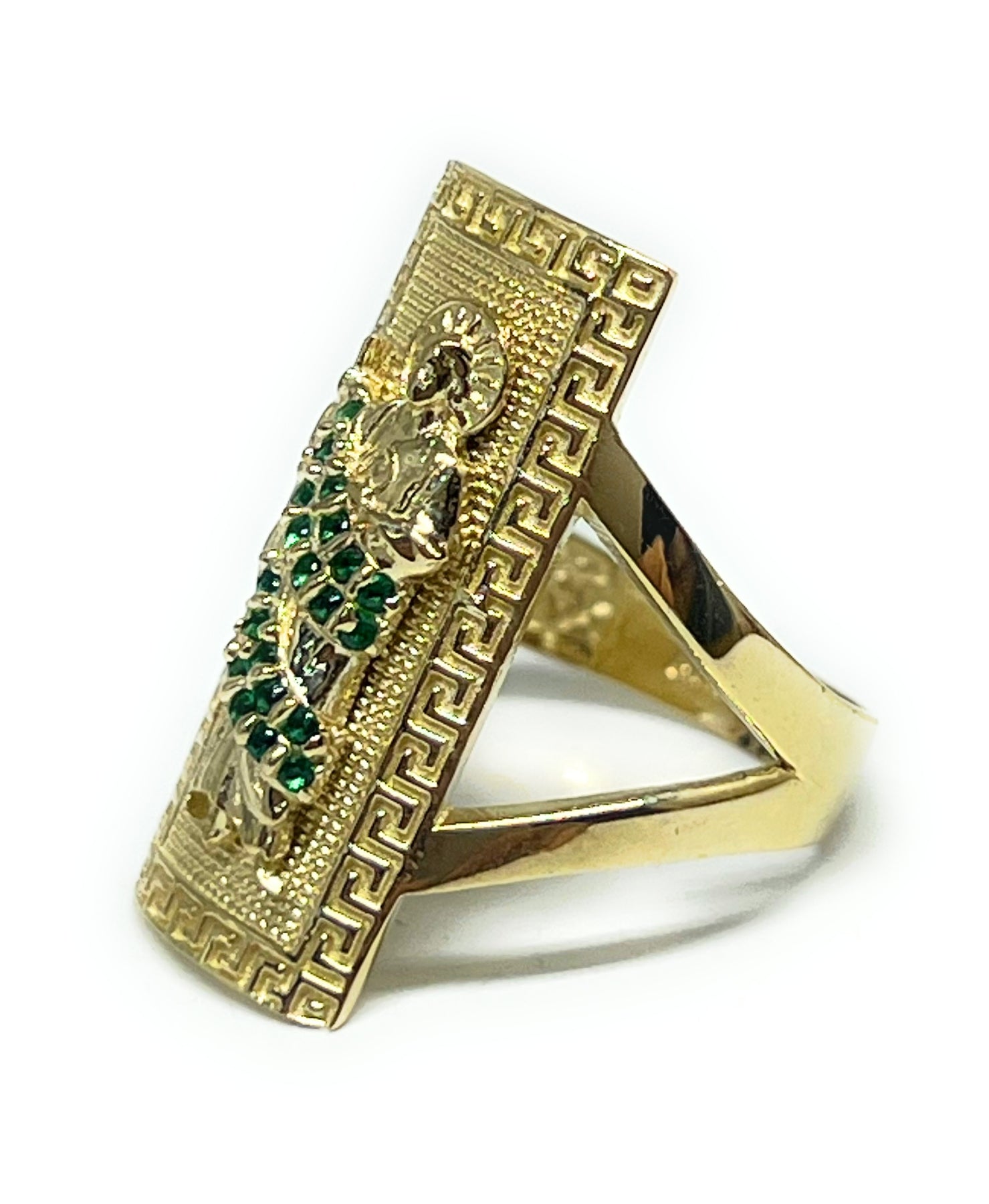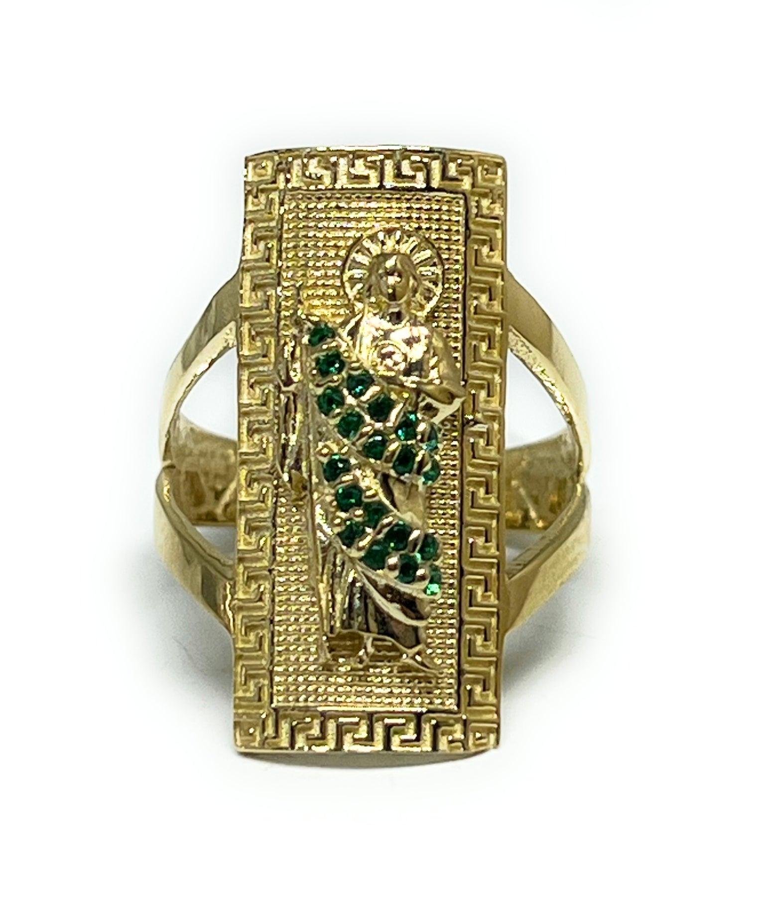 - San Judas Saint Jude Ring Green CZ stones Greek Border 10k solid gold guaranteed.