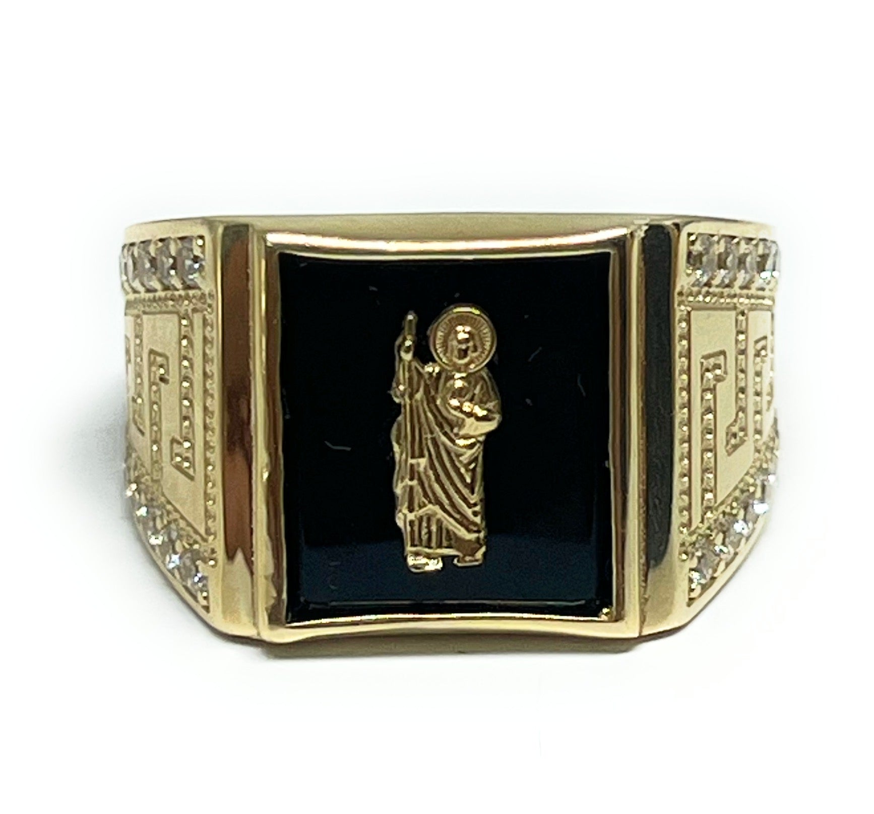 14k Solid Gold SAAN JUDAS SAAINT JUDE ONYX CZ GREEK BORDER Ring (8.9g)