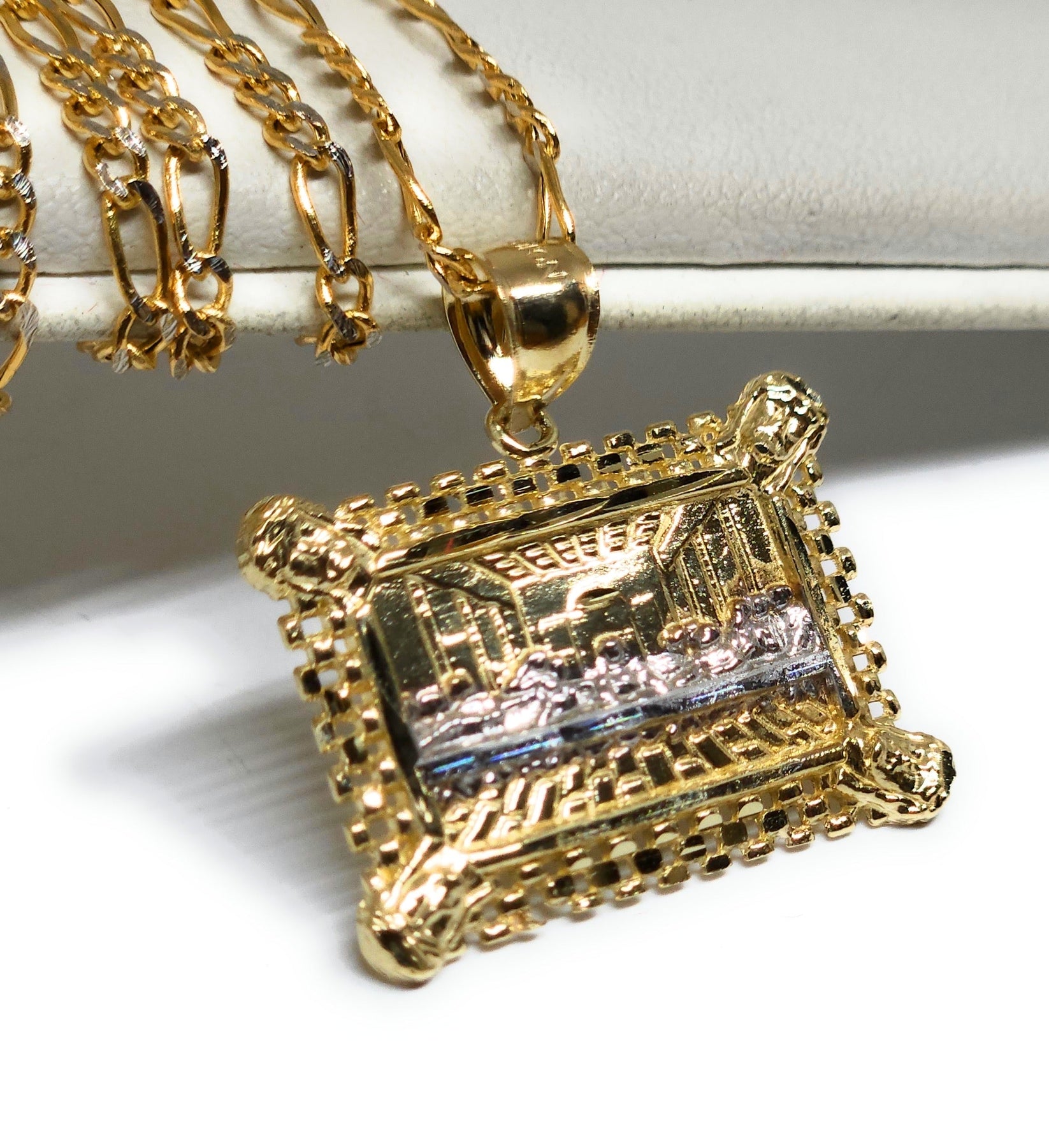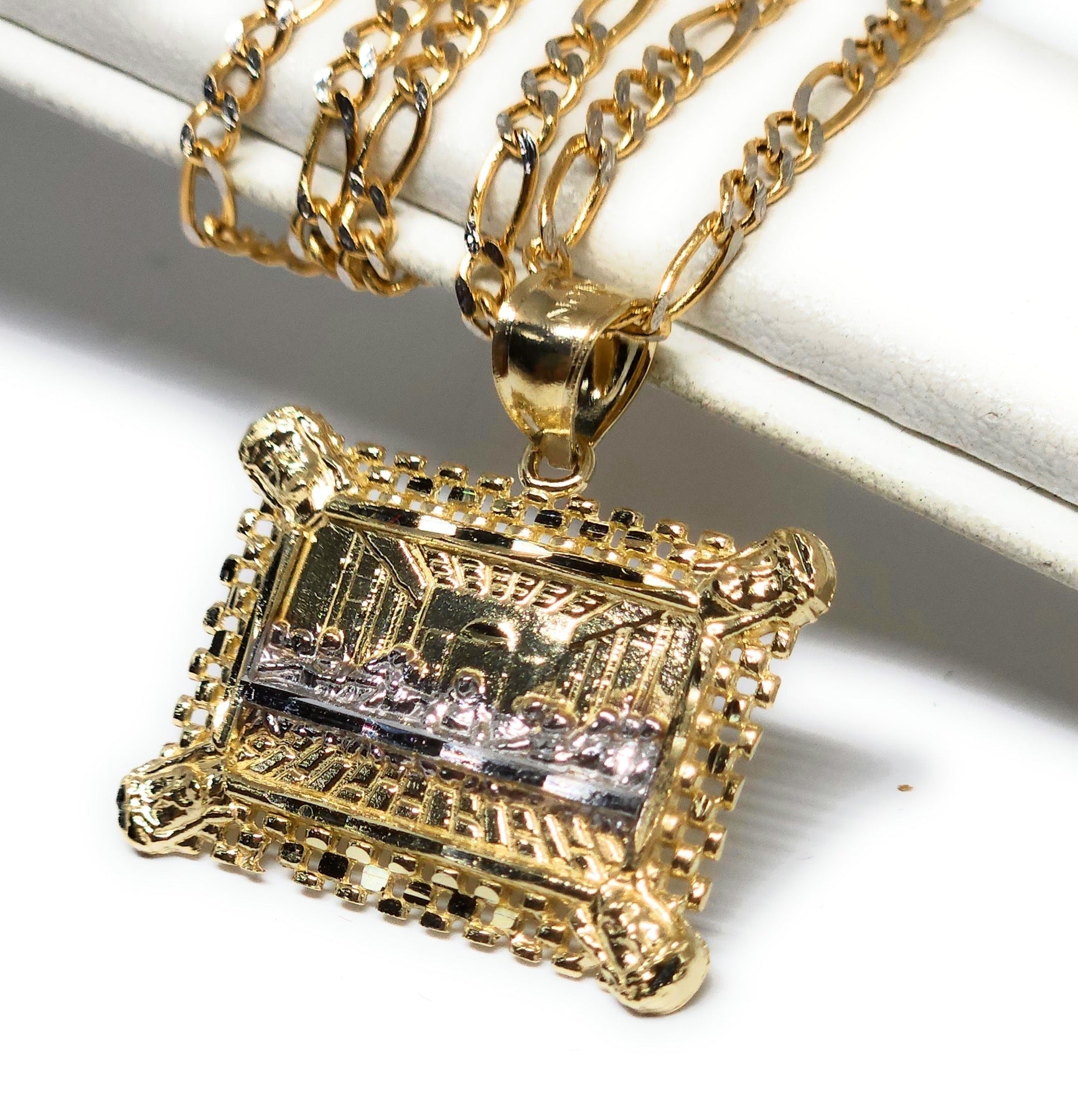 14k Solid Gold Yellow 2-Tone Jesus Last Supper CZ NUGGET BORDER Pendant Necklace (6.8g)
