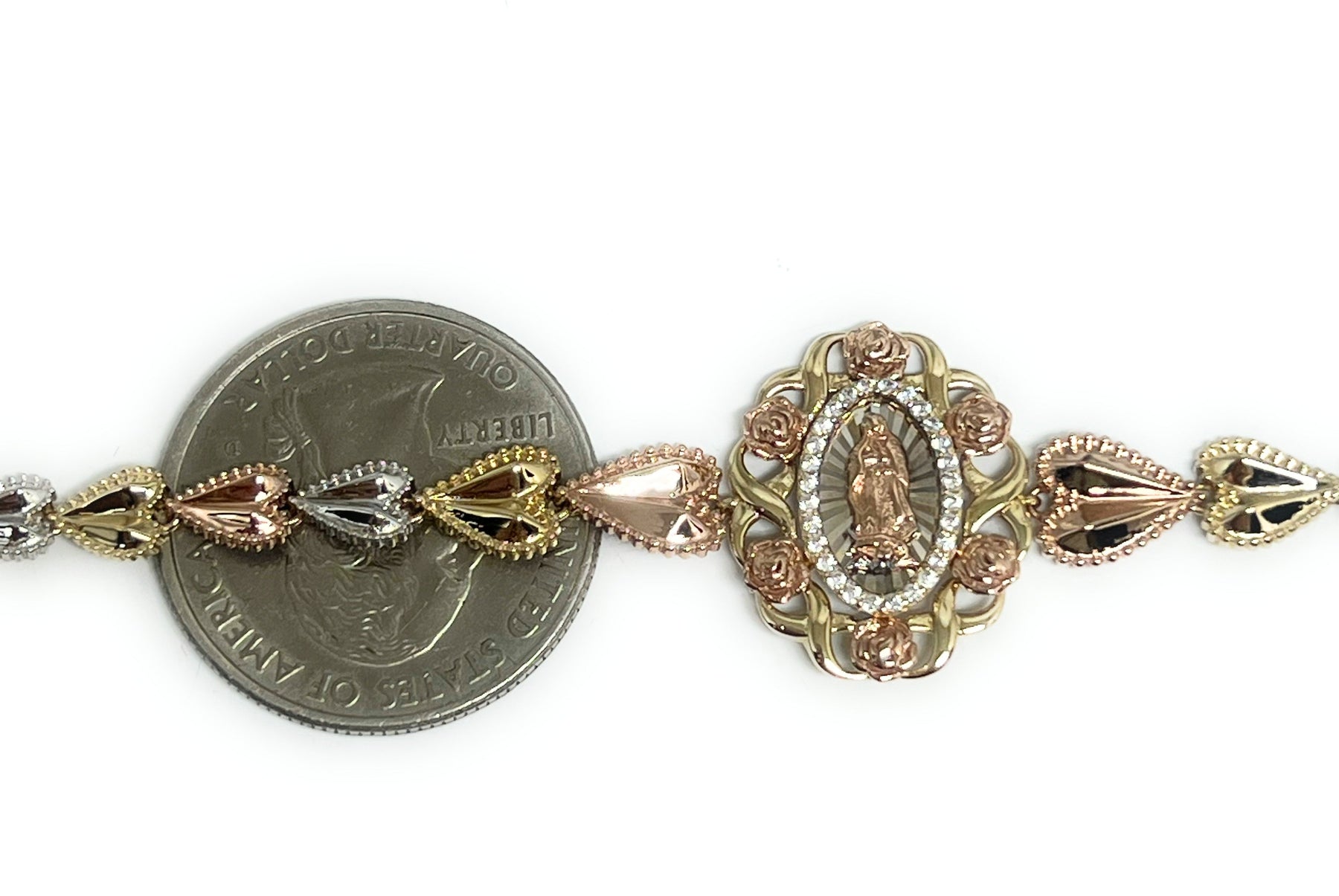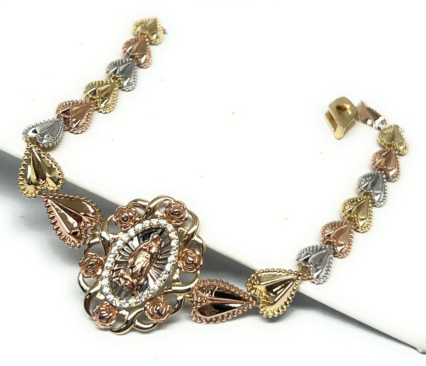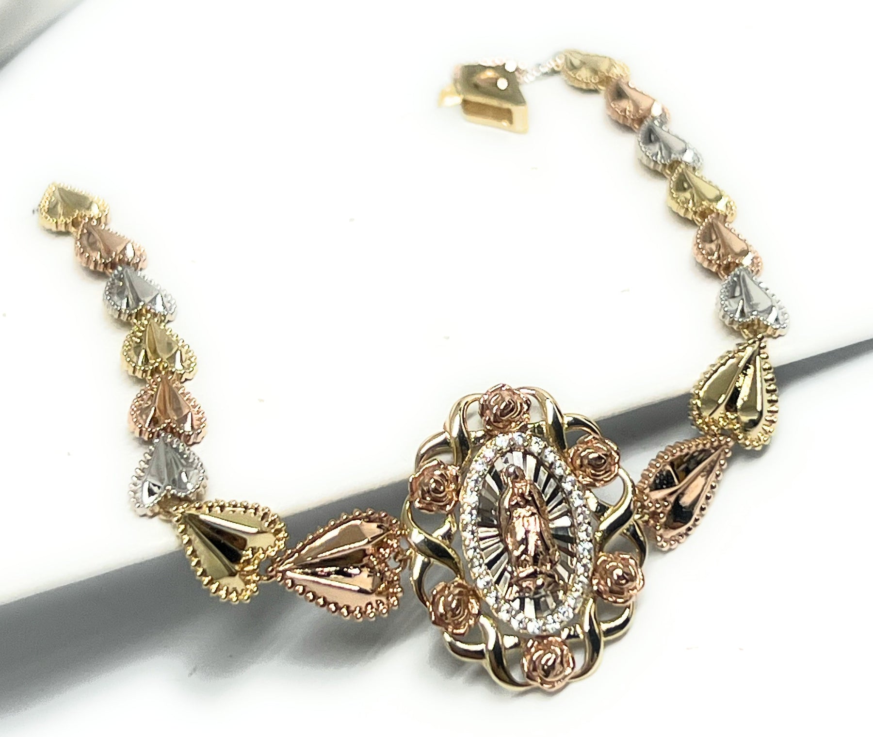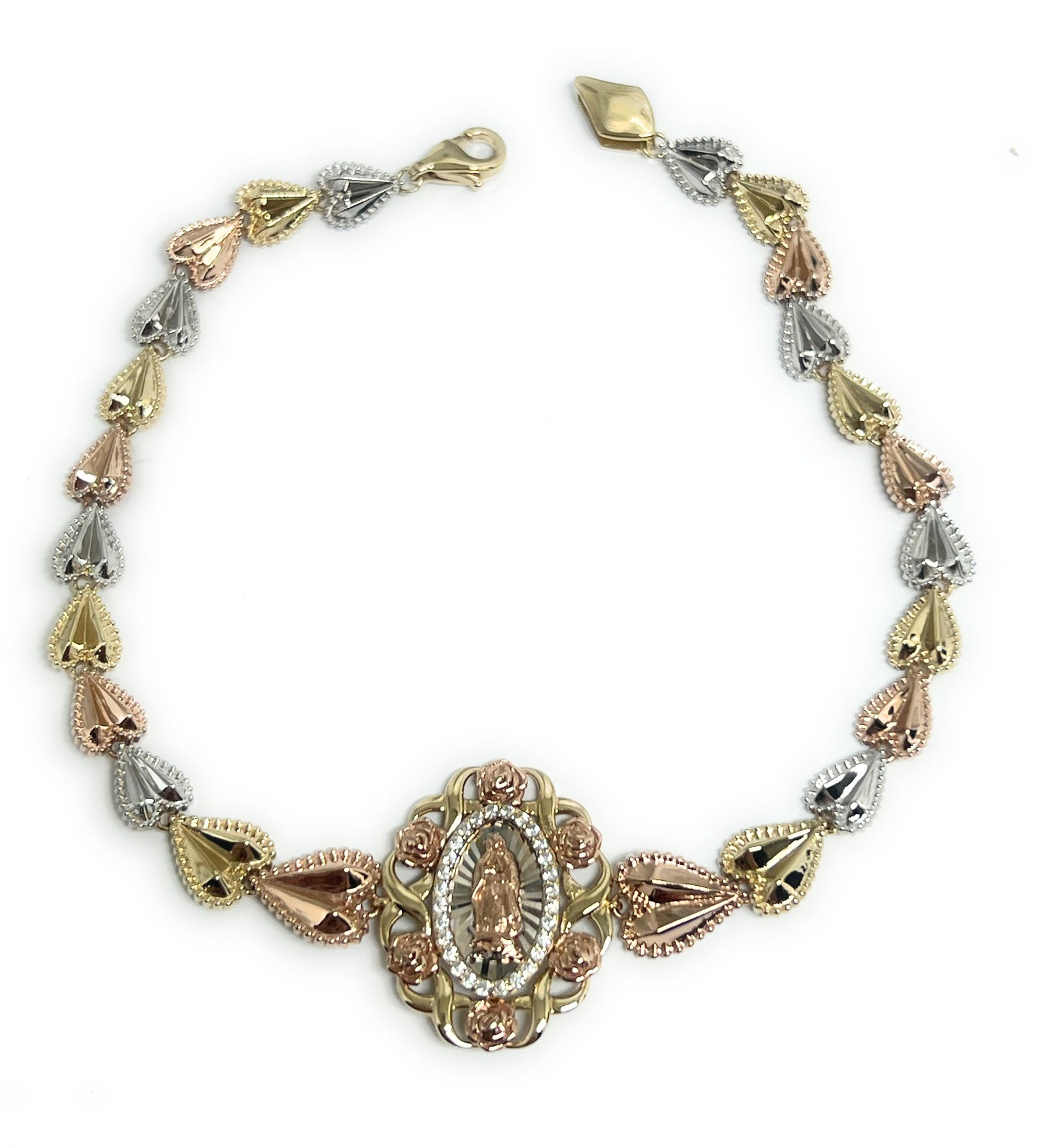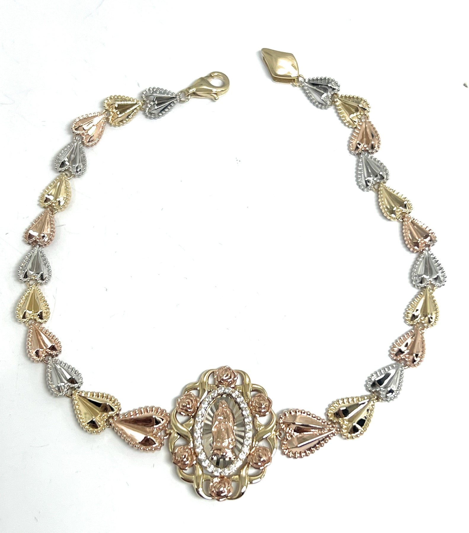 Tri-color links with flowers and rose gold virgin Mary center.