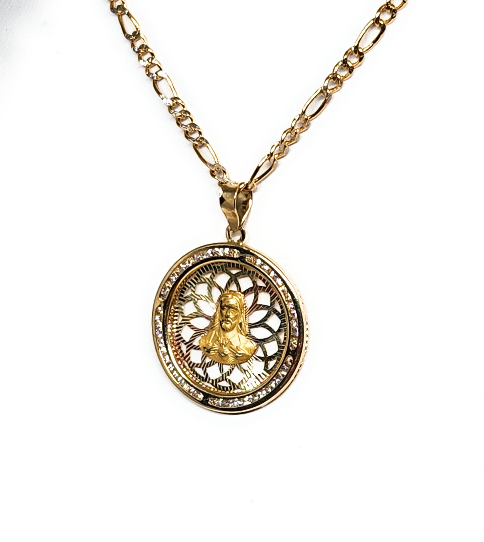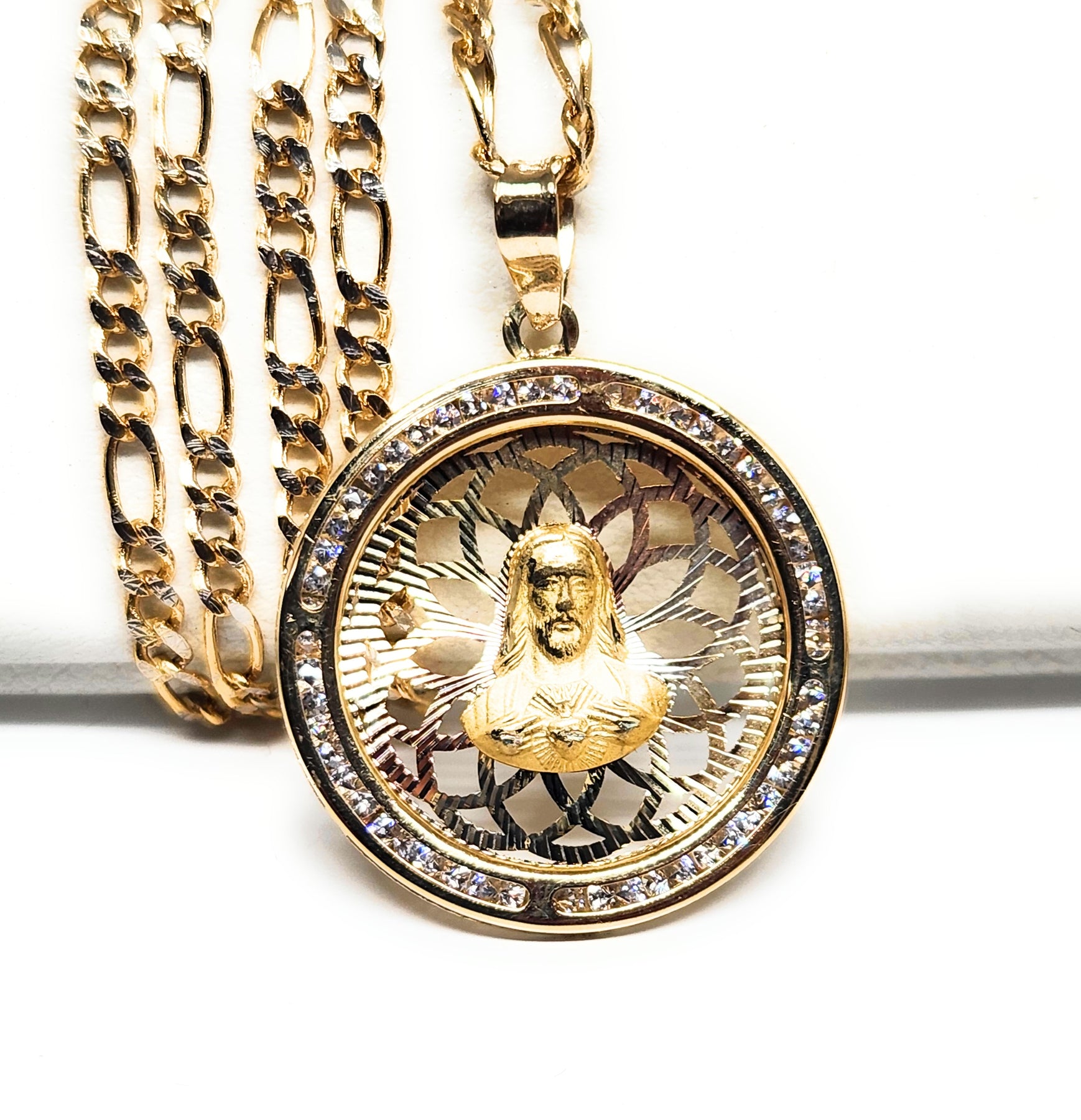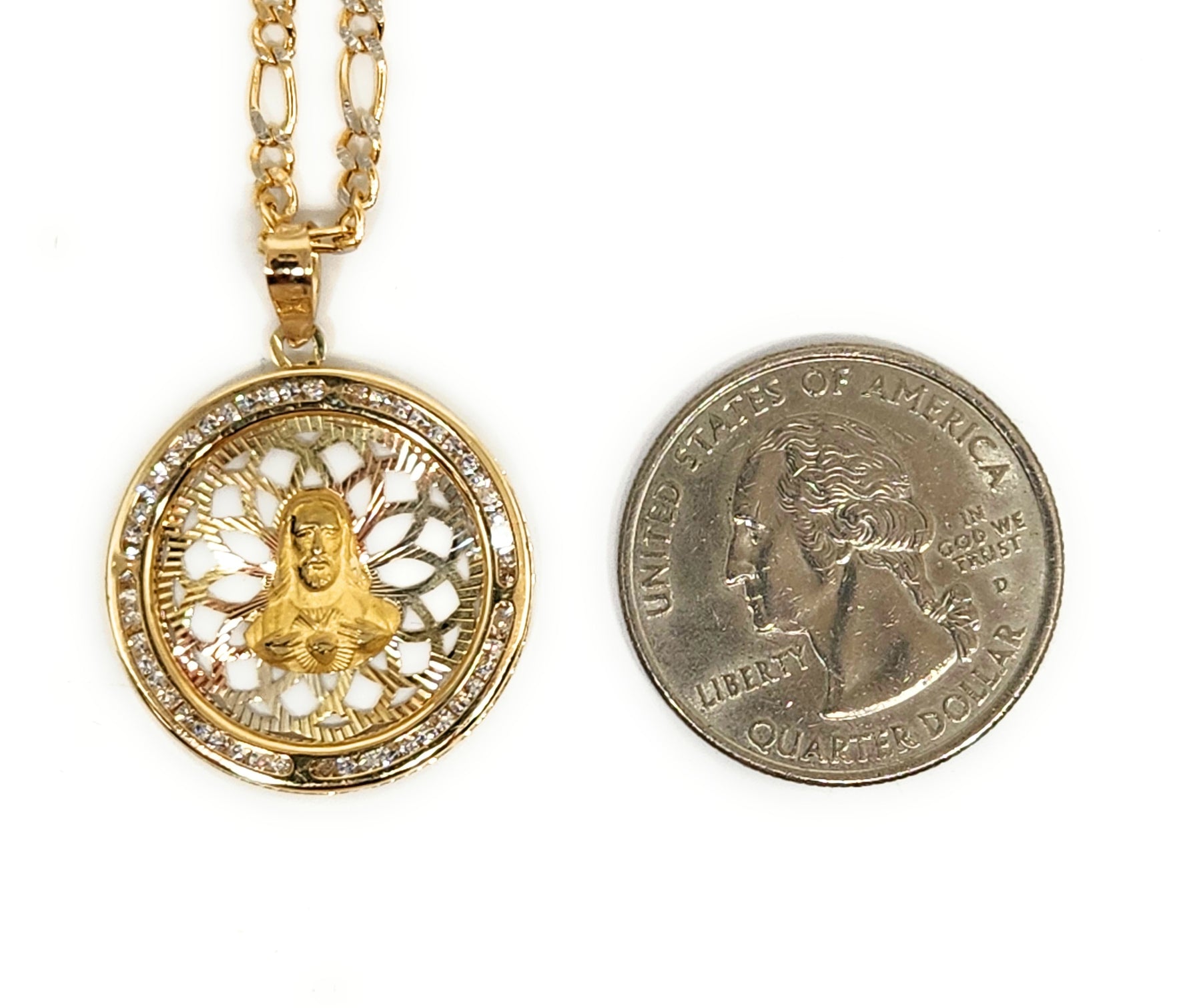 10k Solid Gold Jesus Sagrado Corazon CZ Pendant Necklace (MADE IN MX)
