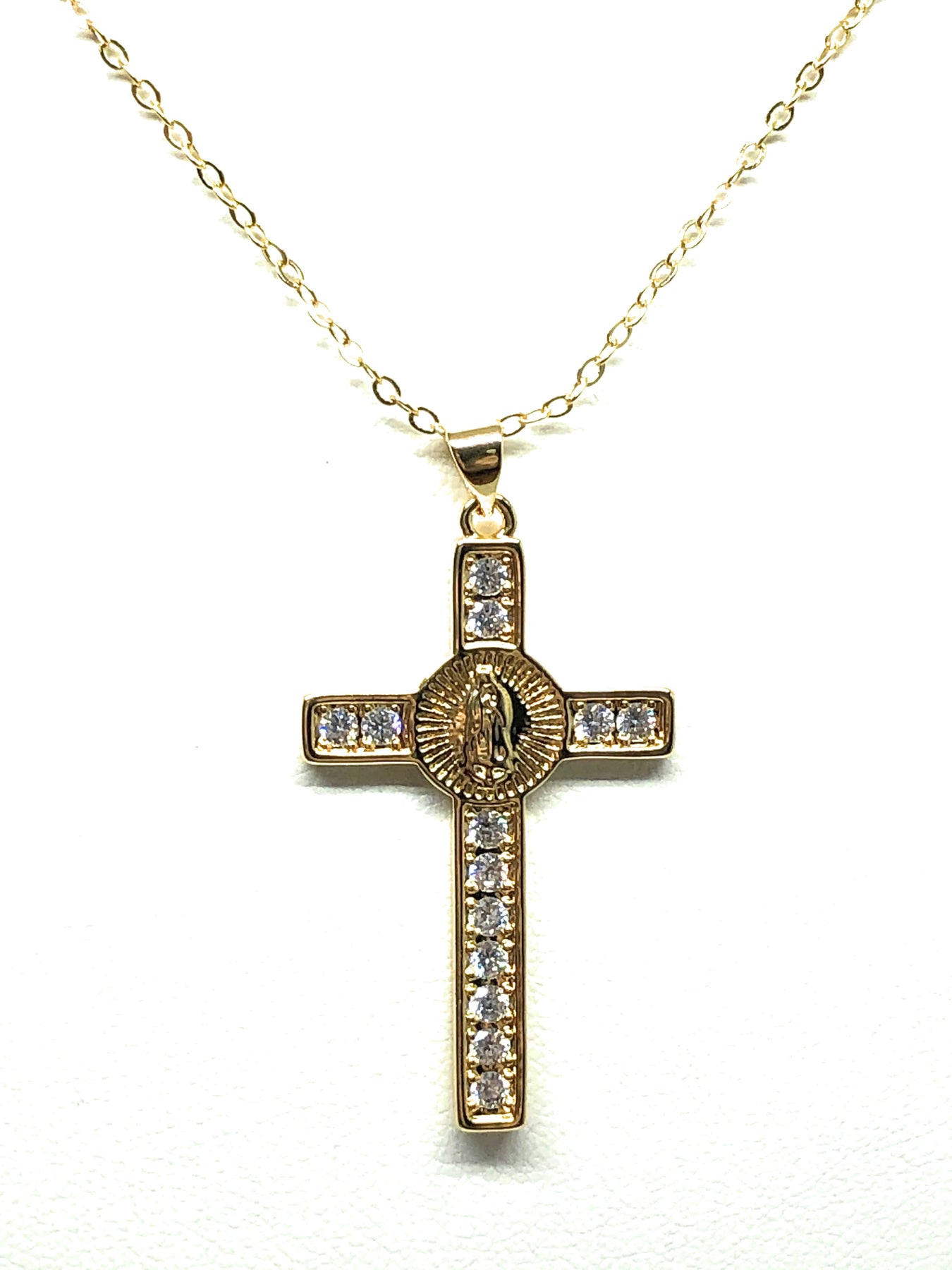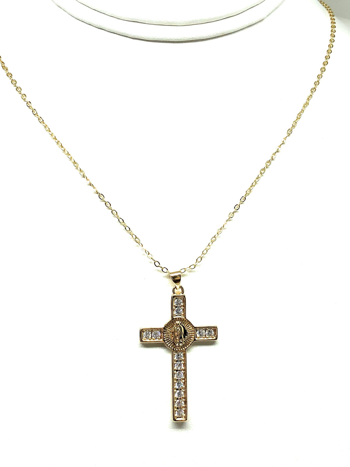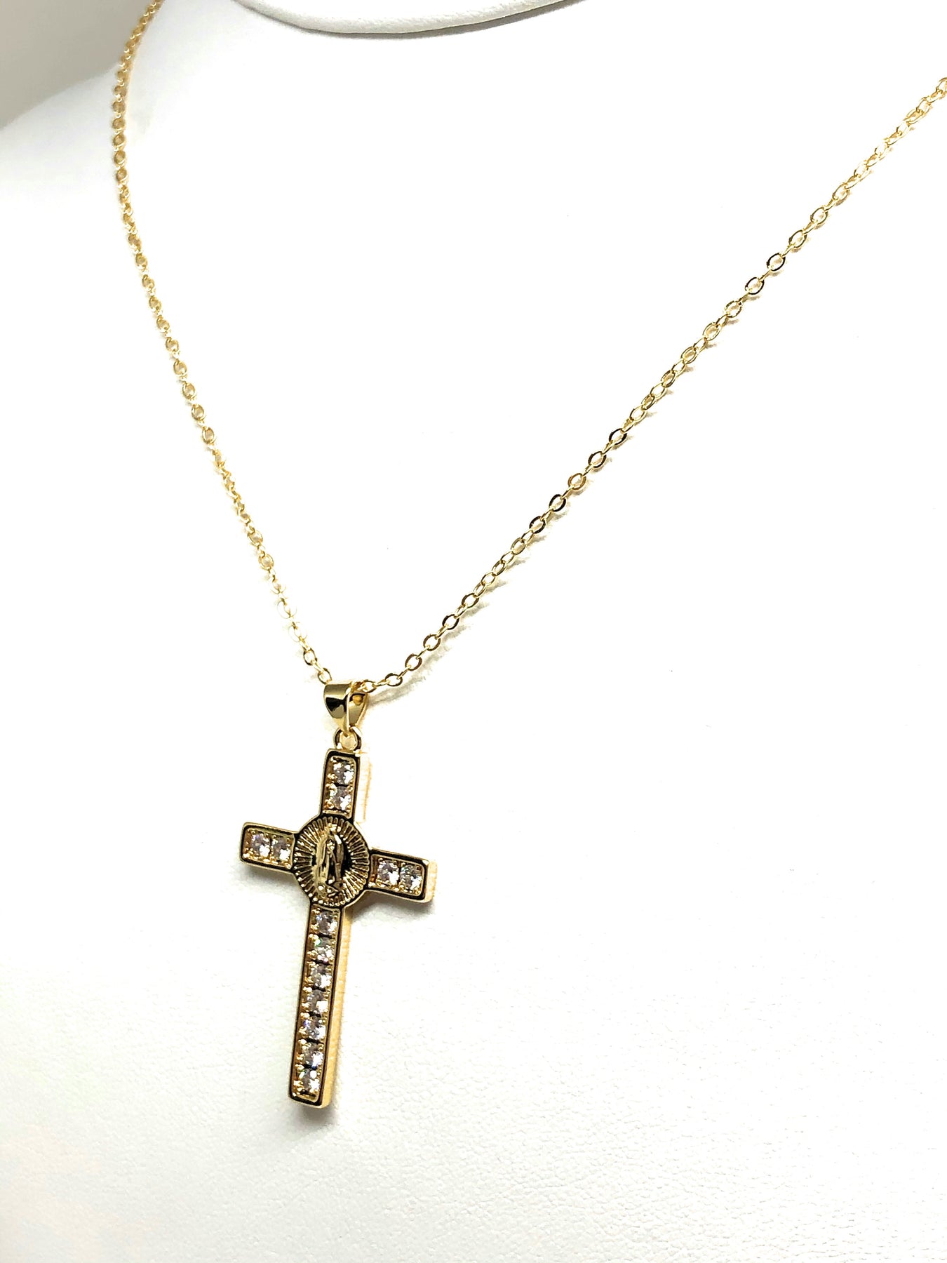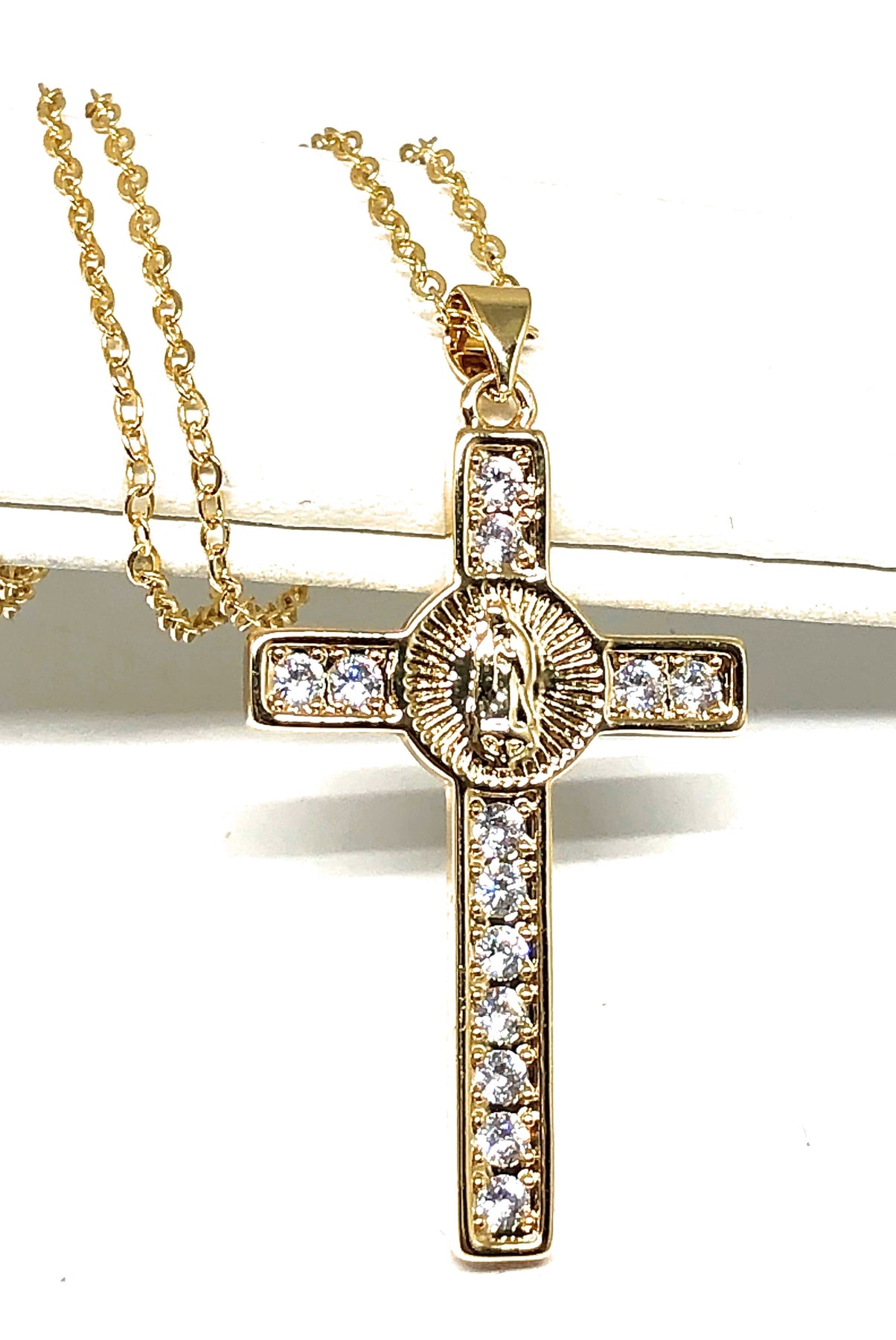 Gold Plated Cubic Zirconia Virgin Mary Cross 20” Chain Necklace Cruz