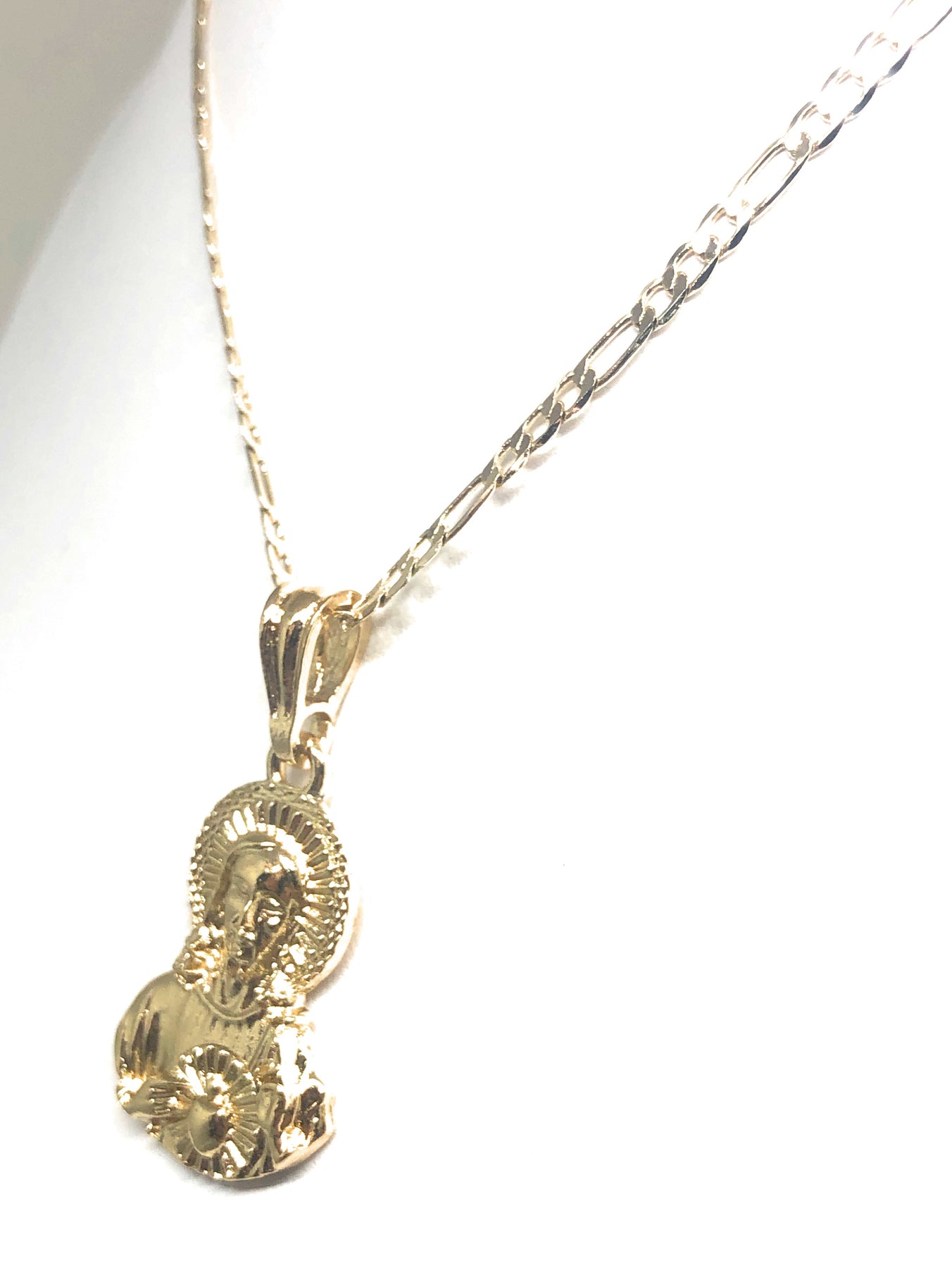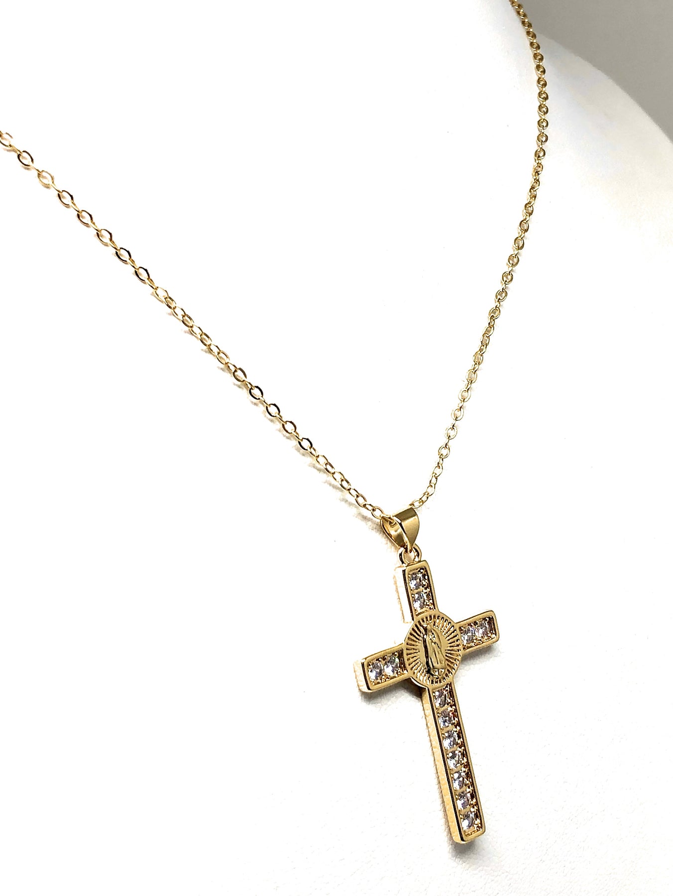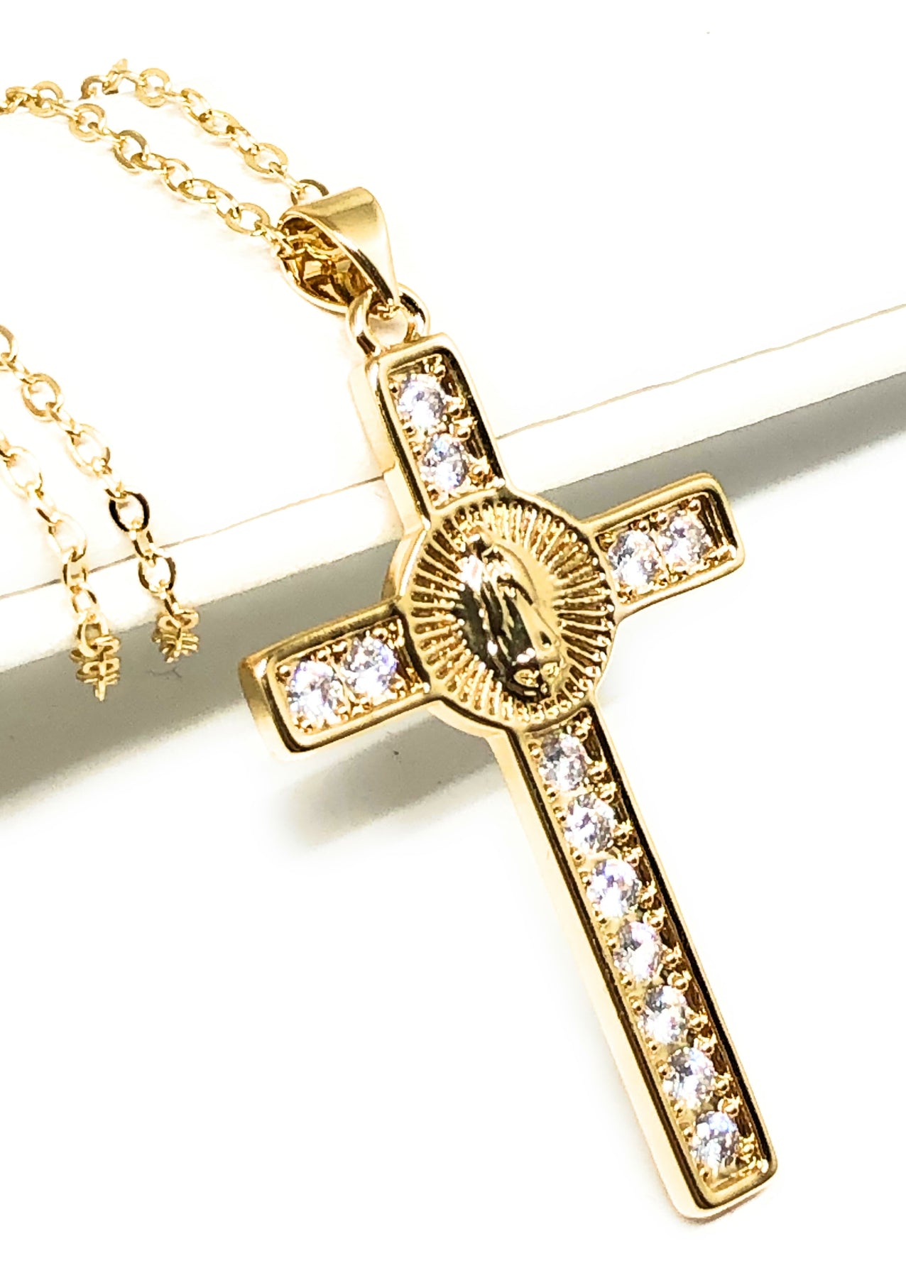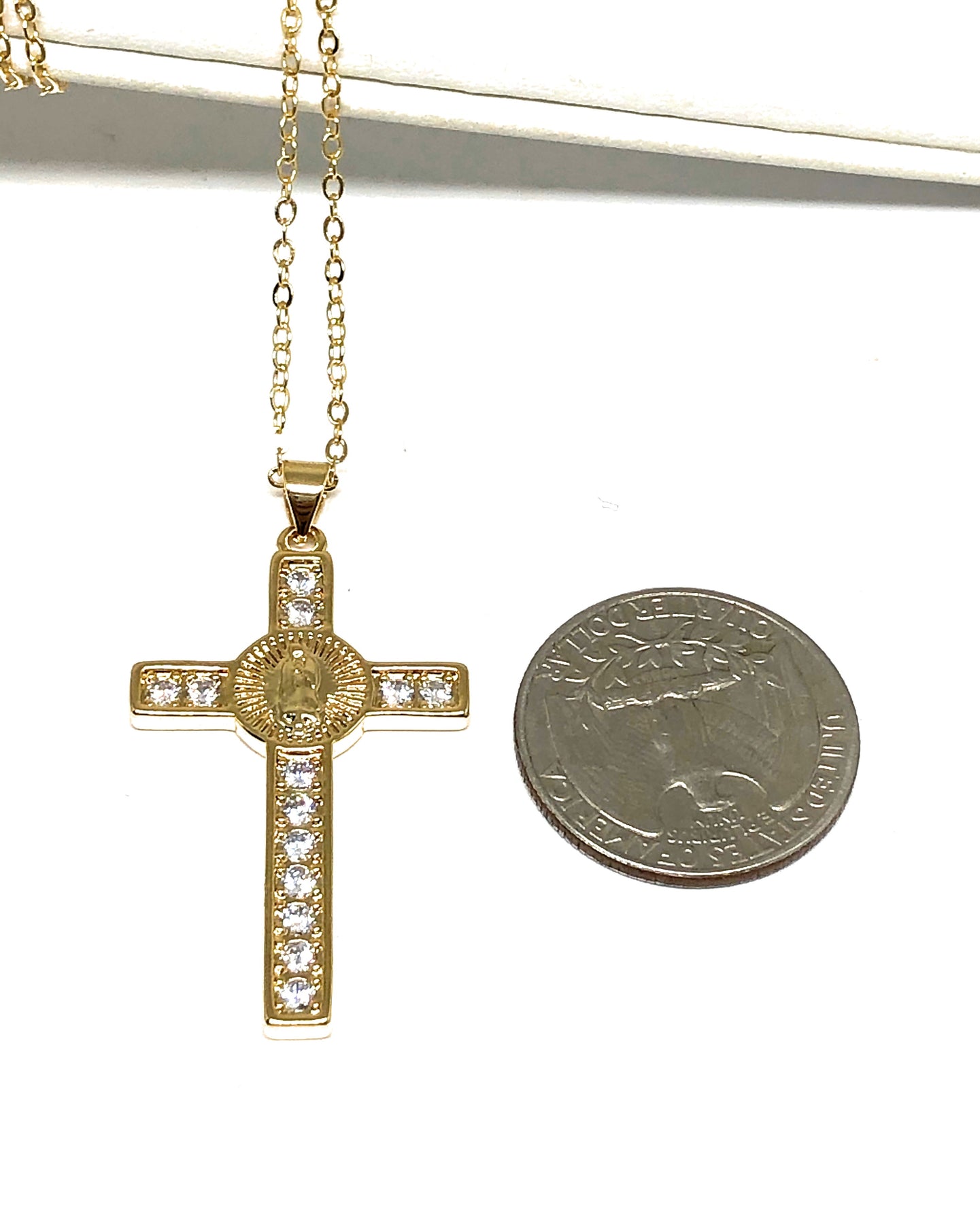 Gold Plated Cubic Zirconia Virgin Mary Cross 20” Chain Necklace Cruz