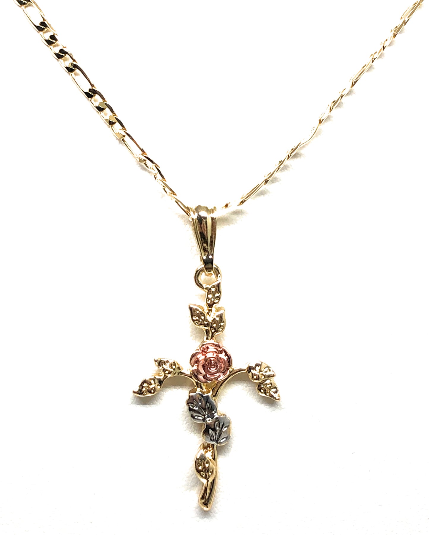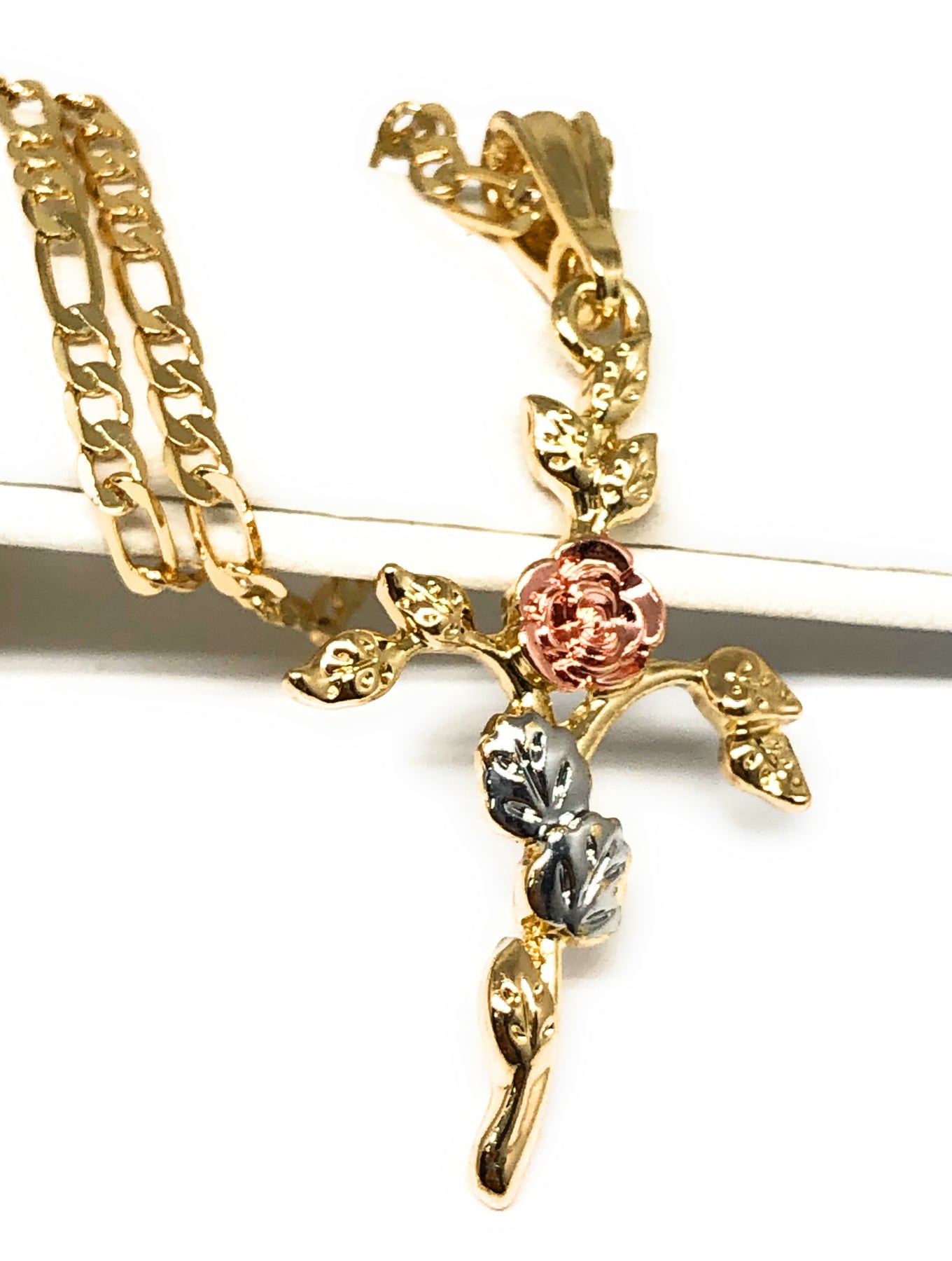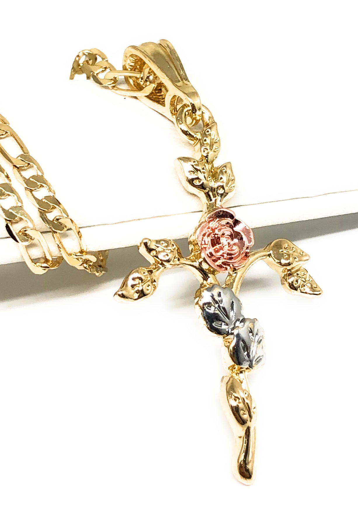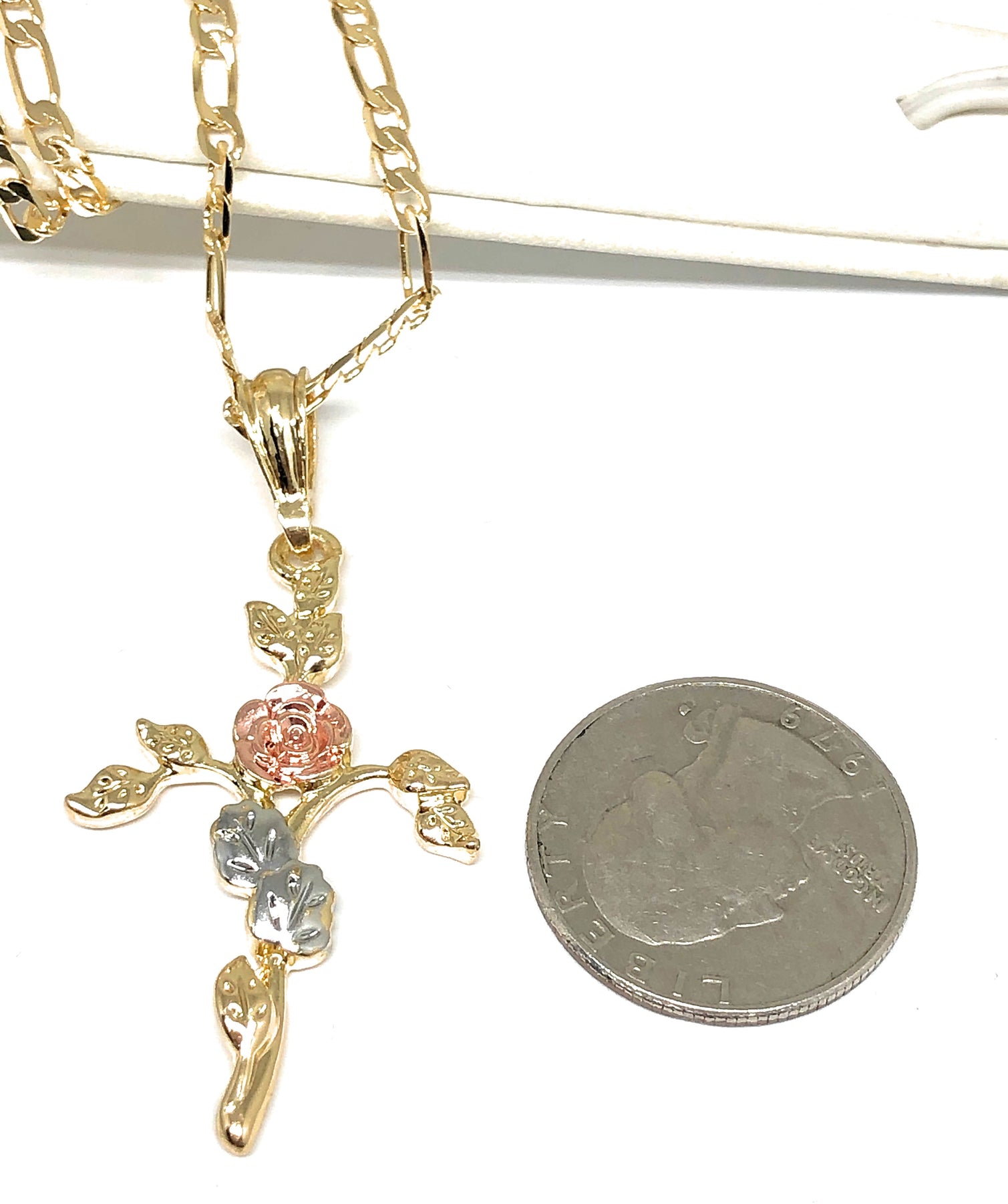 Gold Plated Tri-Color Rose Cross Crucifix 24" Chain Cruz Crucifijo