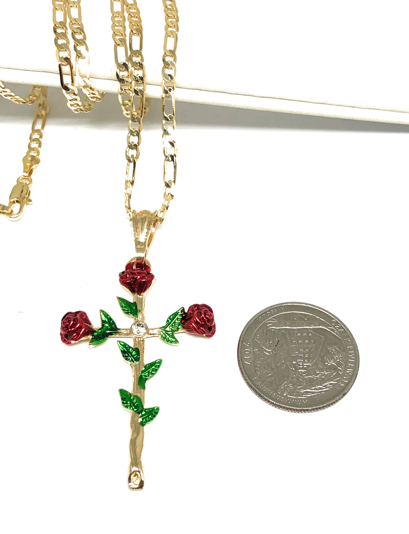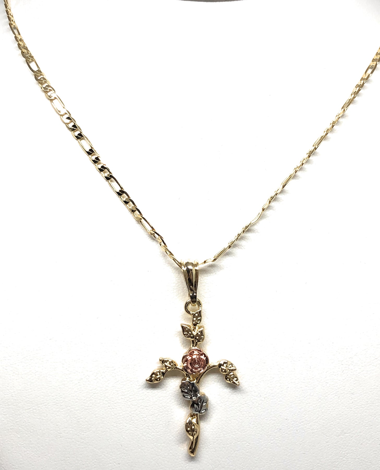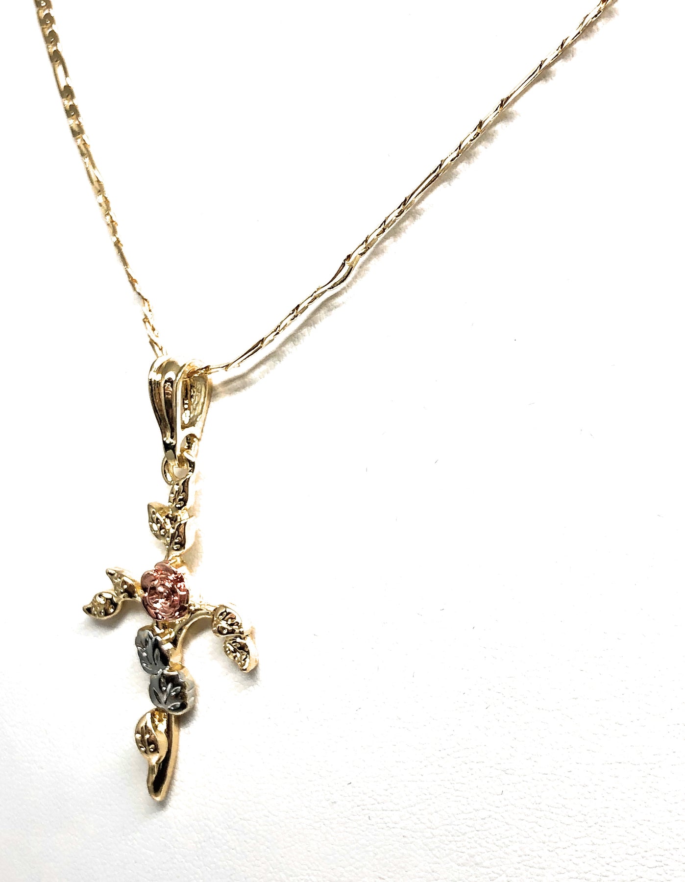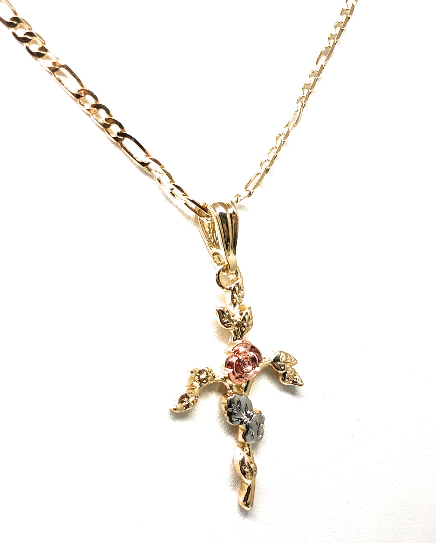 Gold Plated Tri-Color Rose Cross Crucifix 24" Chain Cruz Crucifijo