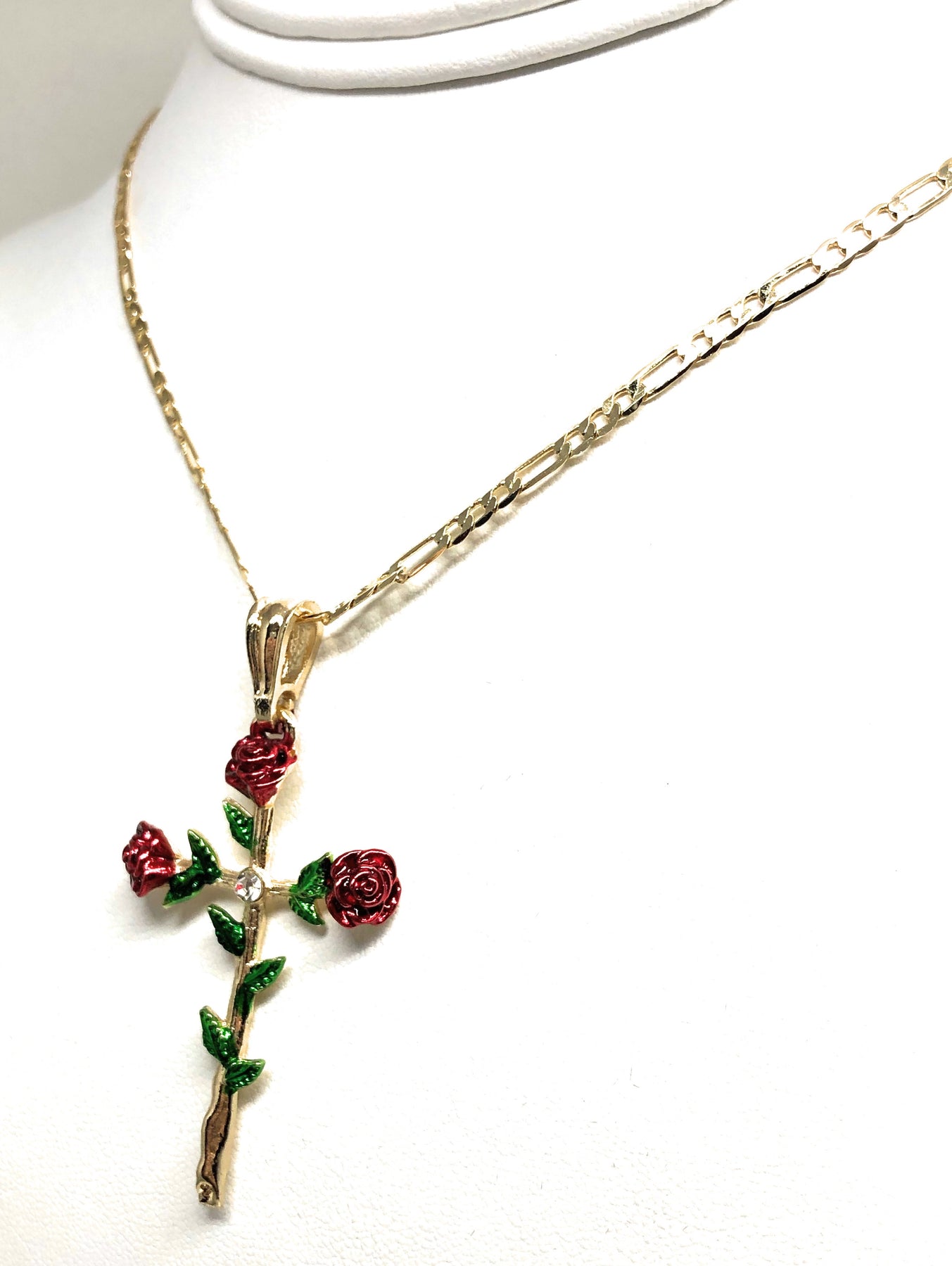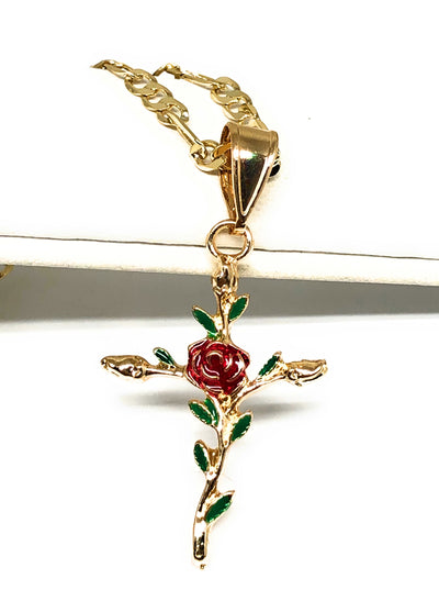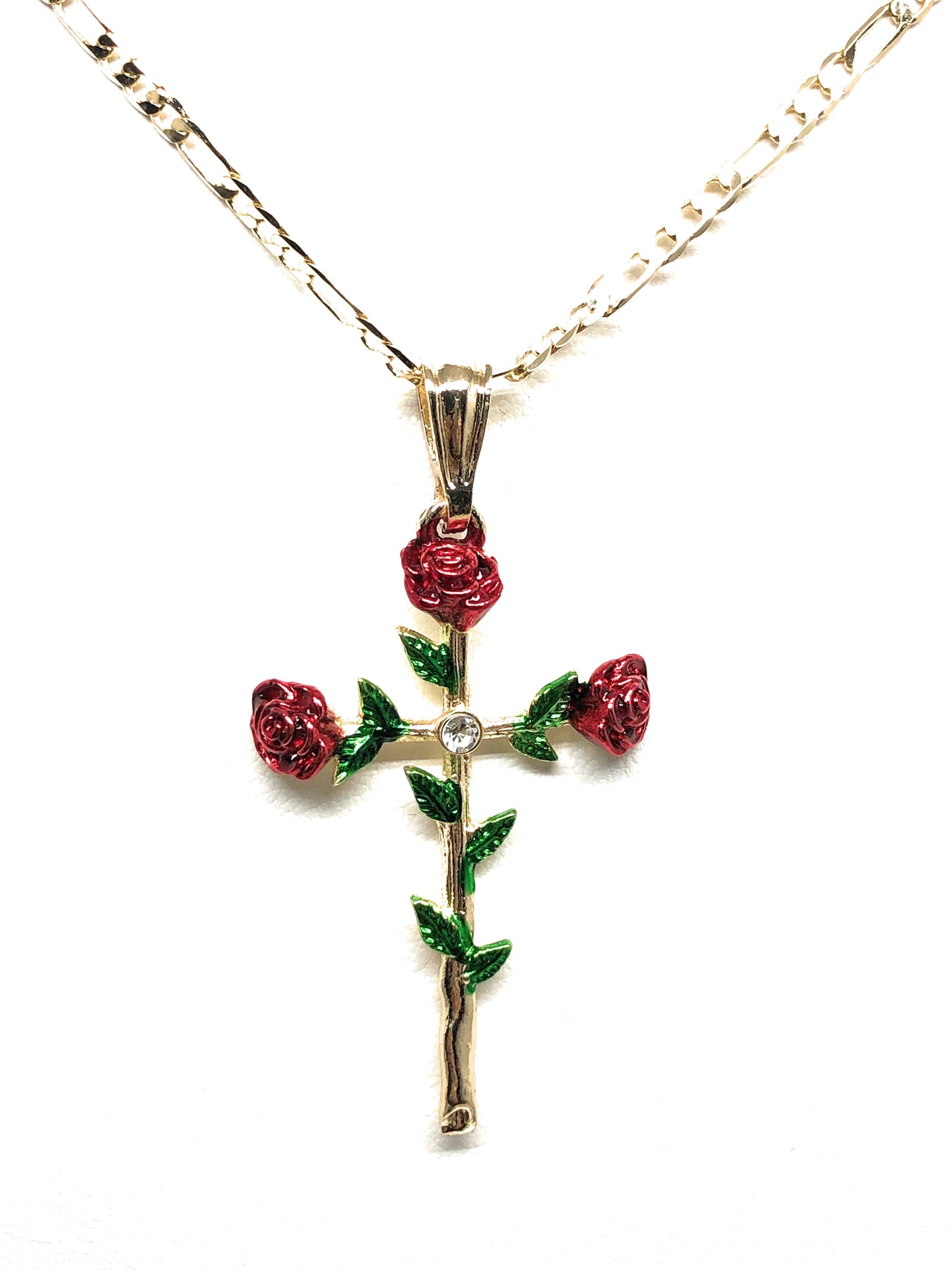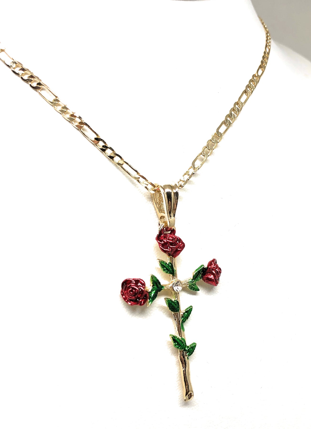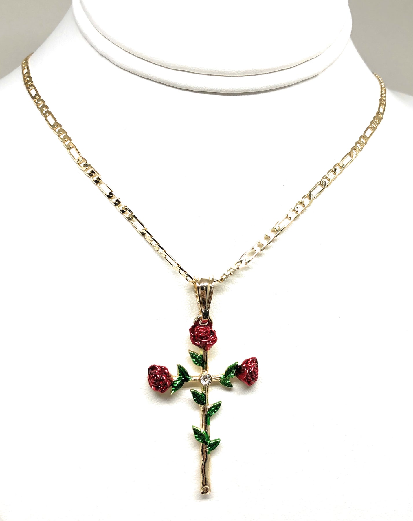 Gold Plated Tri-Color Rose Cross Crucifix 24" Chain Cruz Crucifijo