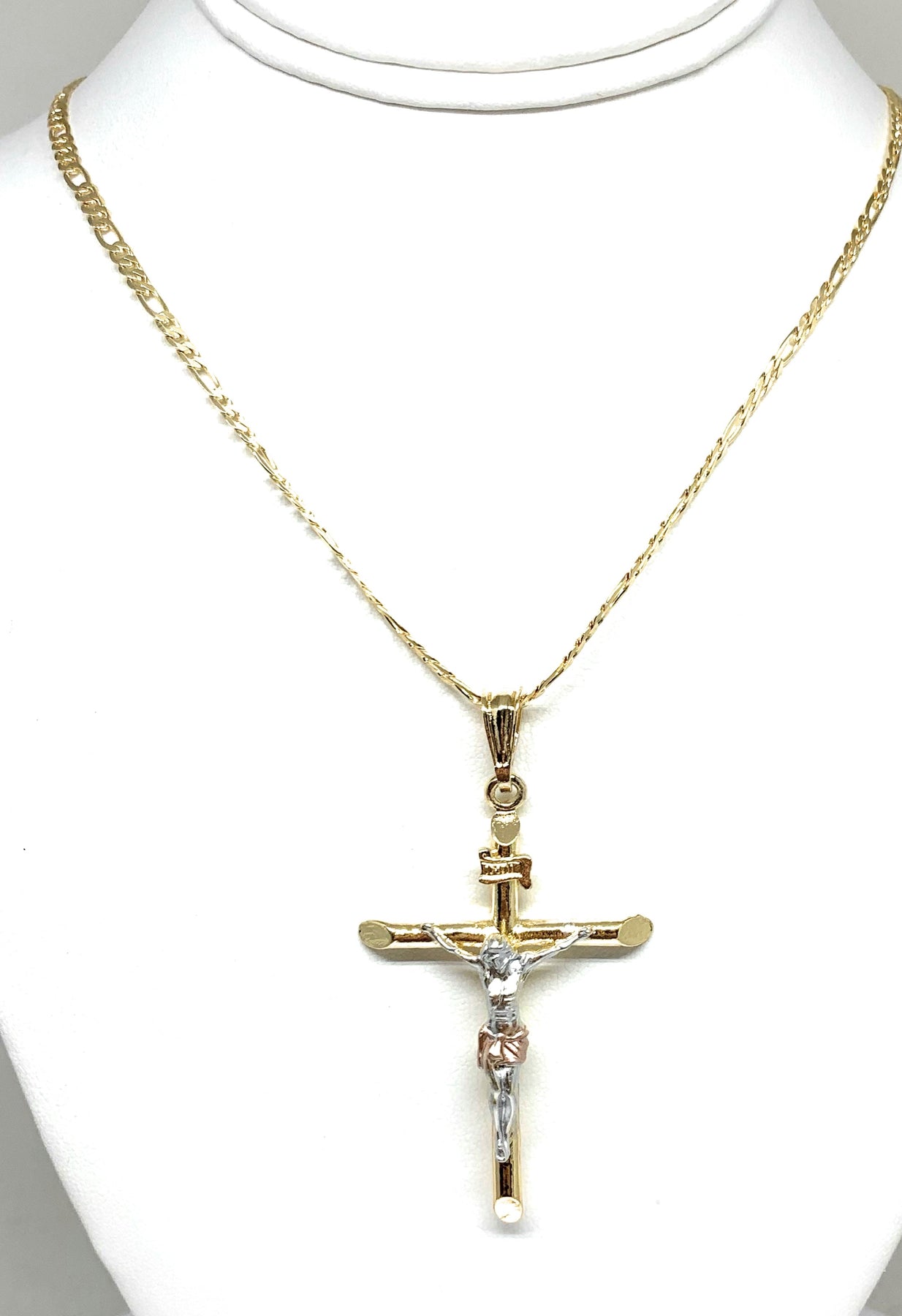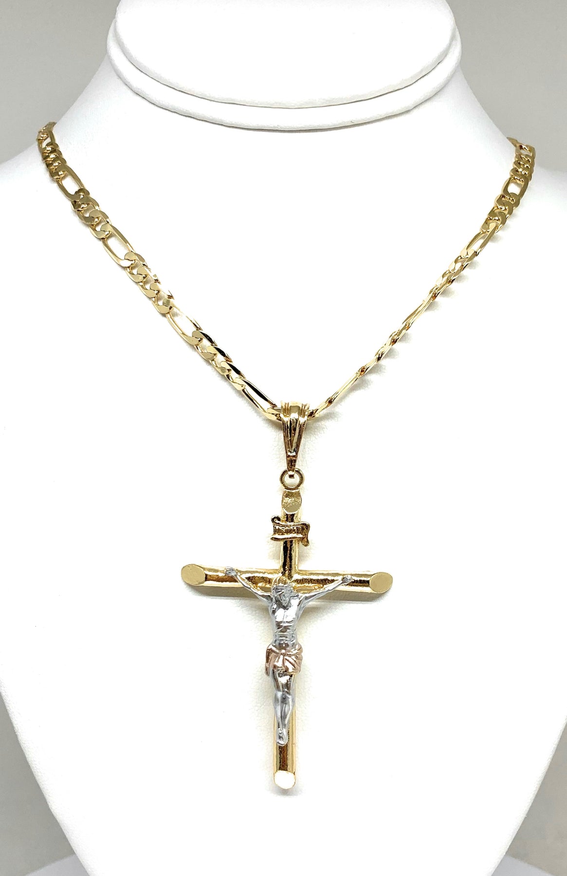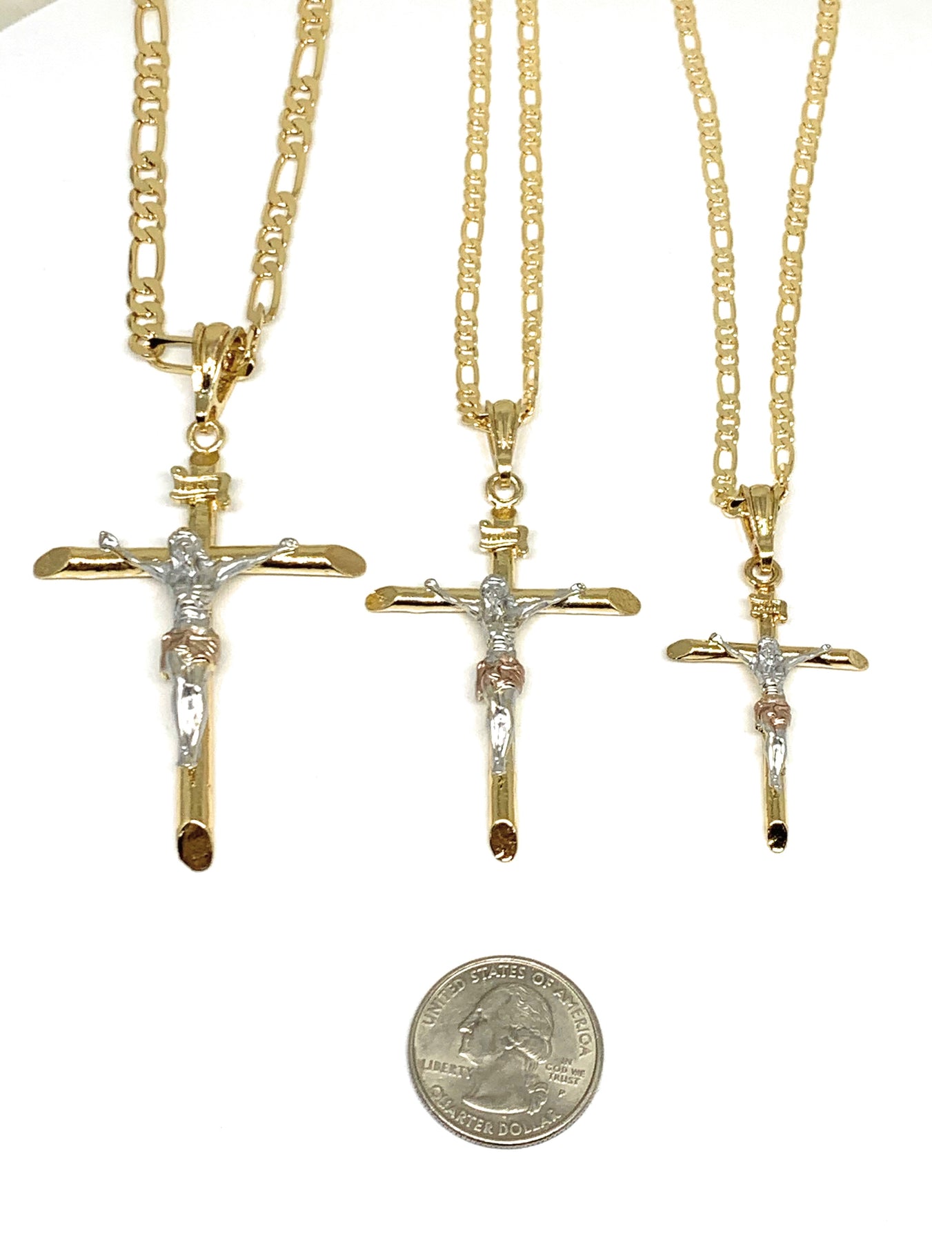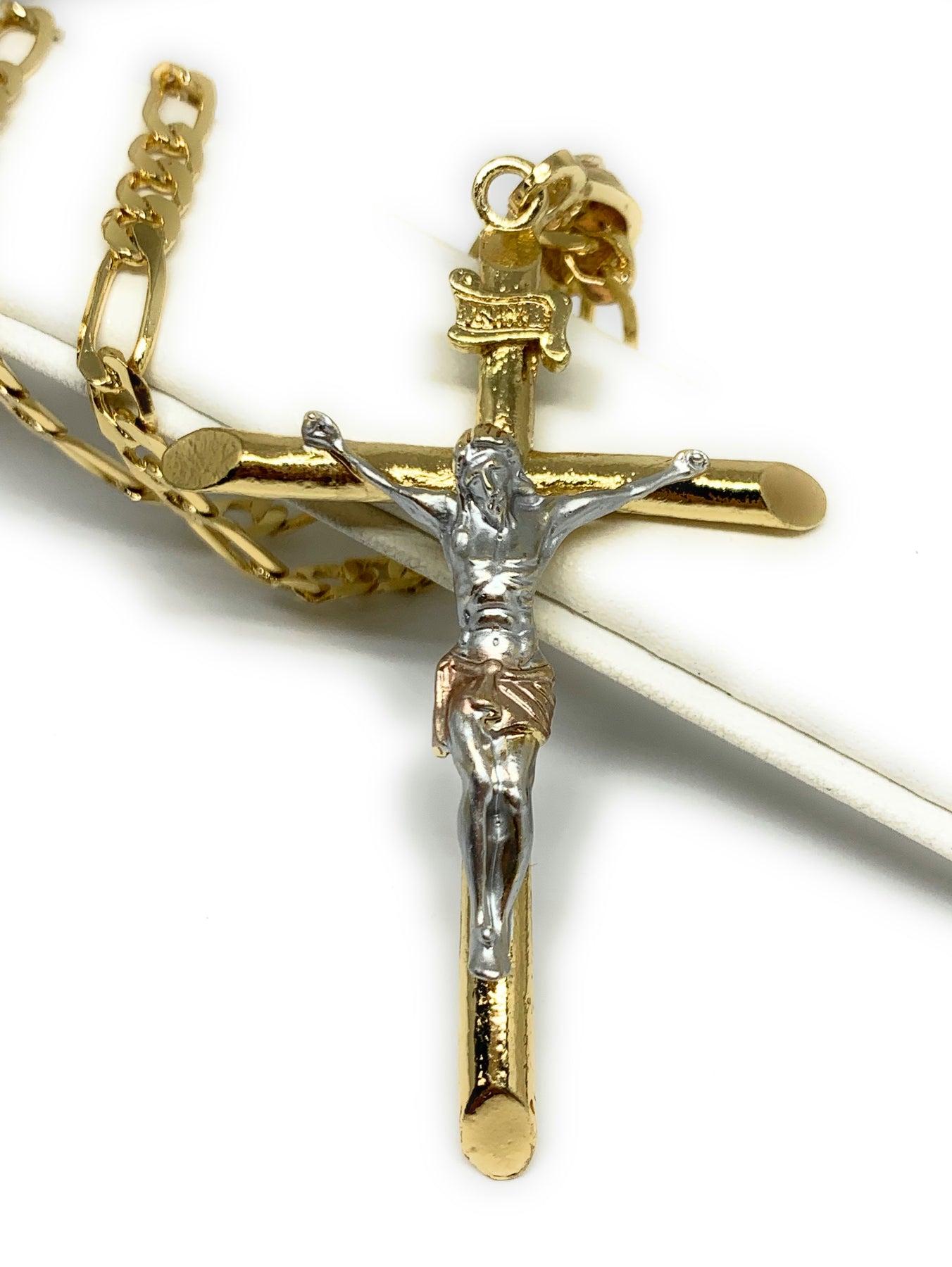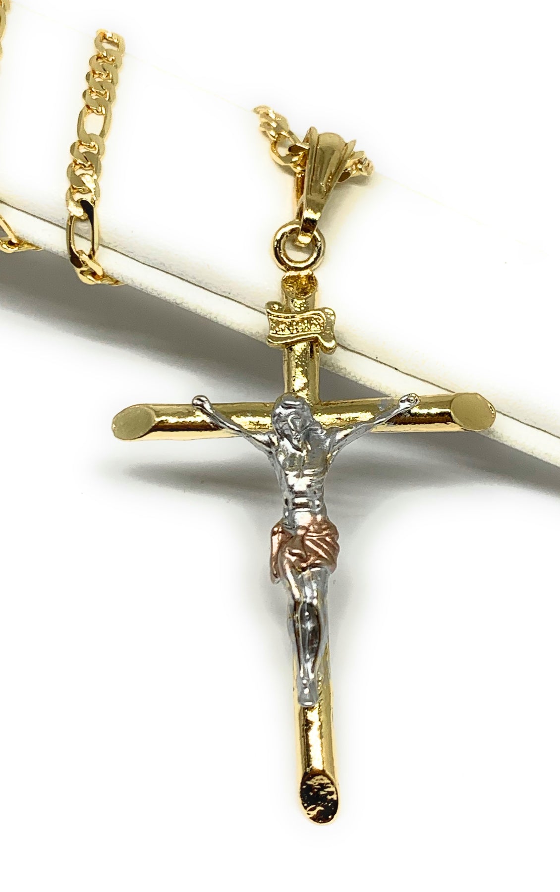 Gold Plated Tri-Color Classic INRI Cross Jesus Crucifix 24" Chain Cruz Crucifijo (SM,MED,LG)