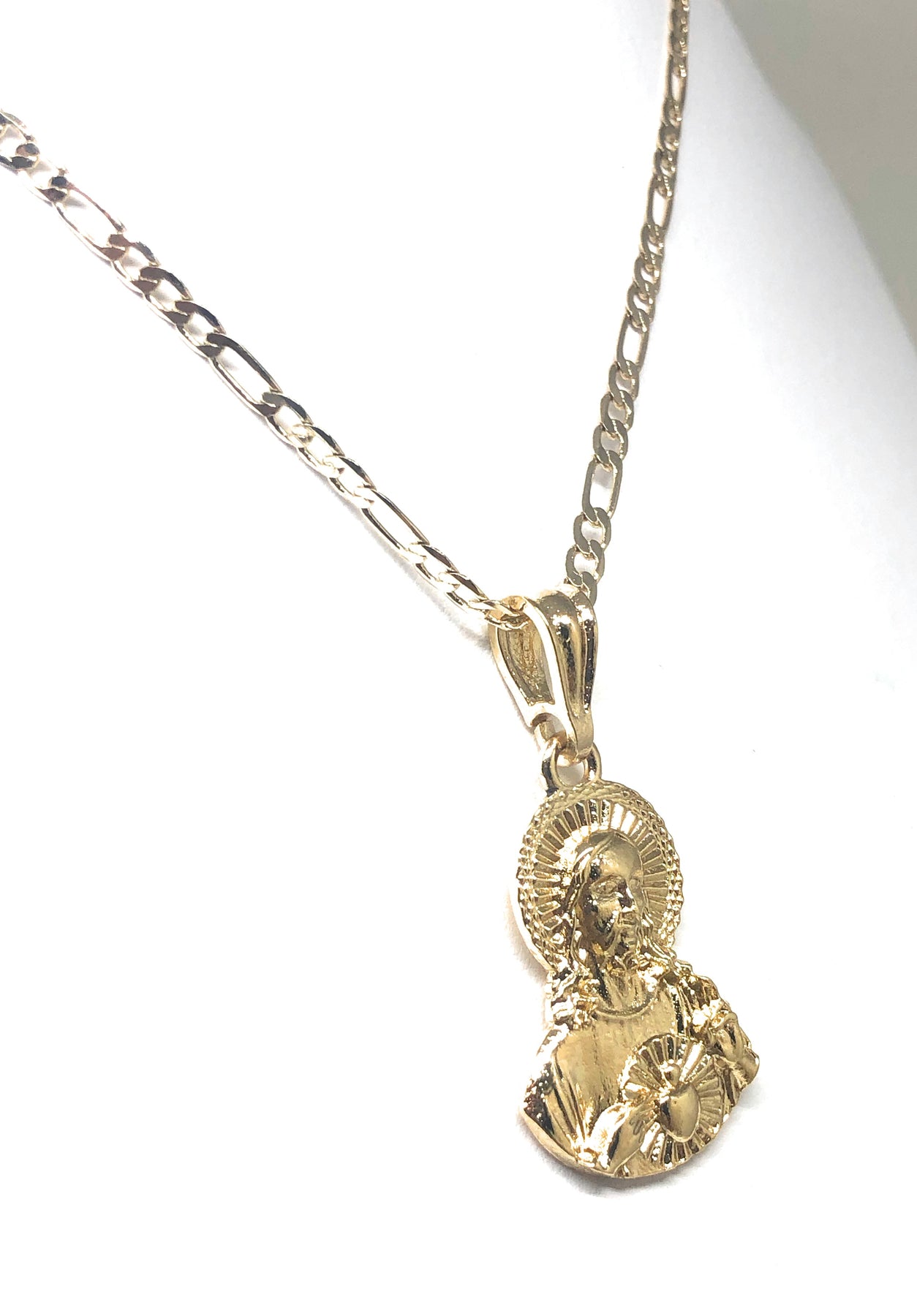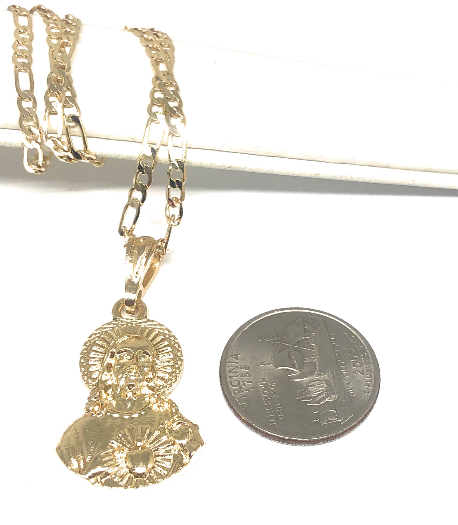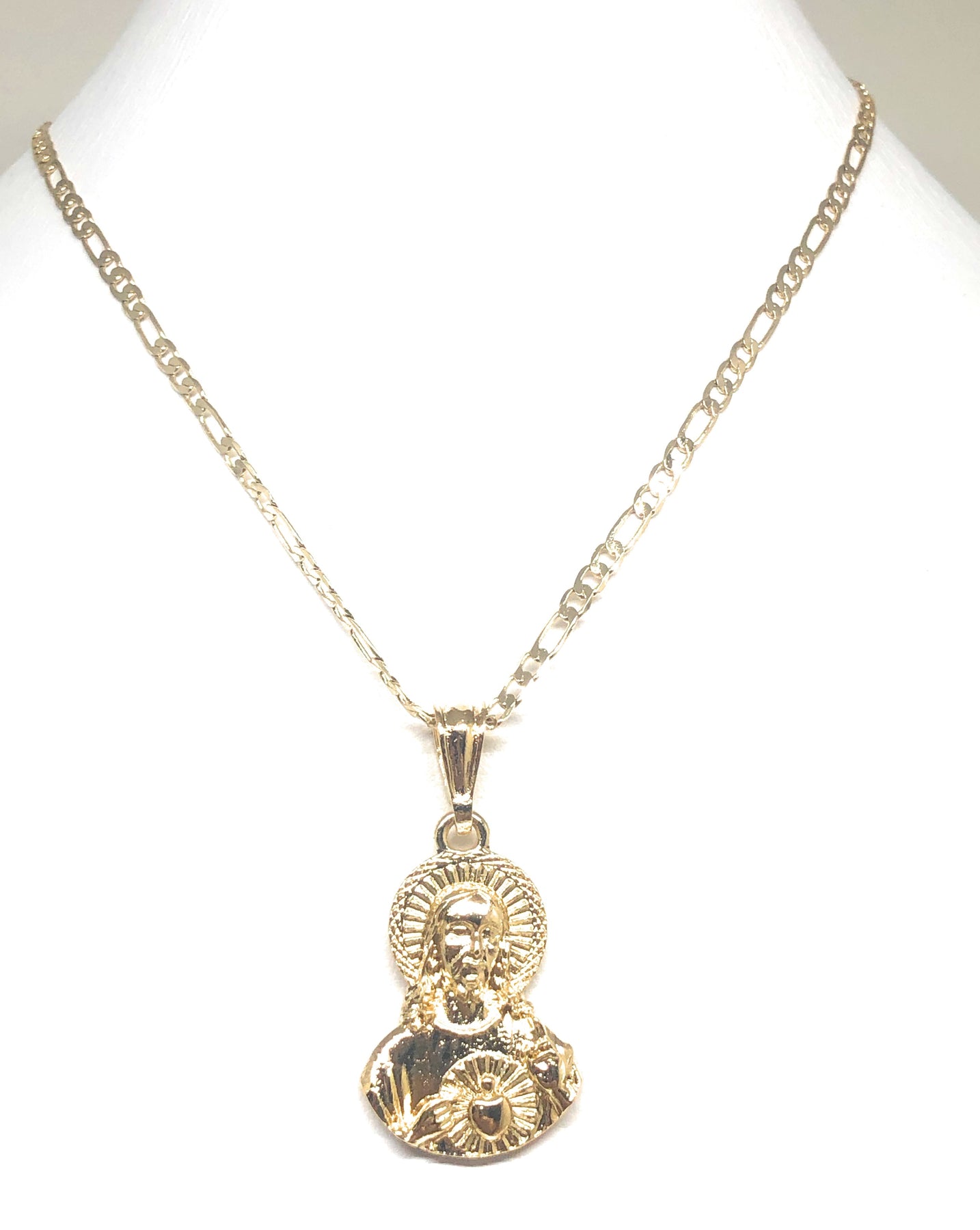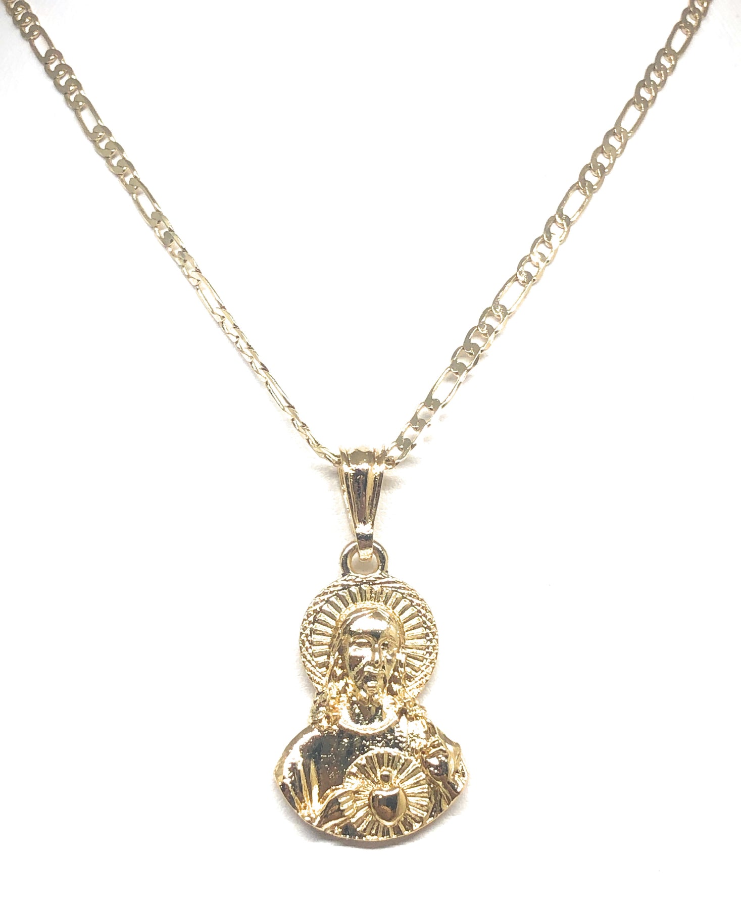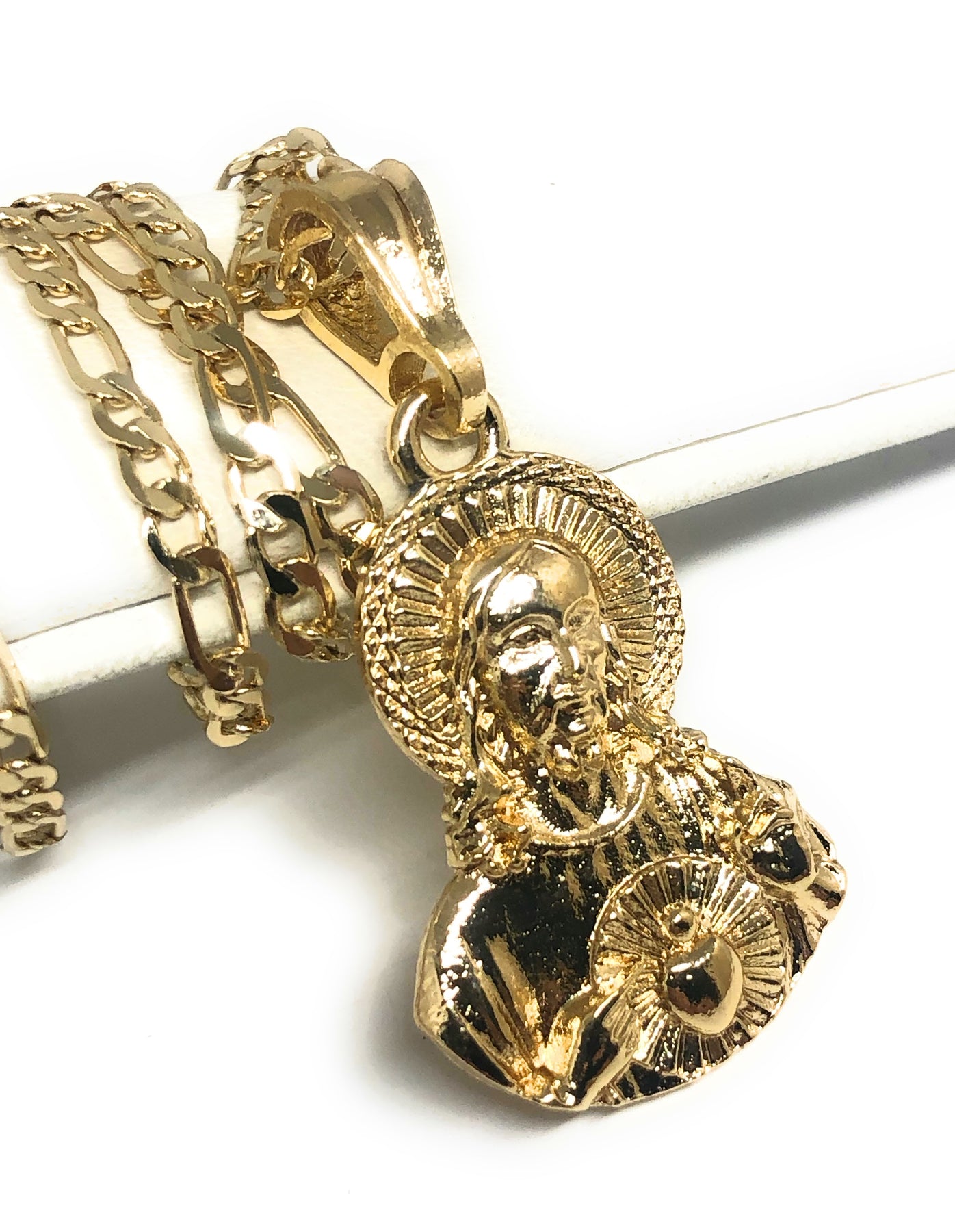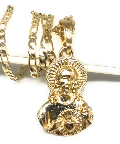 Gold Plated Jesus Sagrado Corazon Image Depiction Pendant 24" Figaro Chain