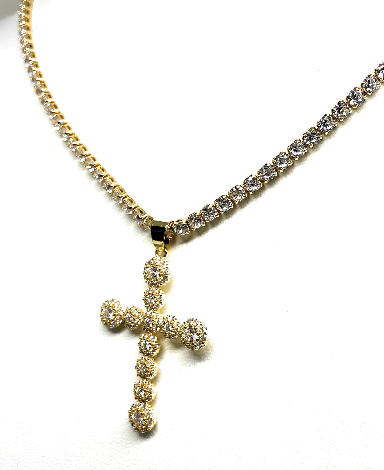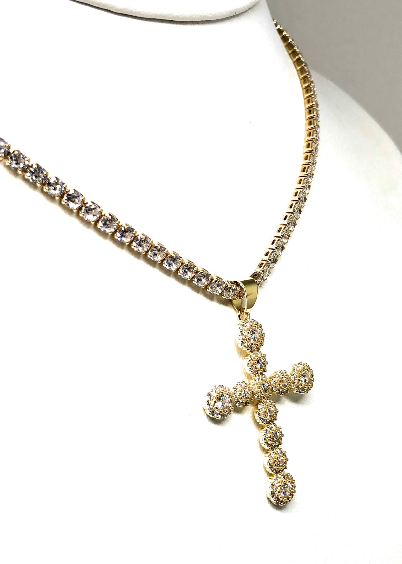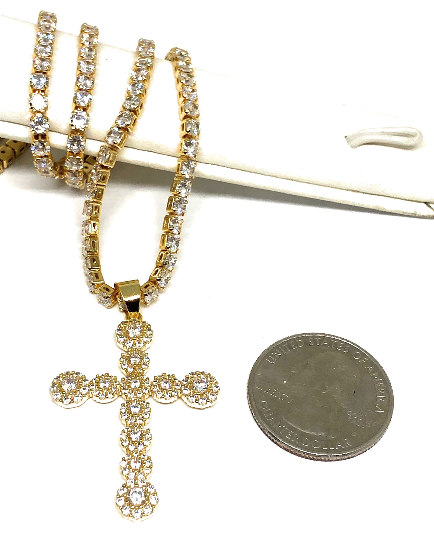 Gold Plated Full Cubic Zirconia Cross 20” Tennis CZ Chain Necklace Cruz