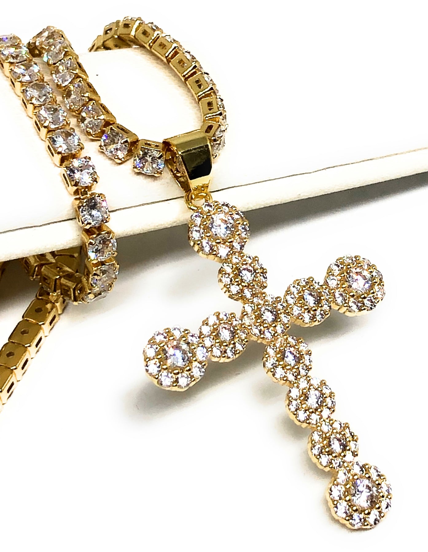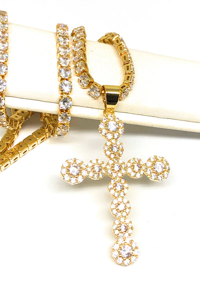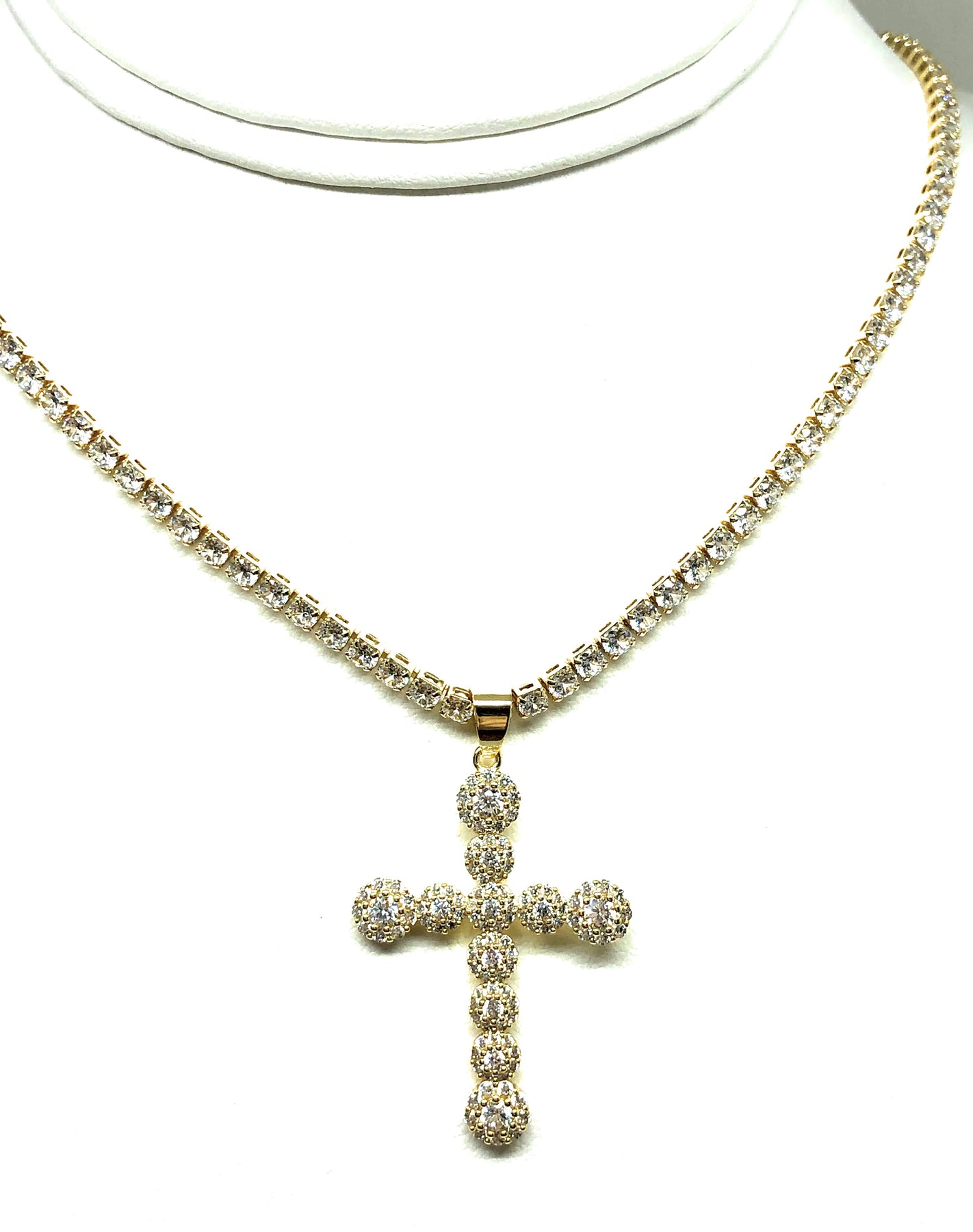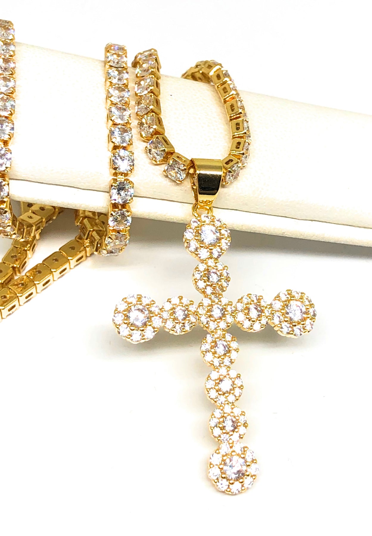Gold Plated Full Cubic Zirconia Cross 20” Tennis CZ Chain Necklace Cruz