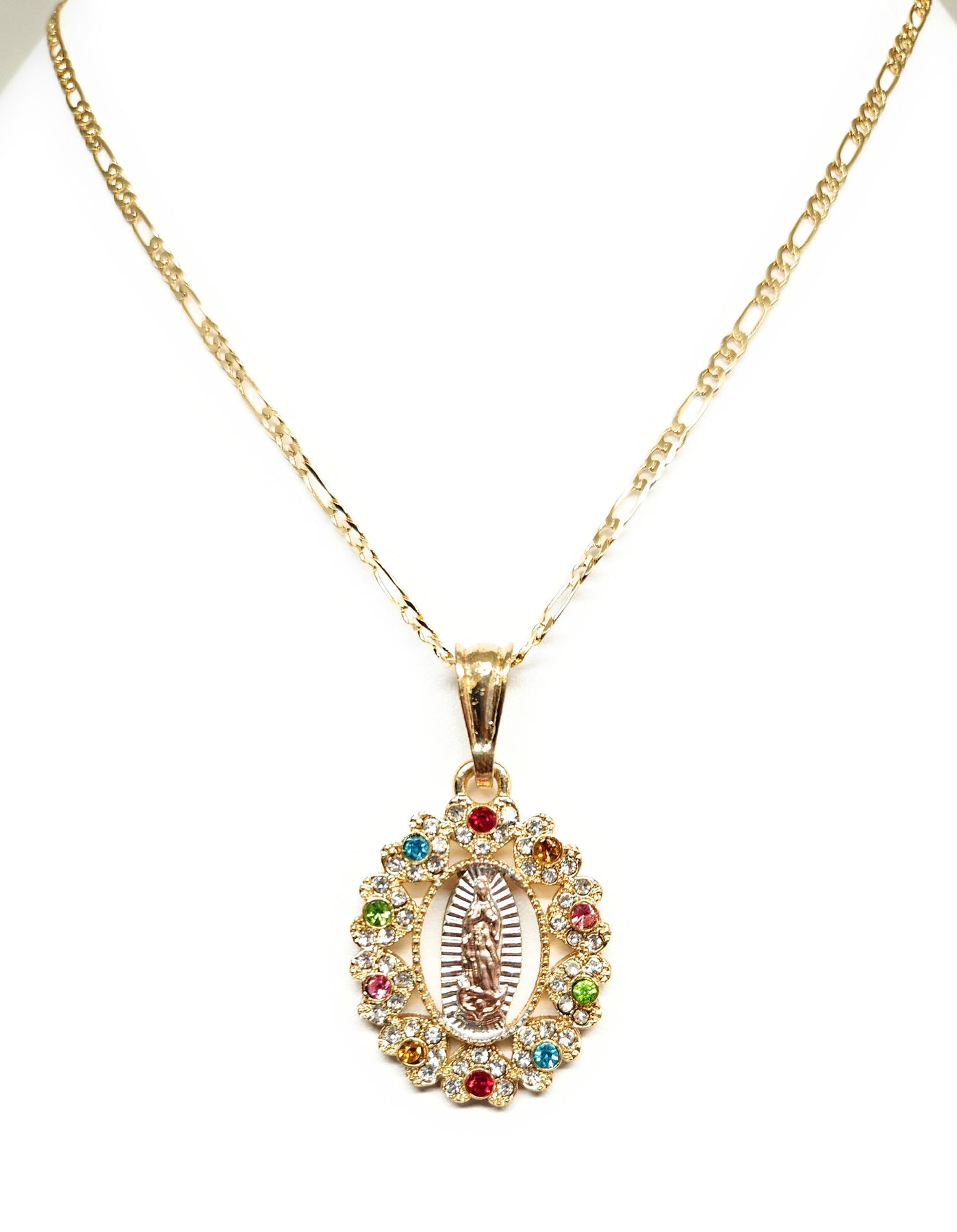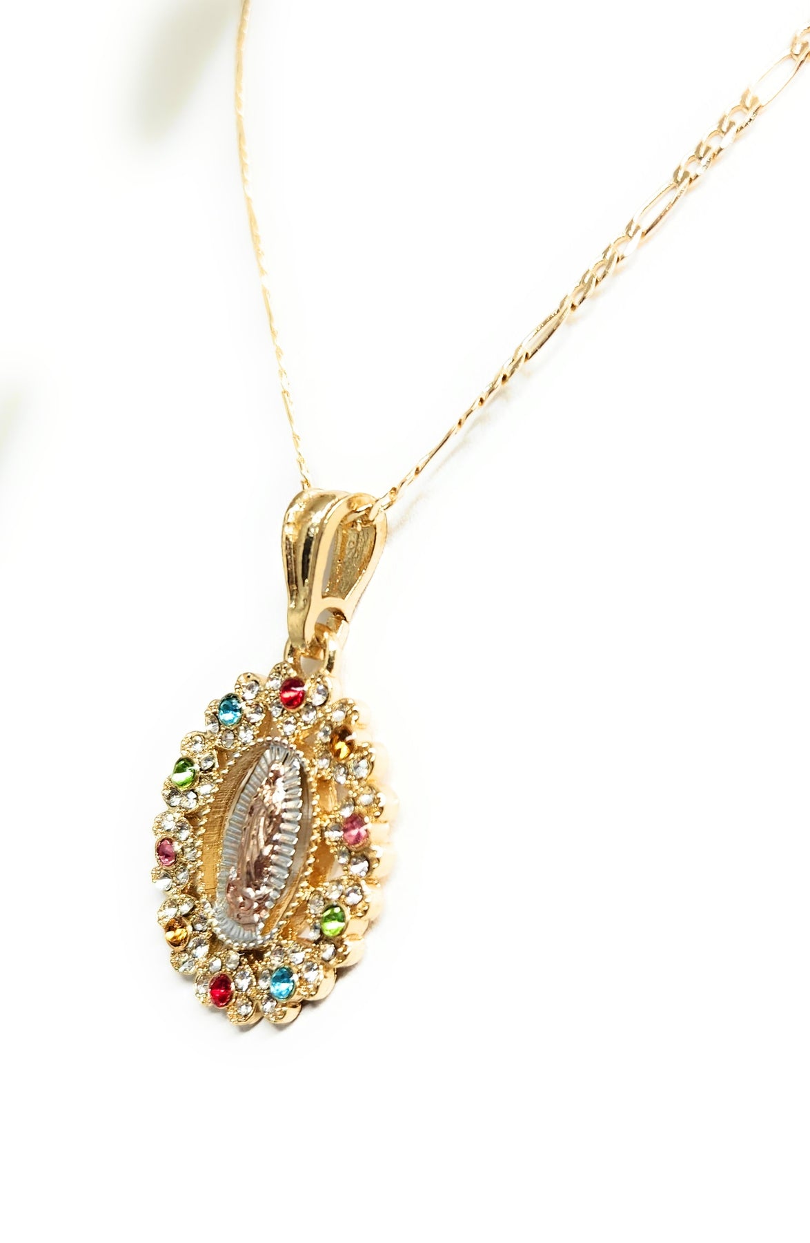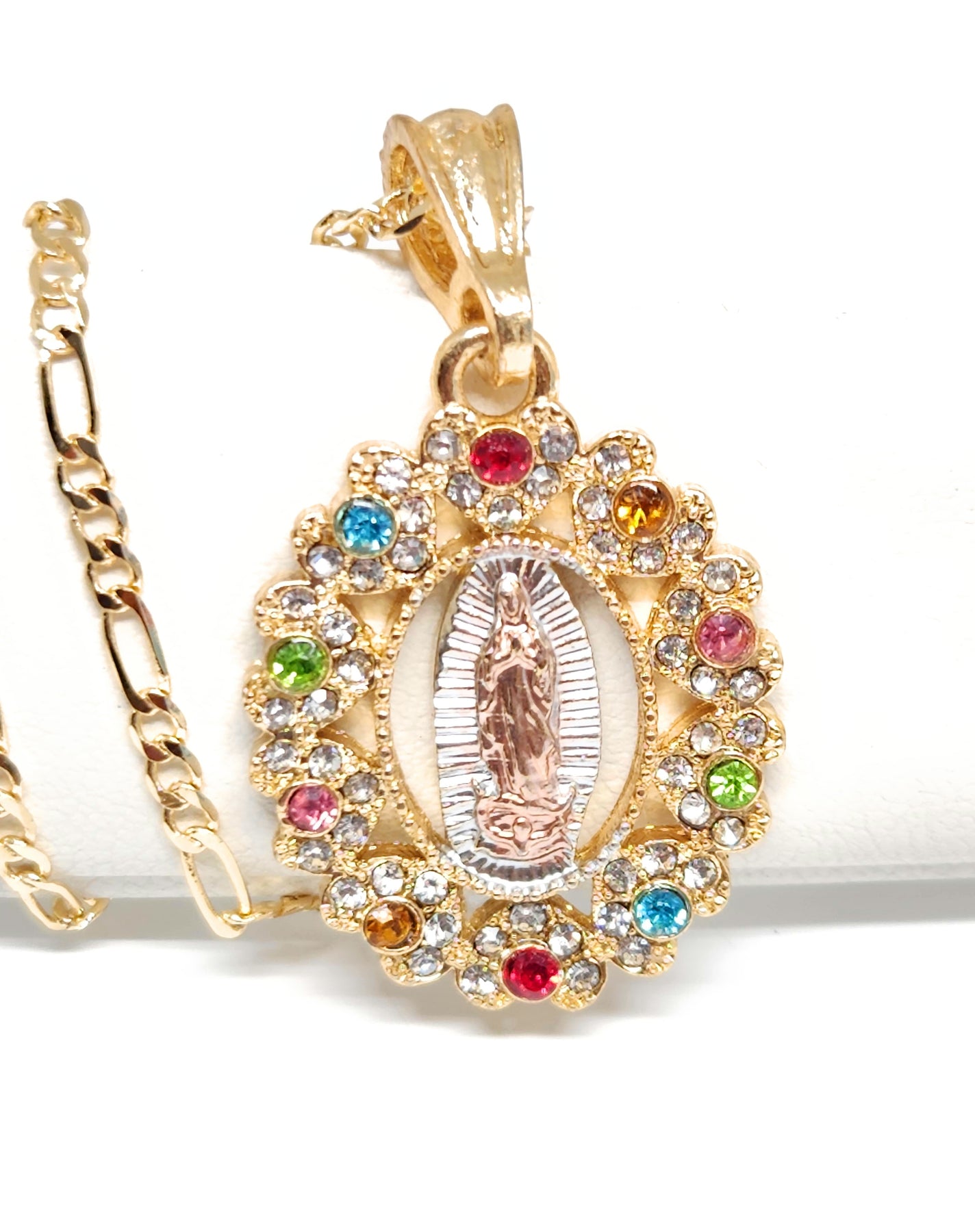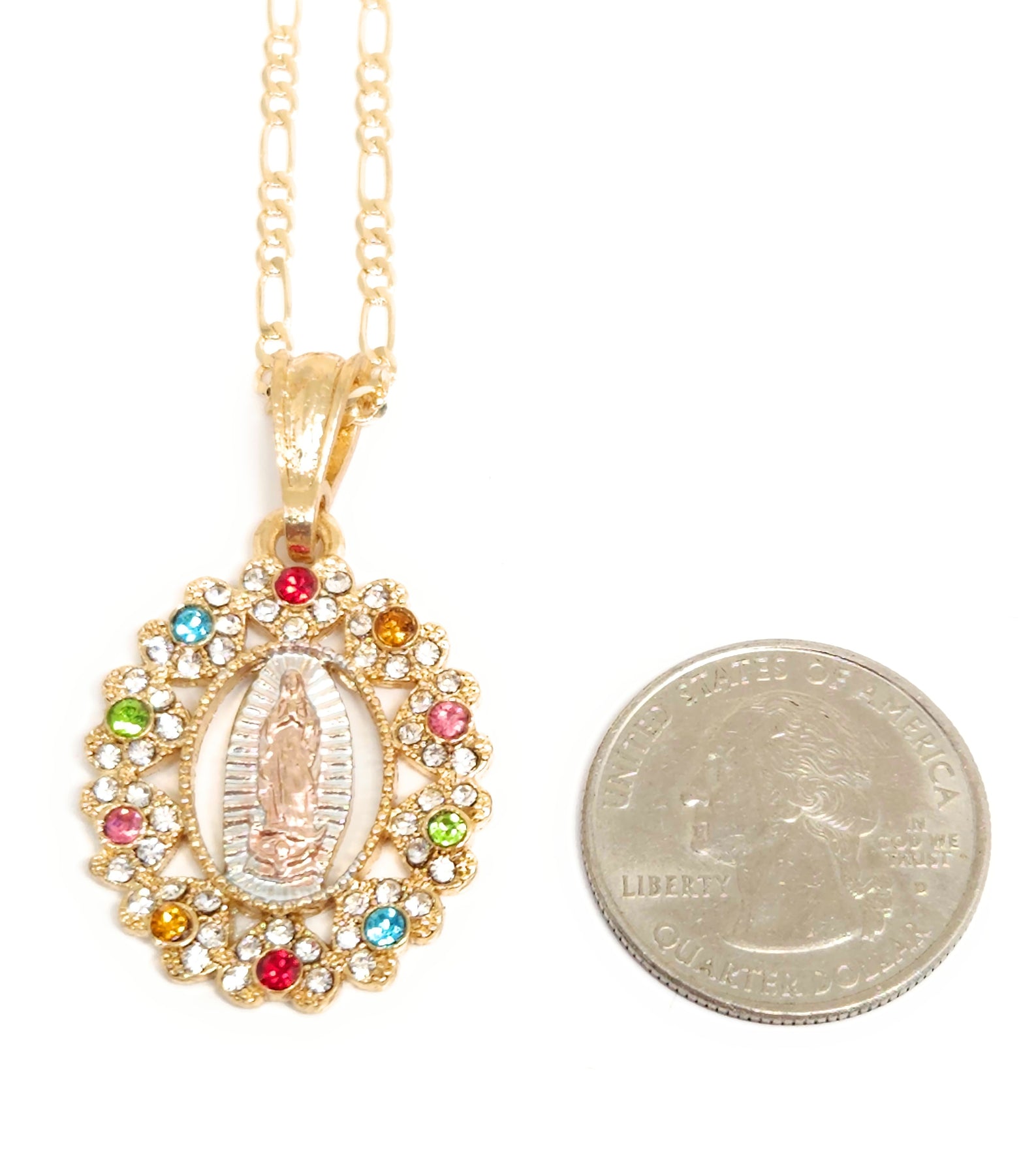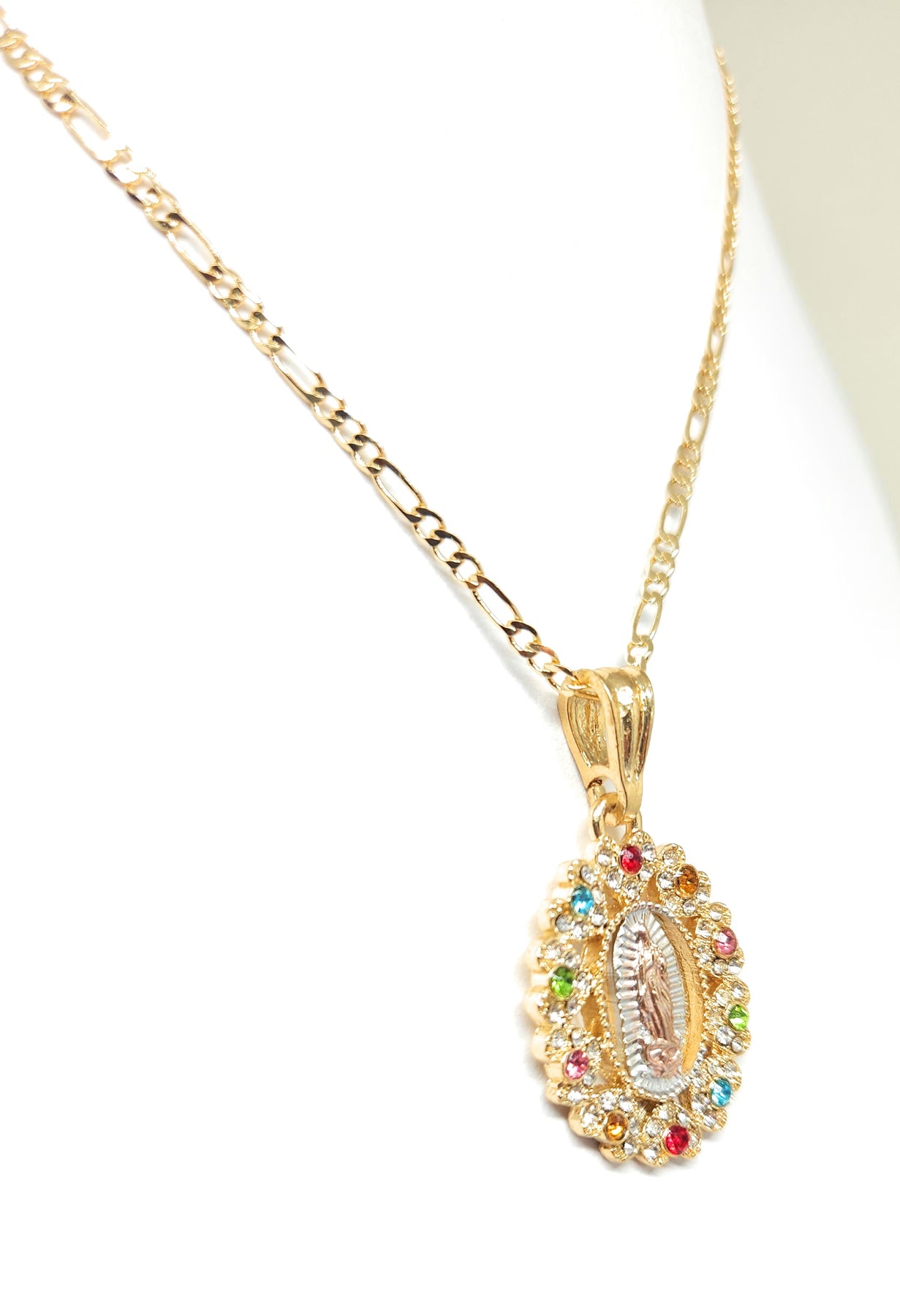 Gold Plated Tri-Color Virgin Mary CZ Pendant Necklace 24" Virgen de Guadalupe Medalla Tres Colores