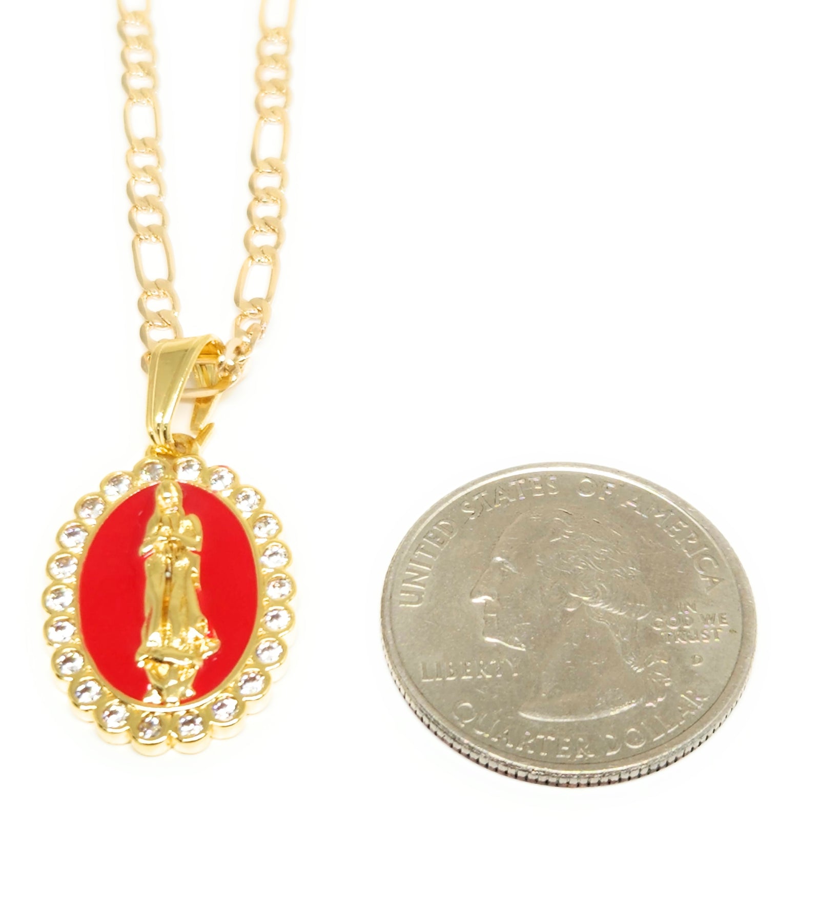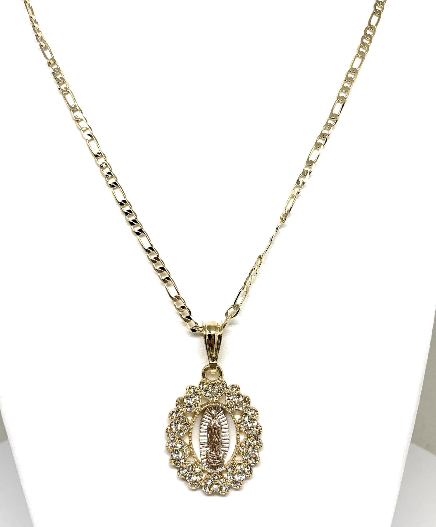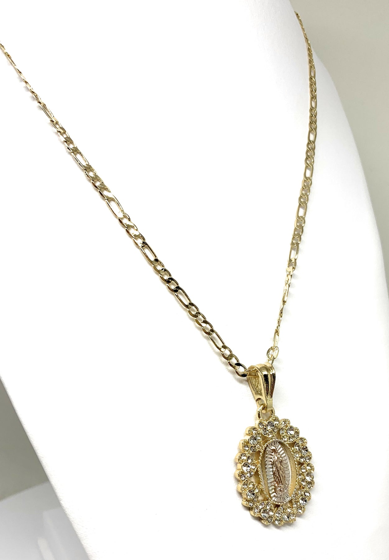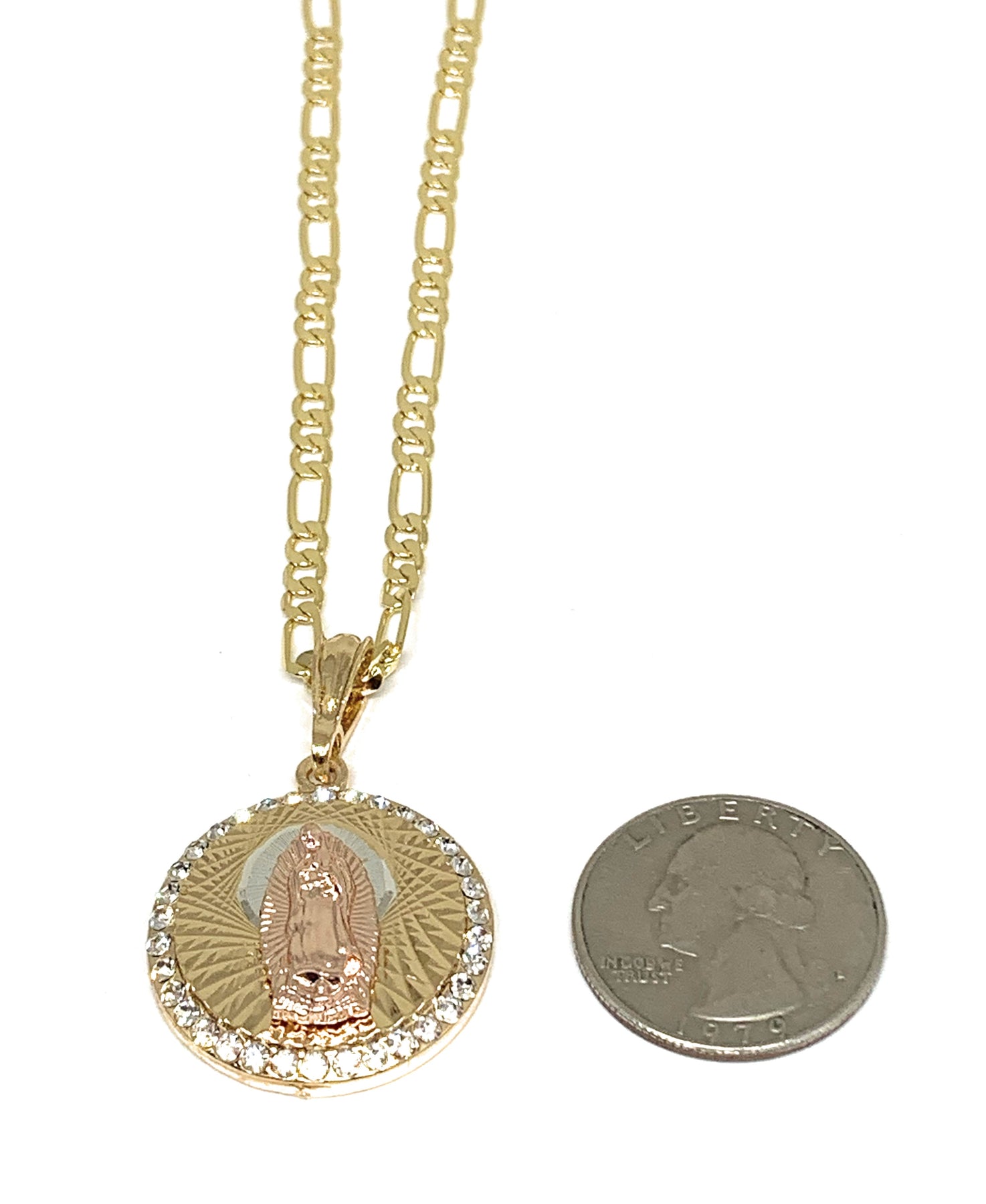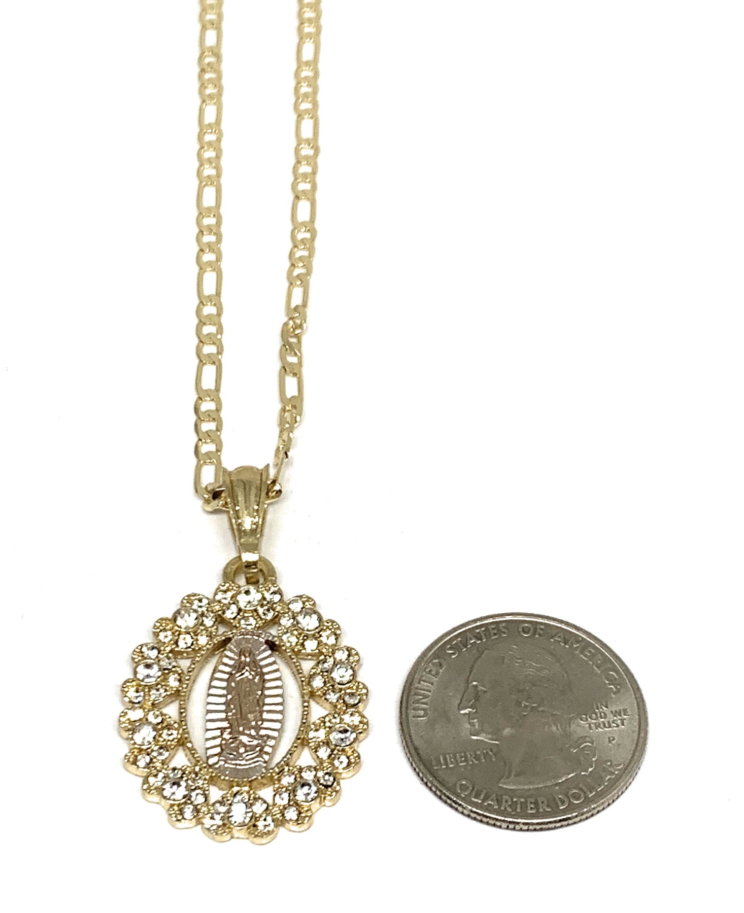 Gold Plated Tri-Color Virgin Mary CZ Pendant Necklace 24" Virgen de Guadalupe Medalla Tres Colores