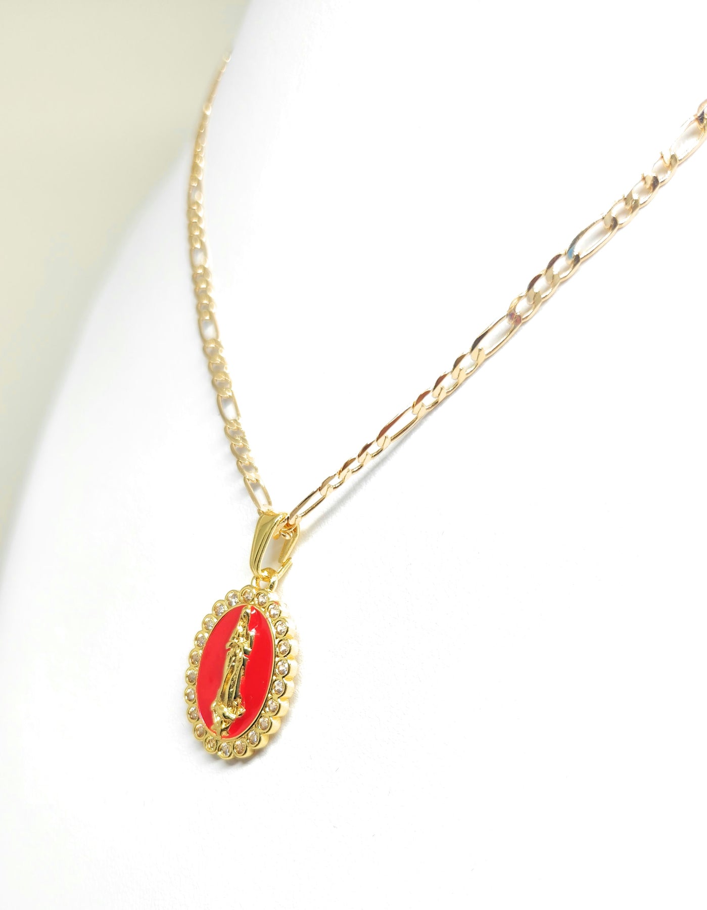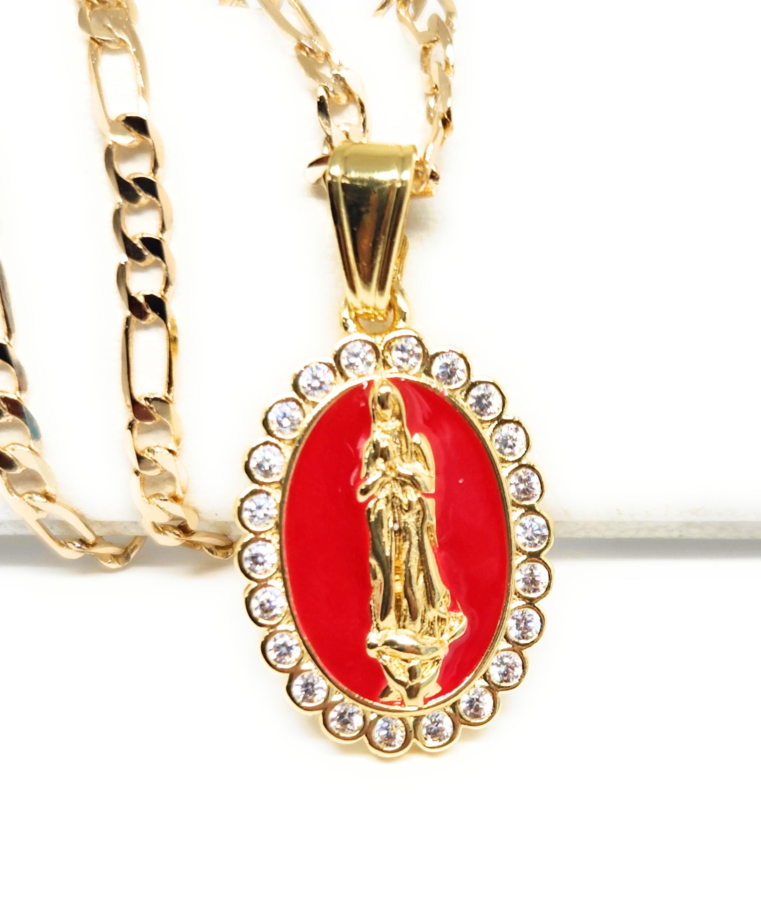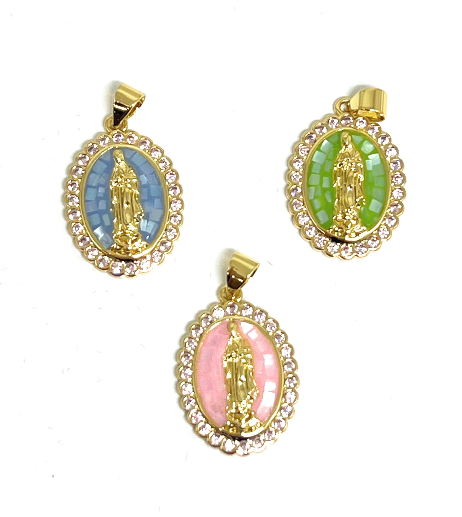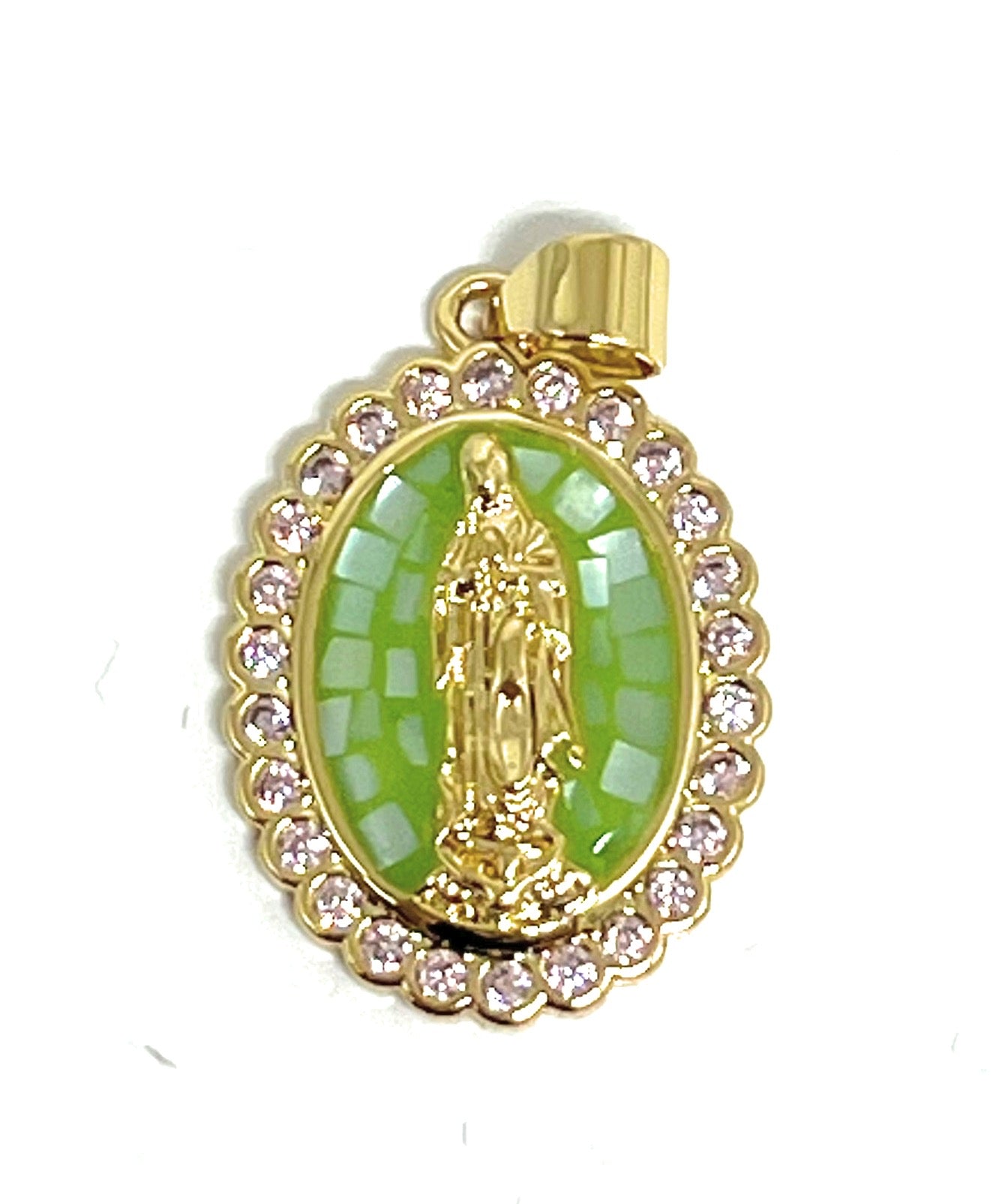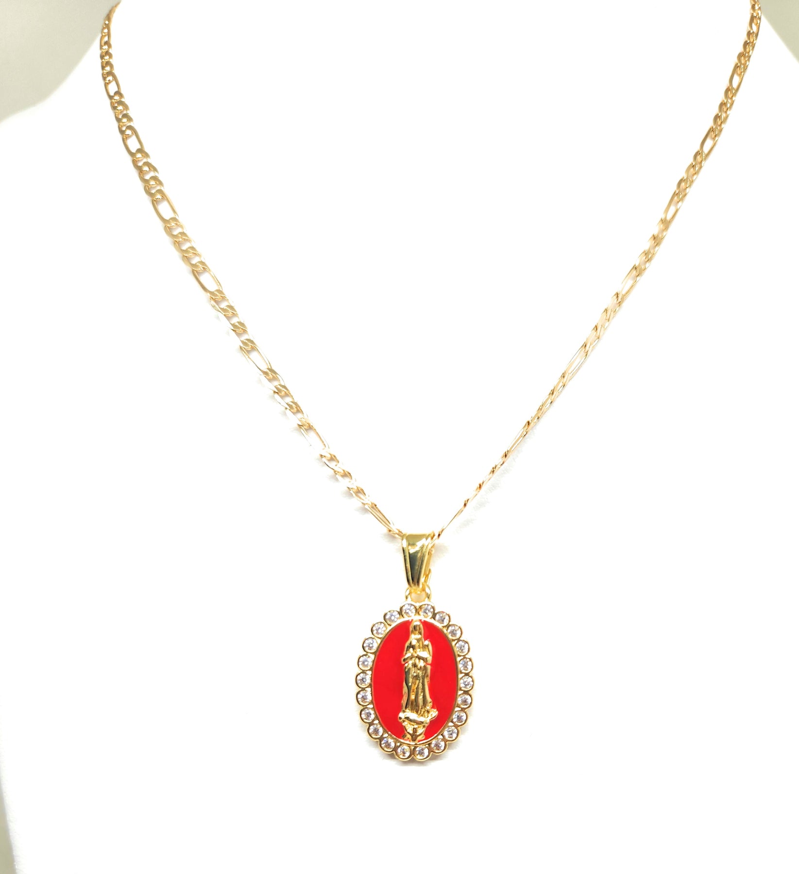 Gold Plated Tri-Color Virgin Mary CZ Pendant Necklace 24" Virgen de Guadalupe Medalla Tres Colores