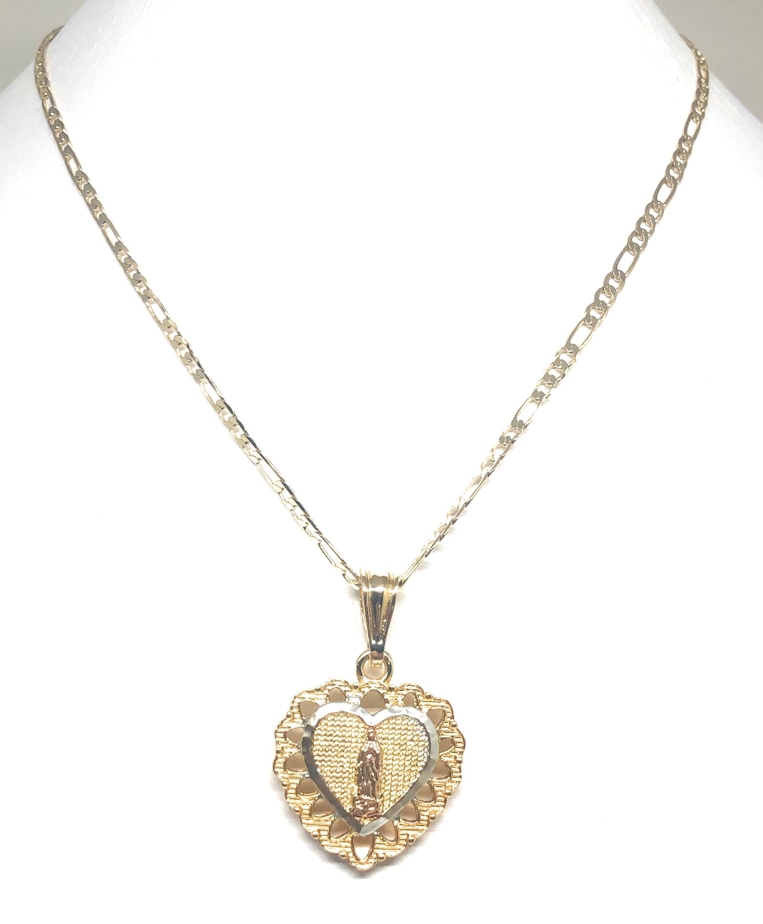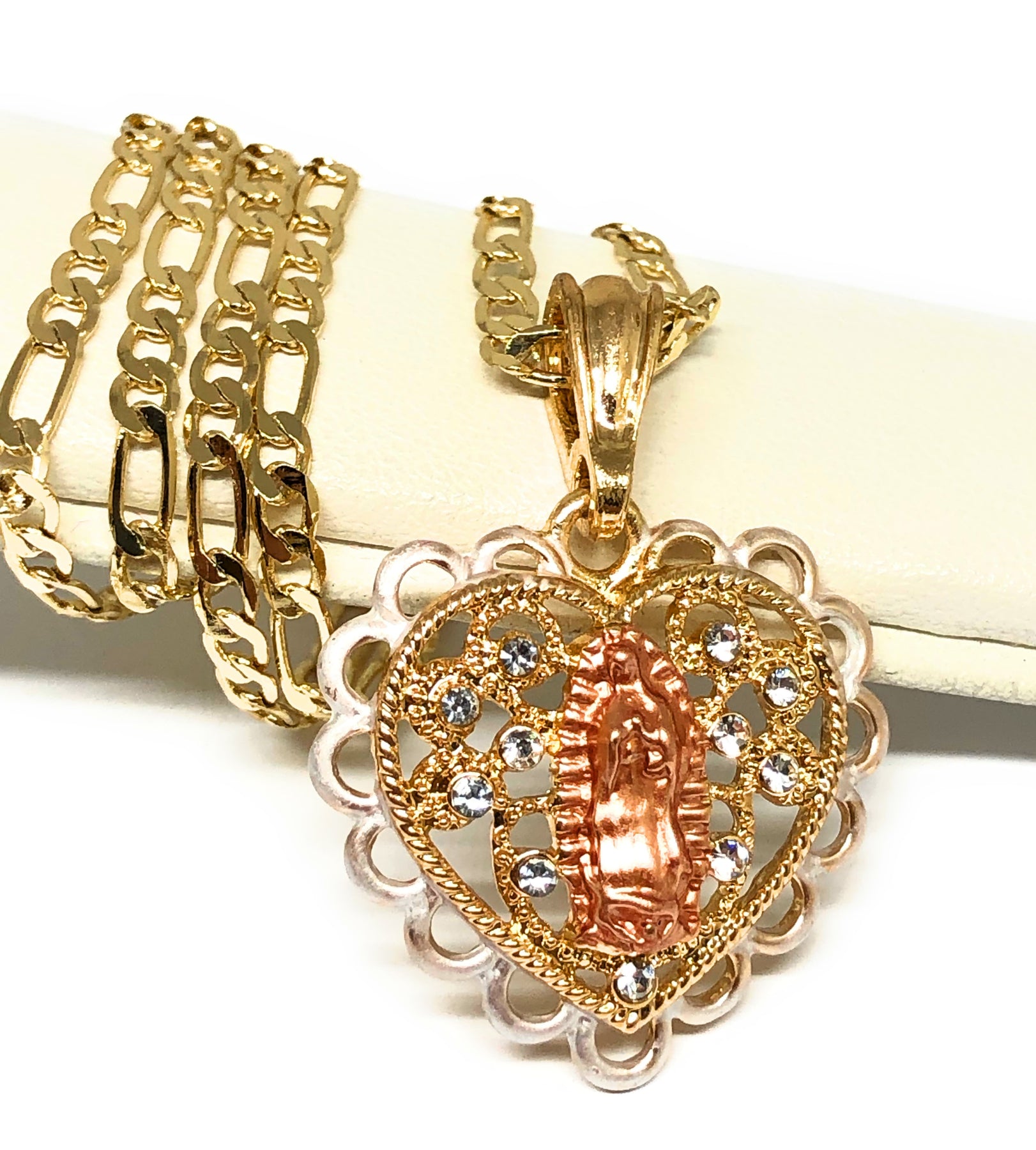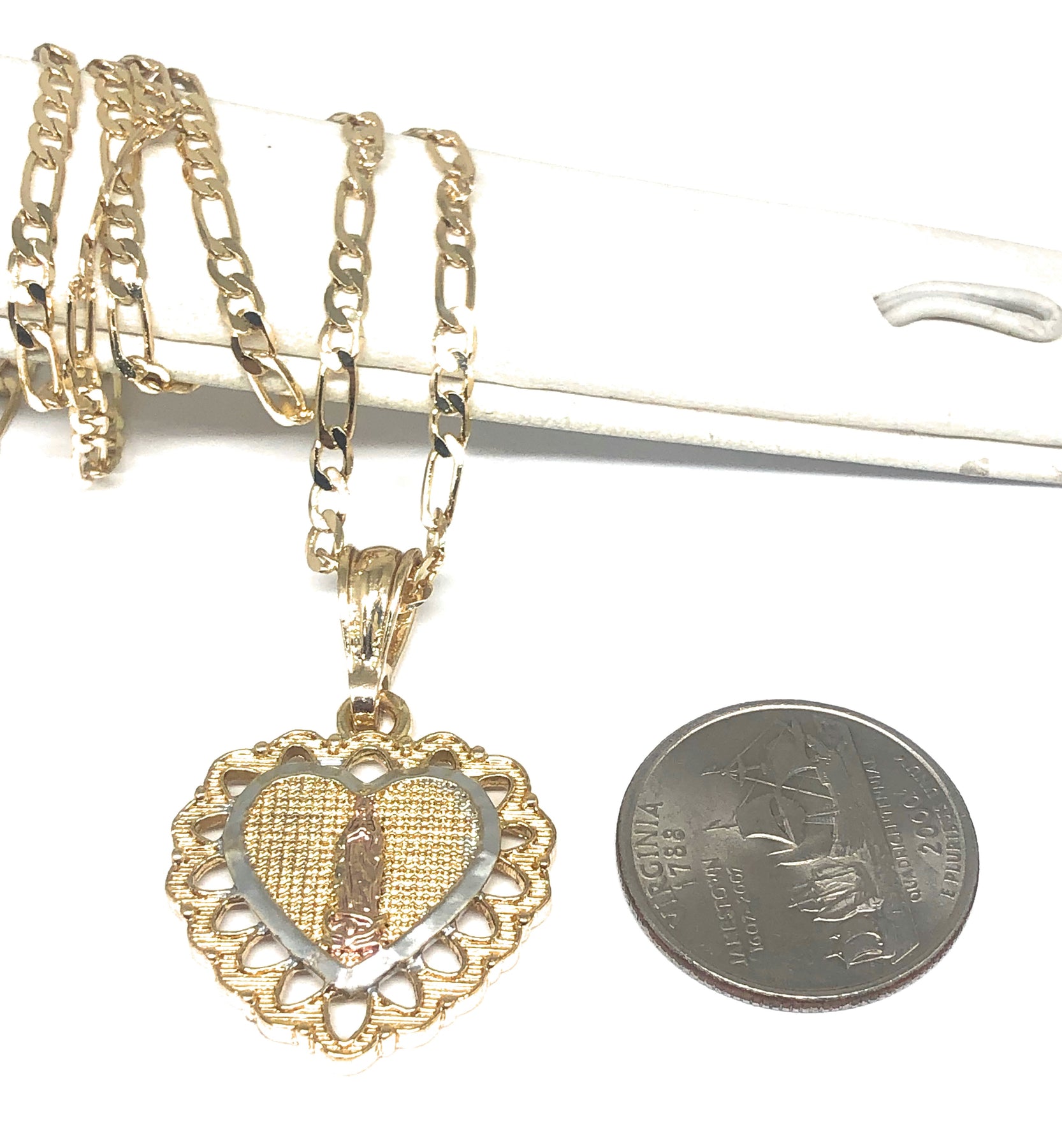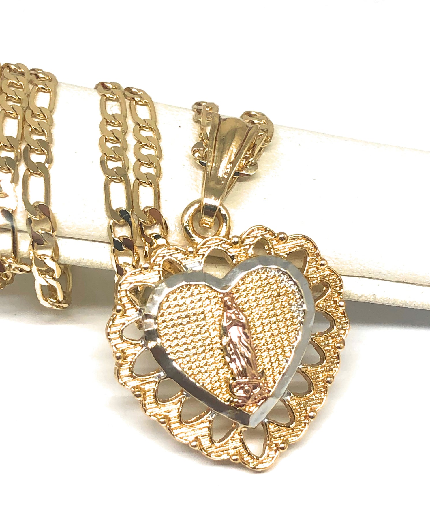 Gold Plated Tri-Color Virgin Mary Laser Cut Heart Pendant Necklace Figaro 24" Virgen de Guadalupe Medalla