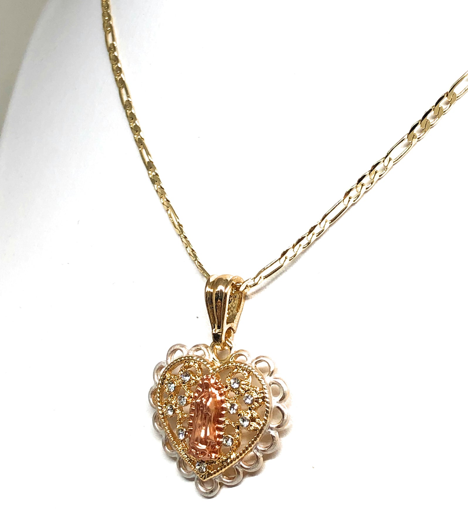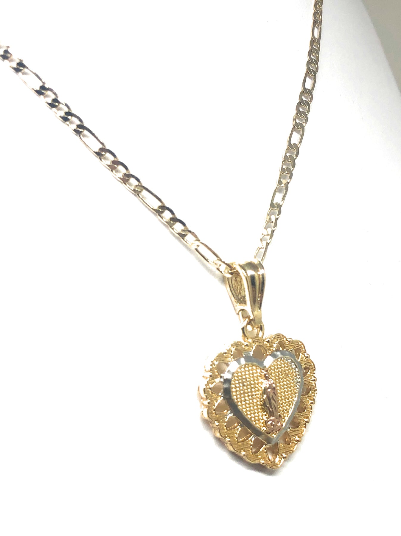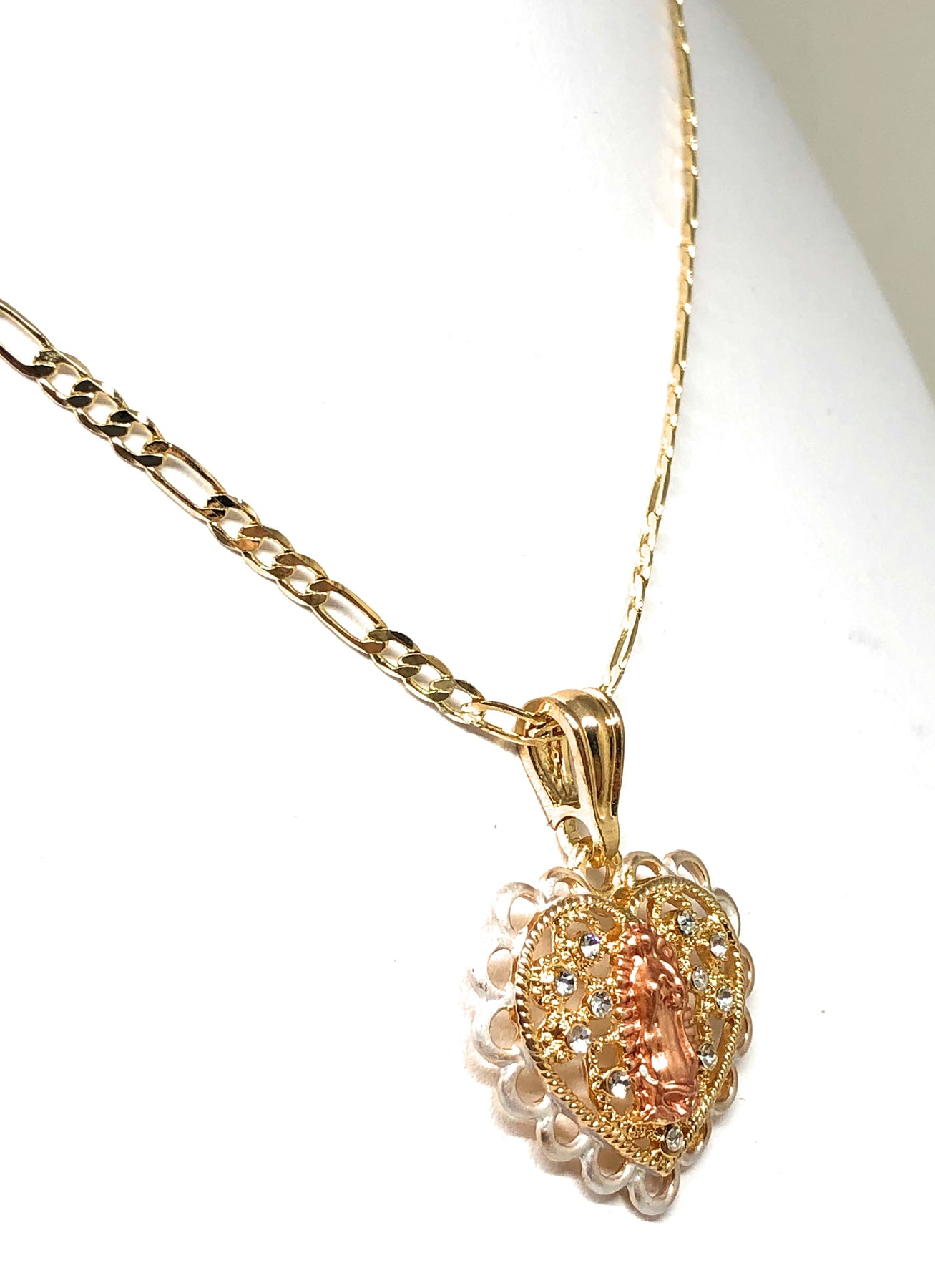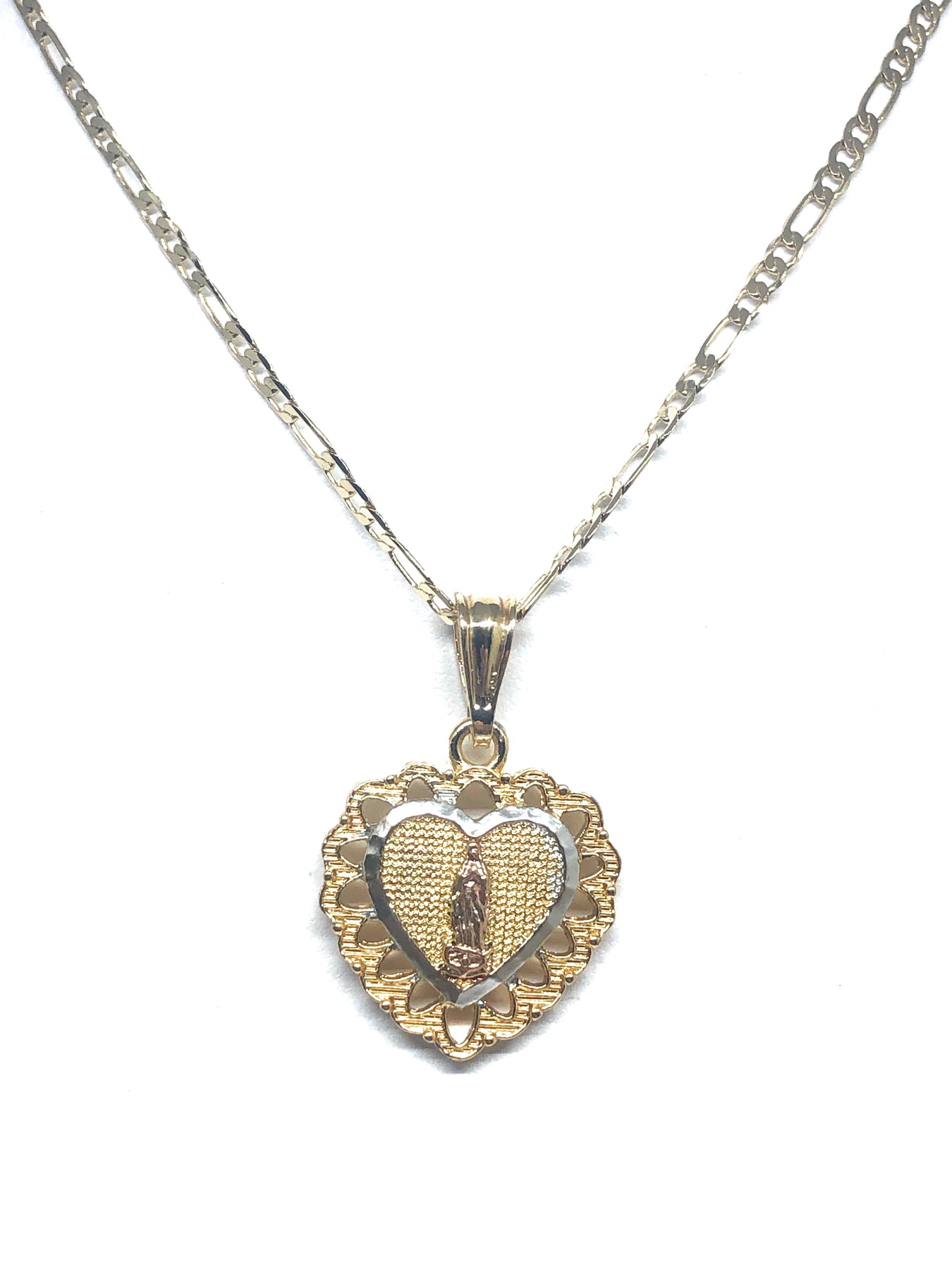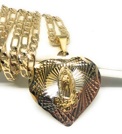 Gold Plated Tri-Color Virgin Mary Laser Cut Heart Pendant Necklace Figaro 24" Virgen de Guadalupe Medalla