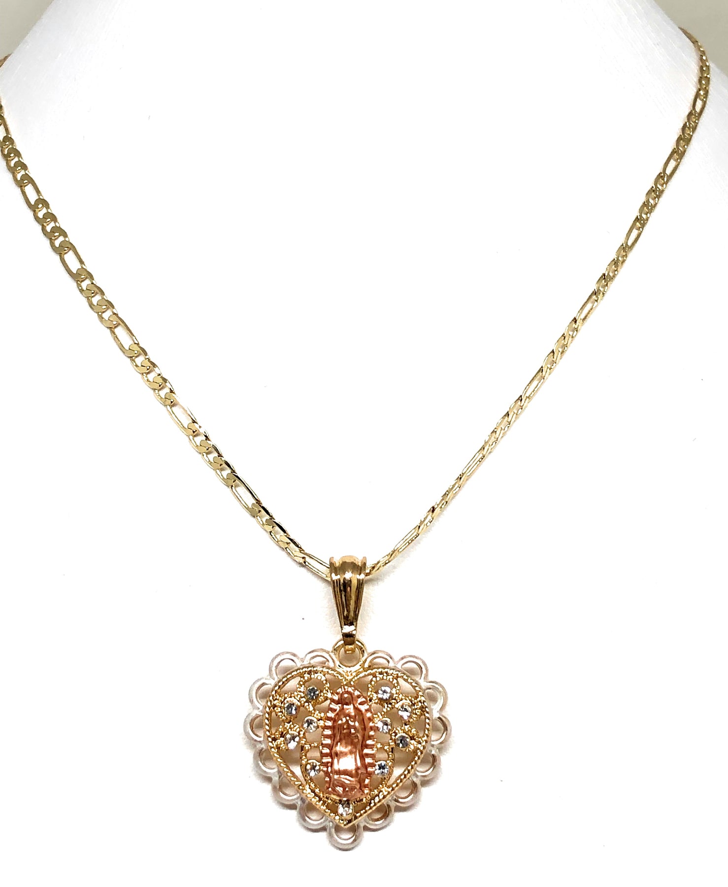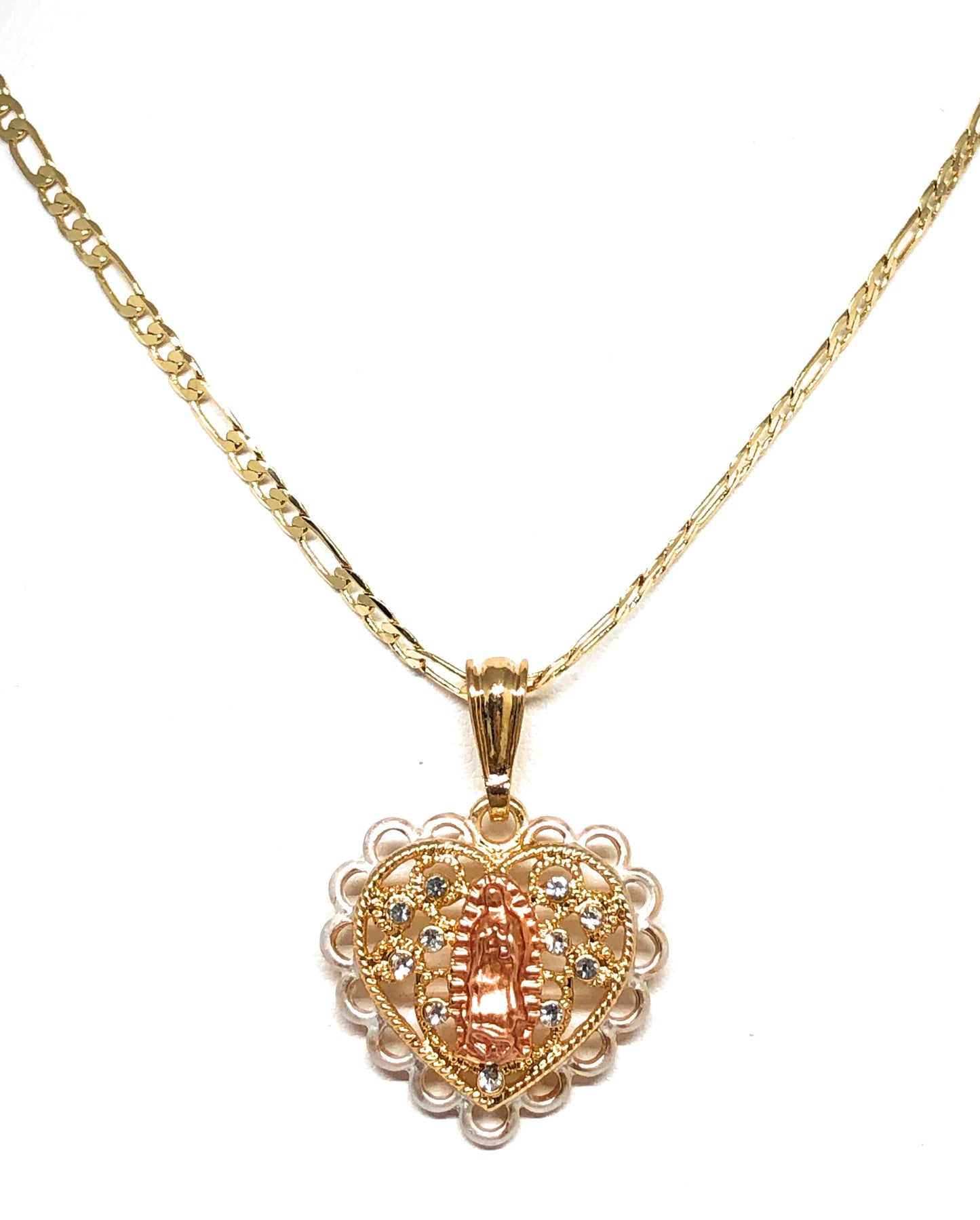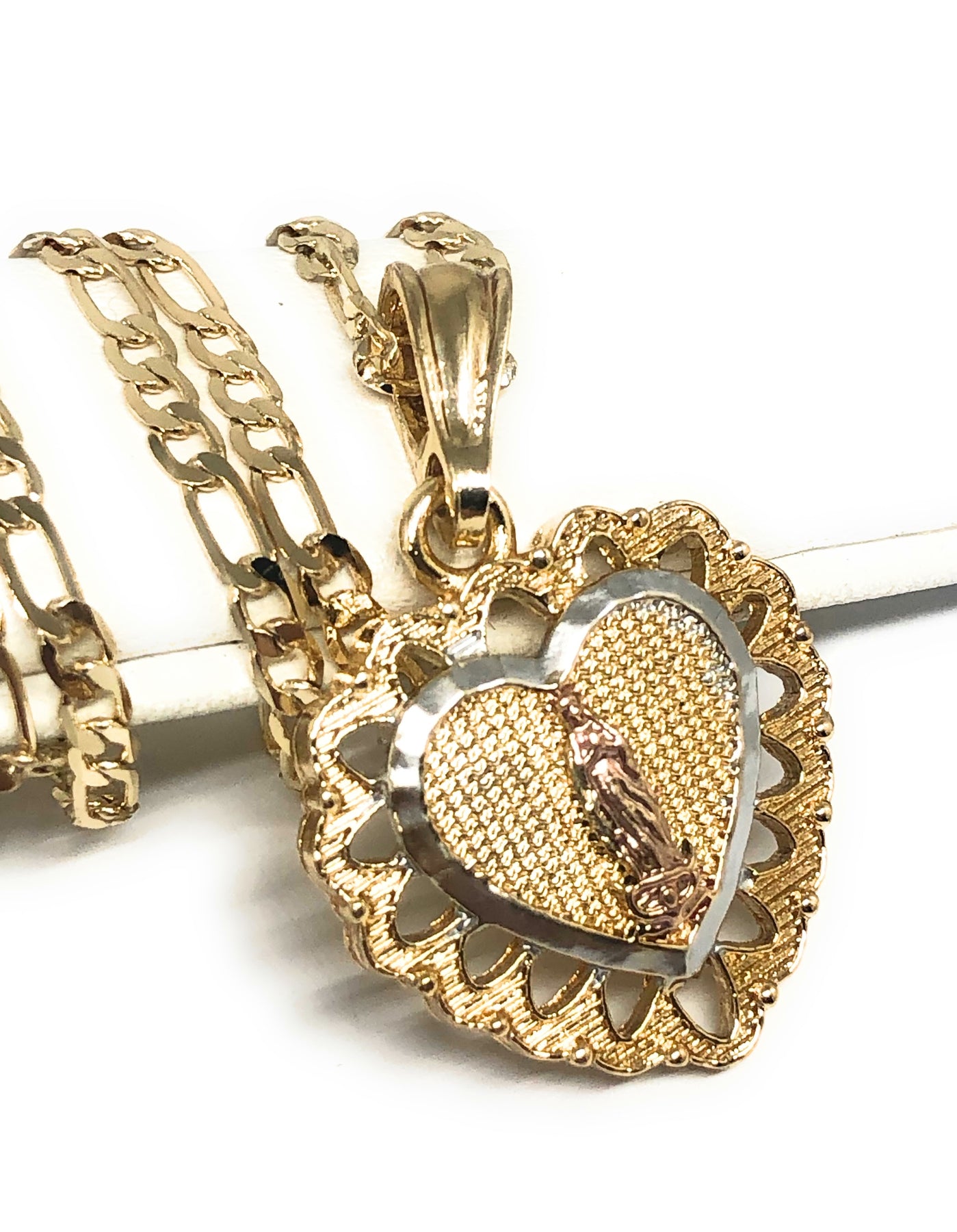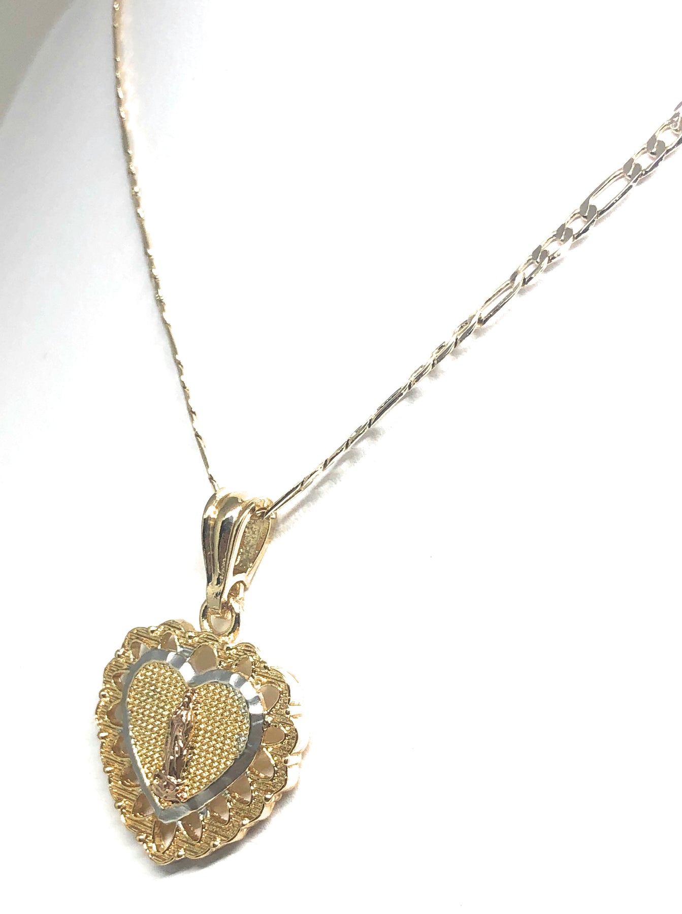Gold Plated Tri-Color Virgin Mary Laser Cut Heart Pendant Necklace Figaro 24" Virgen de Guadalupe Medalla