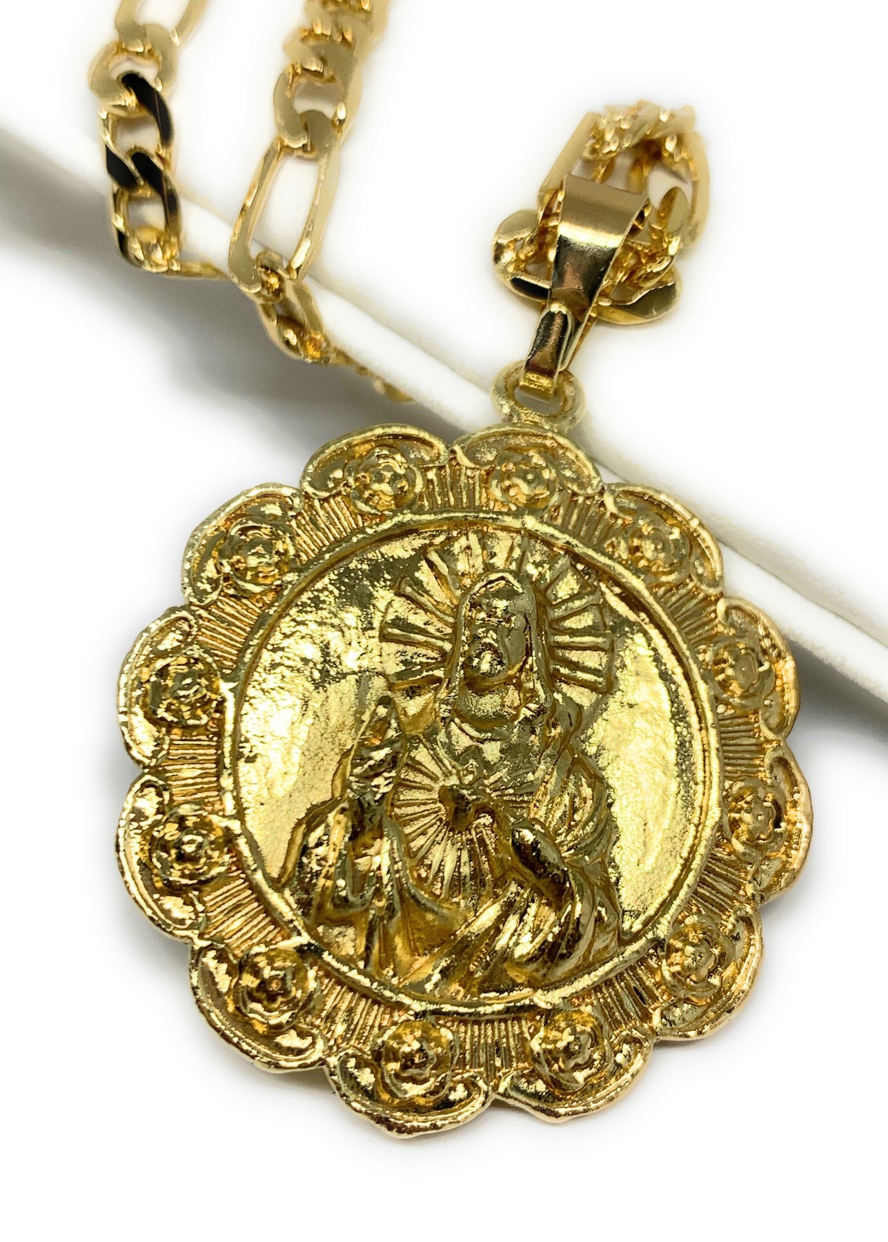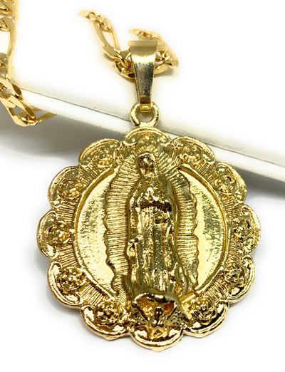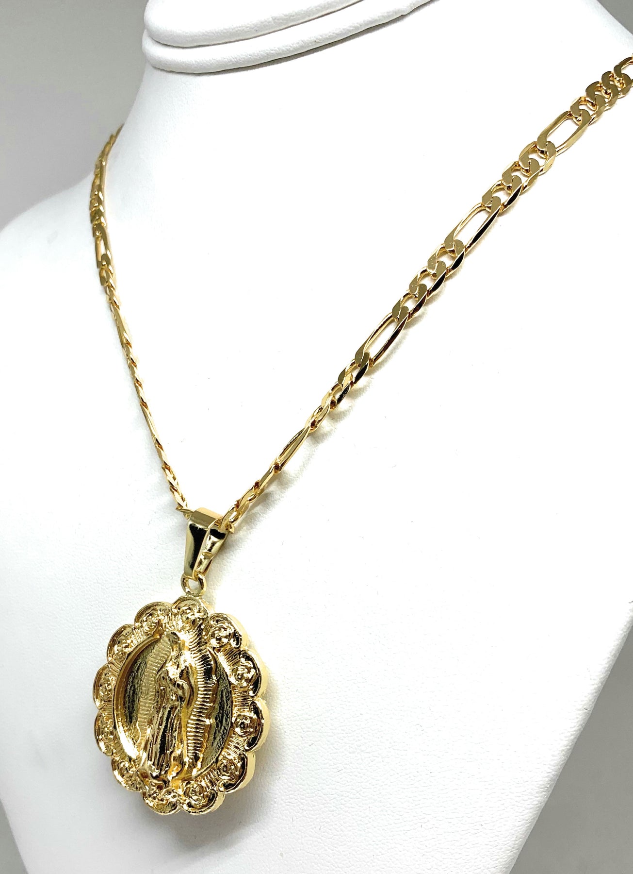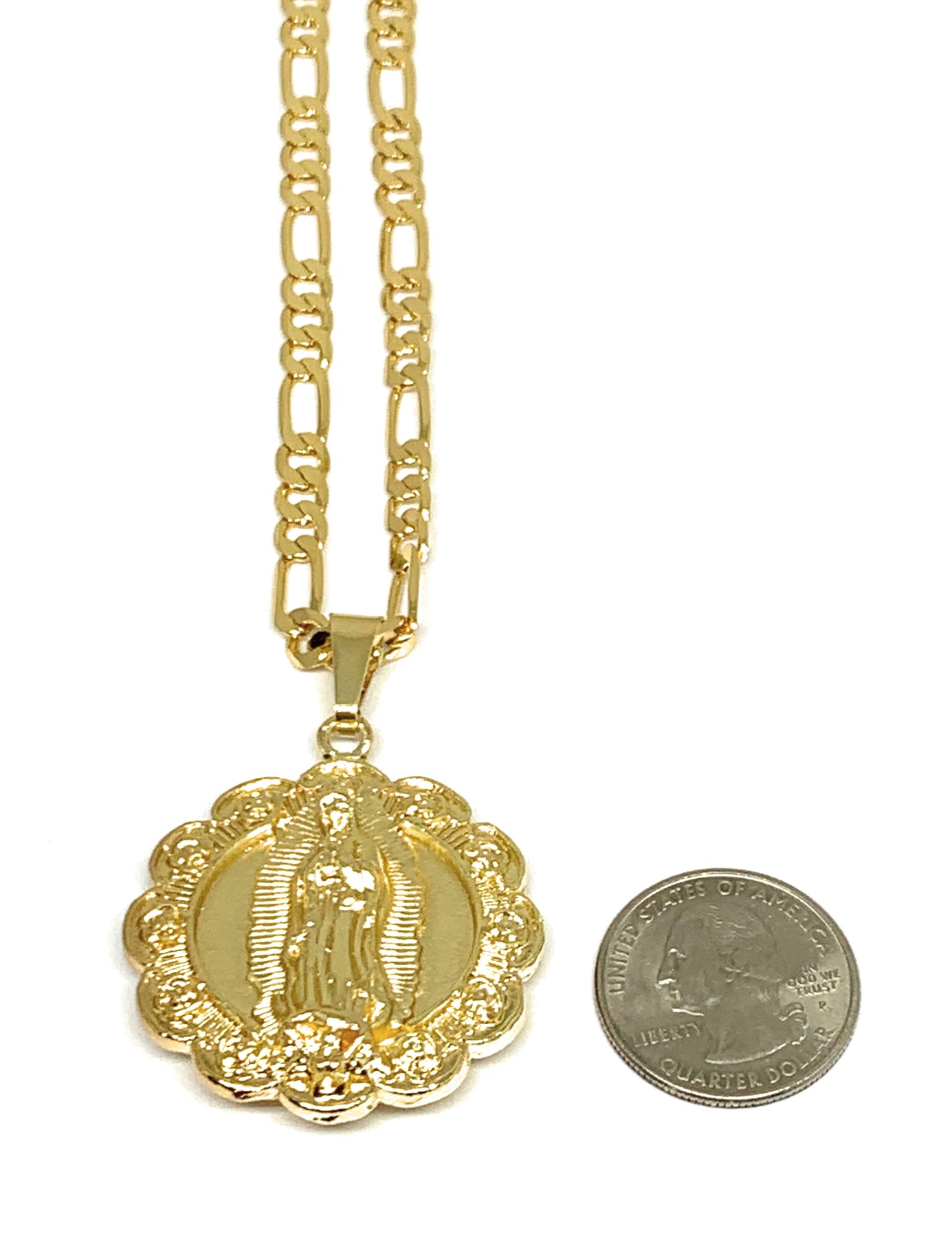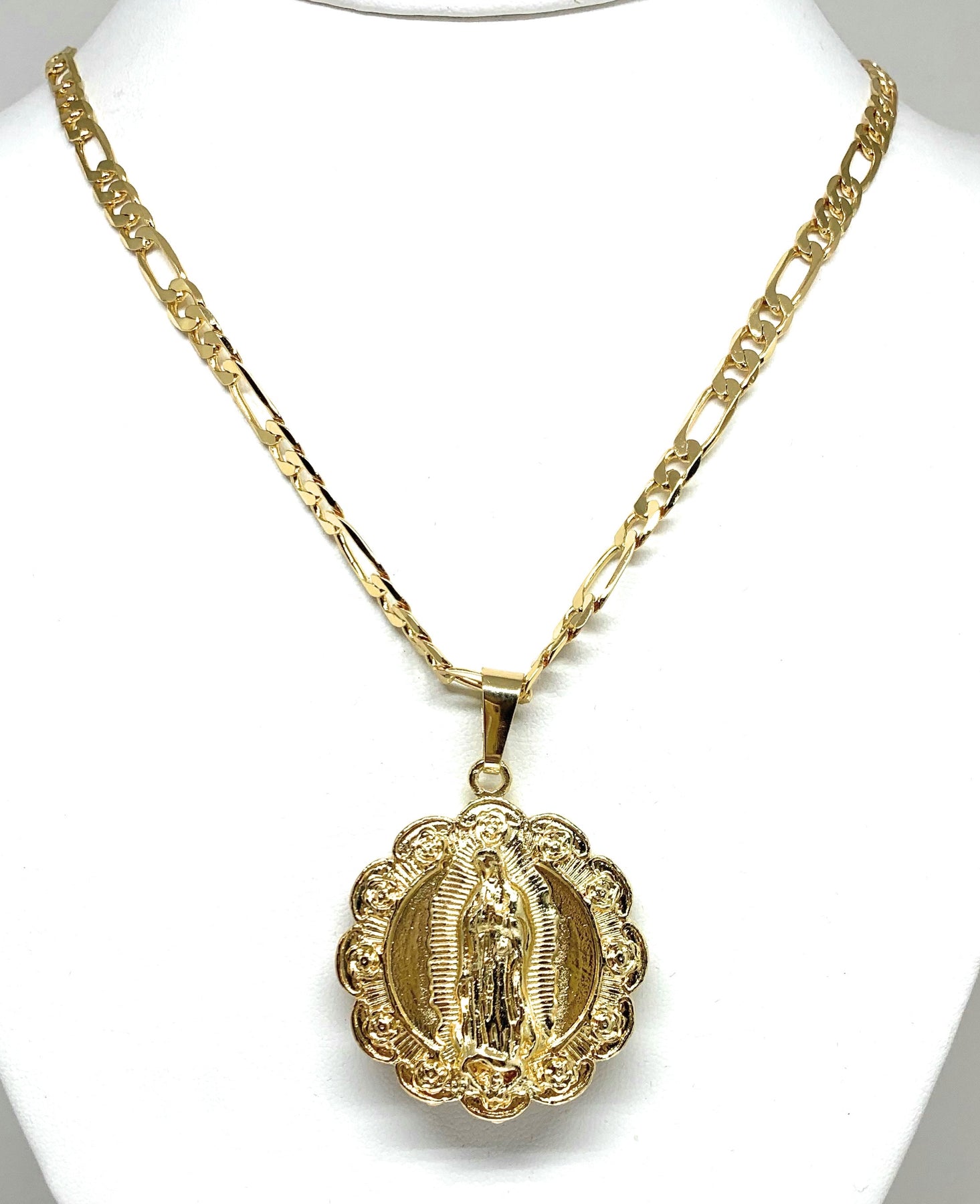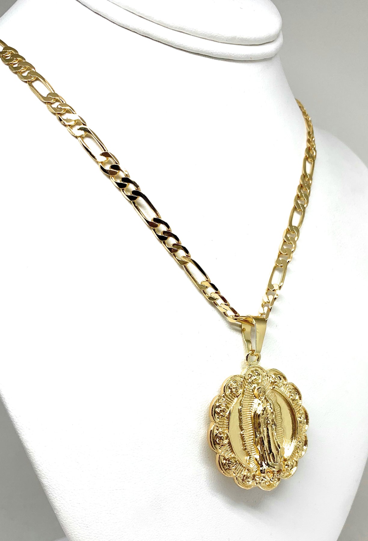 Gold Plated Virgen Guadalupe Sagrado Corazon Pendant Necklace 26" 5mm Figaro Chain