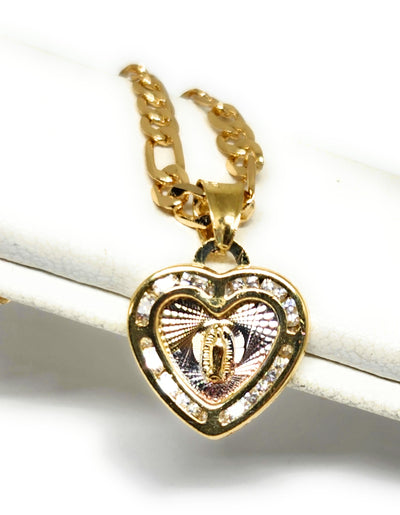 Gold Plated Tri-Color Virgin Mary Heart Pendant Necklace Figaro 24" Virgen de Guadalupe Medalla