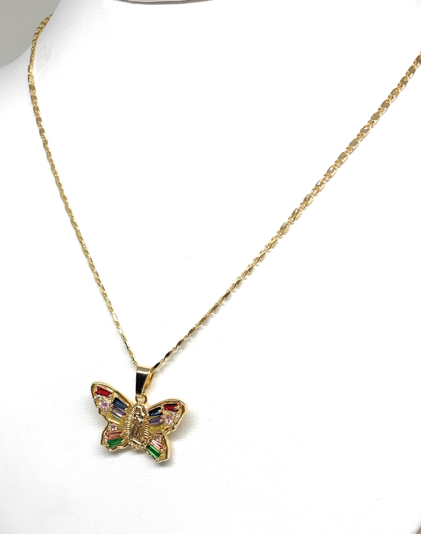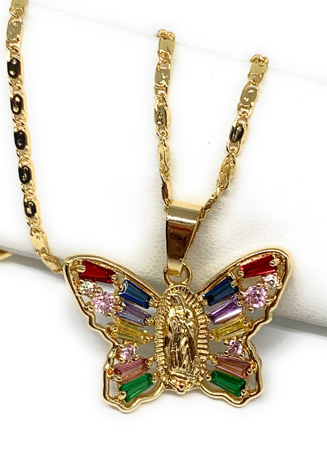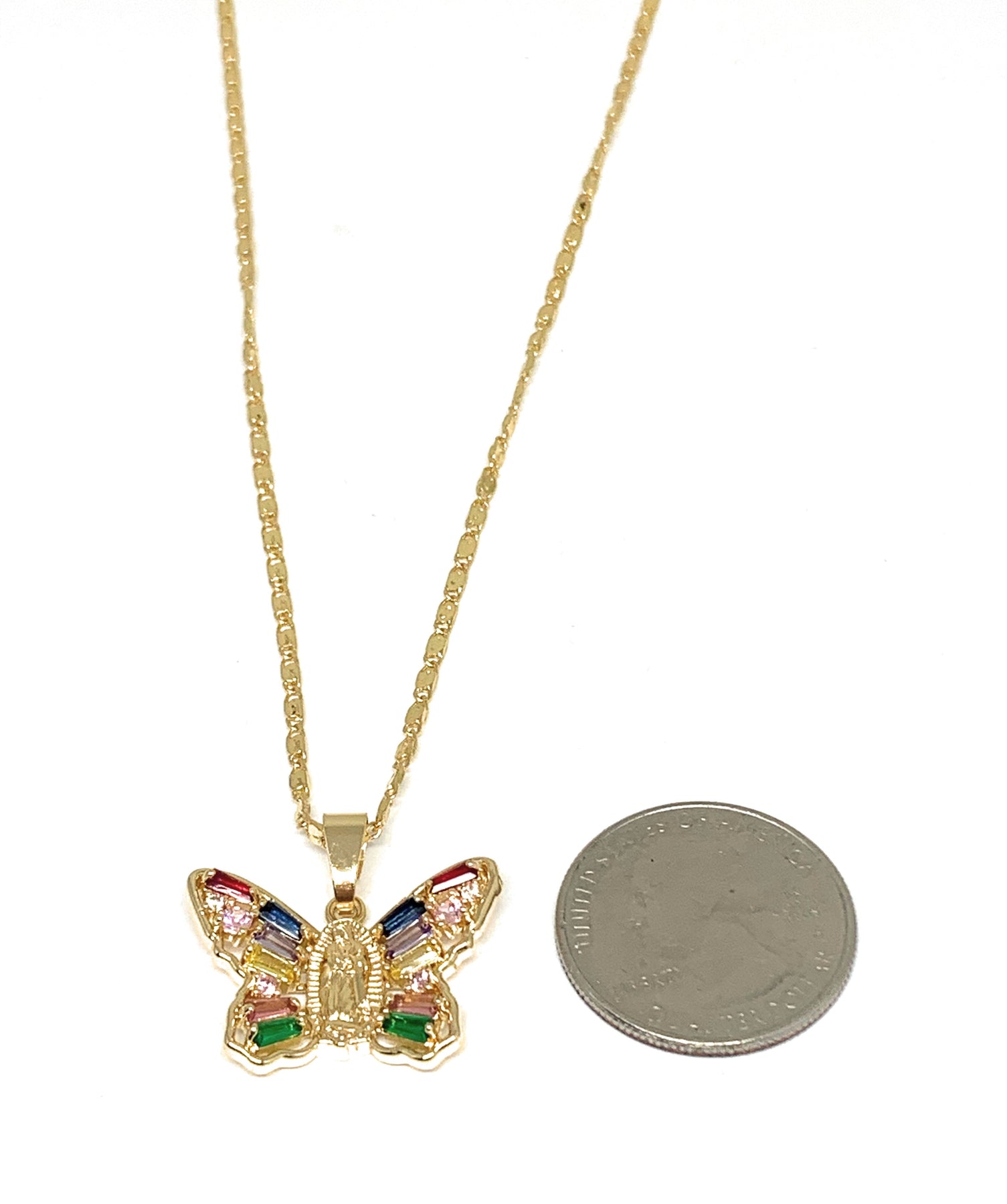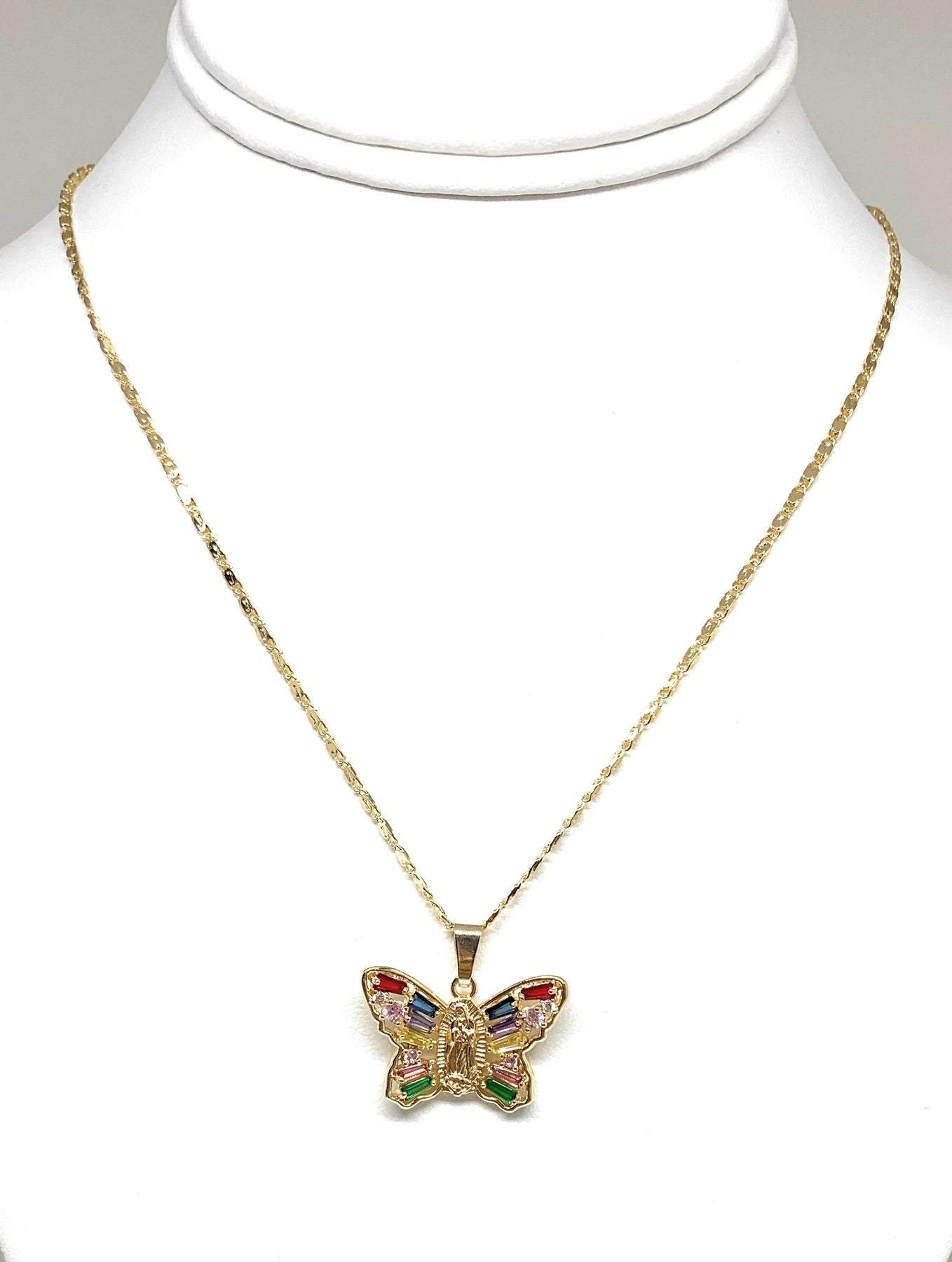 Gold Plated Virgin Mary Butterfly Colorful Pendant Necklace 18” Virgen Guadalupe (+ FREE EARRINGS)