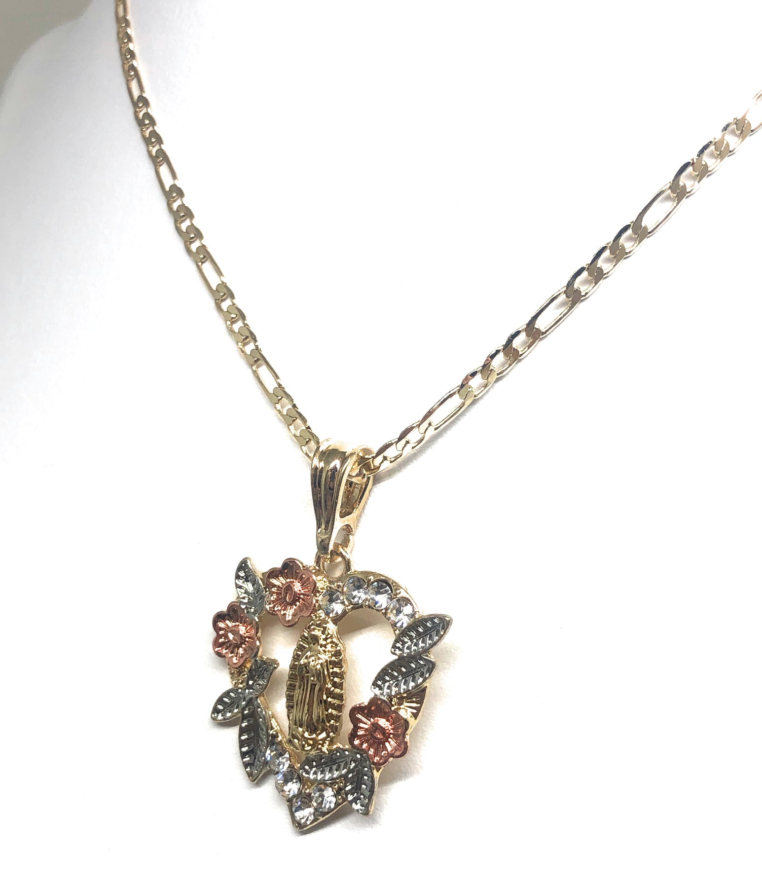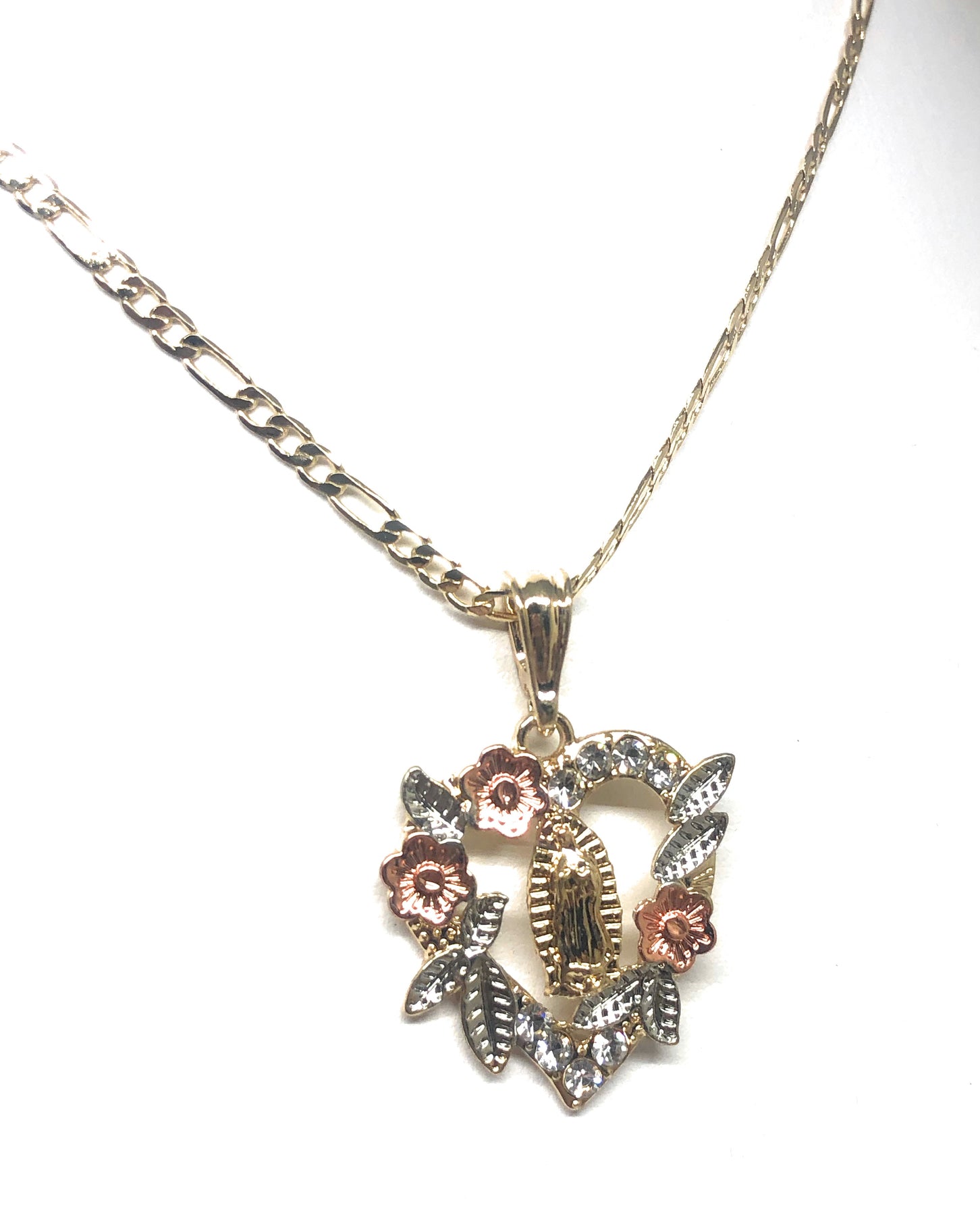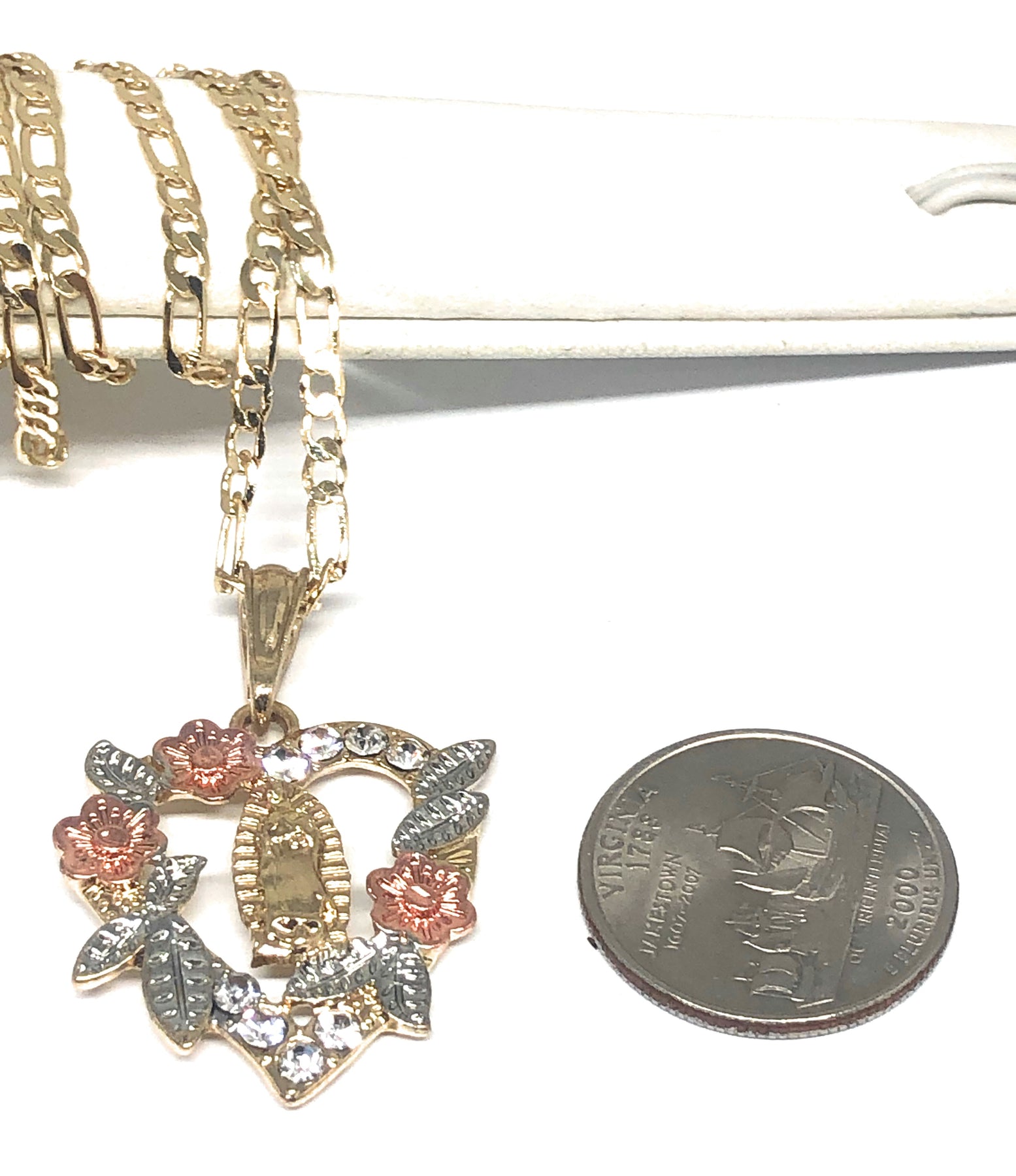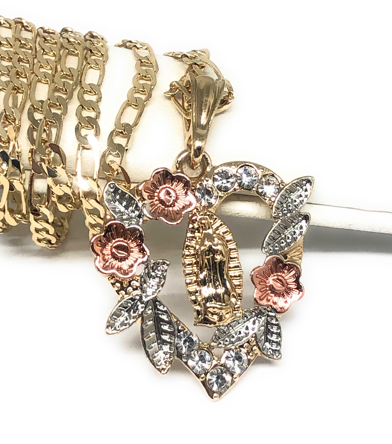 Gold Plated Tri-Color Virgin Mary CZ Heart Flower Pendant Necklace Figaro 24" Virgen de Guadalupe Medalla