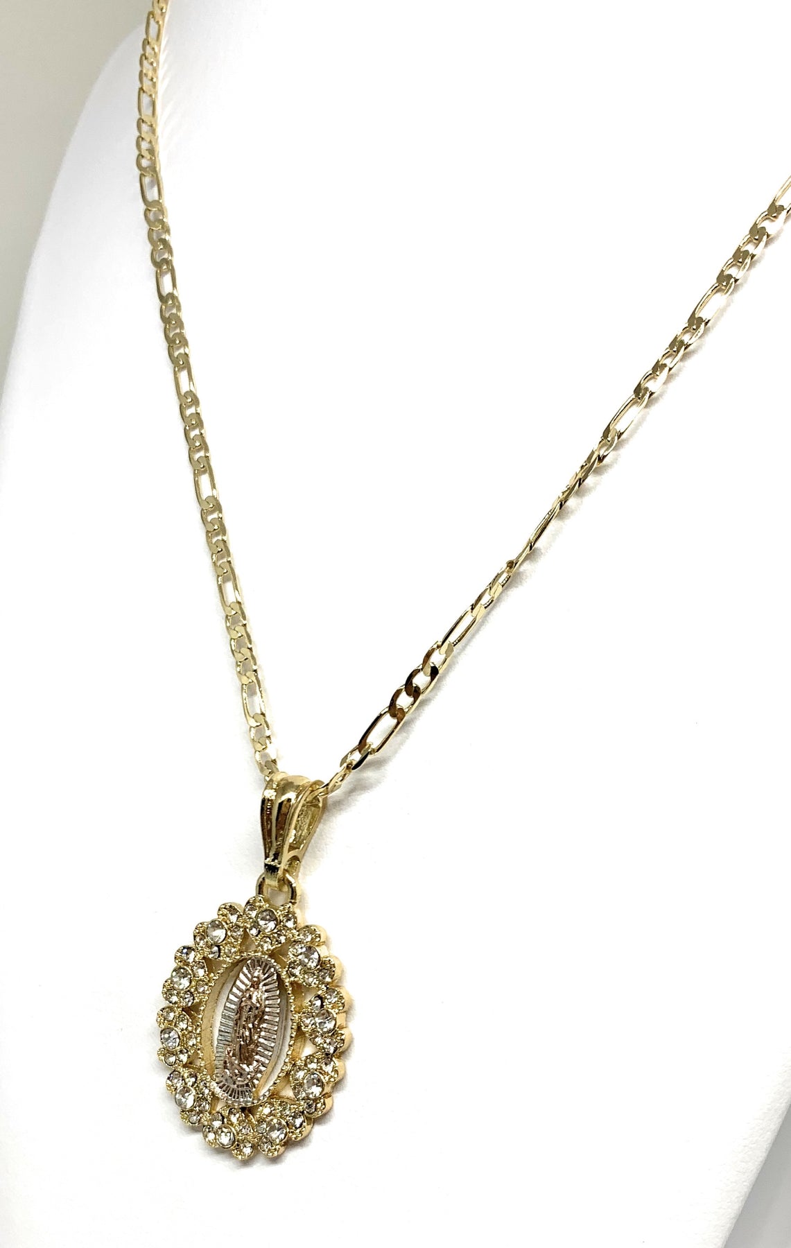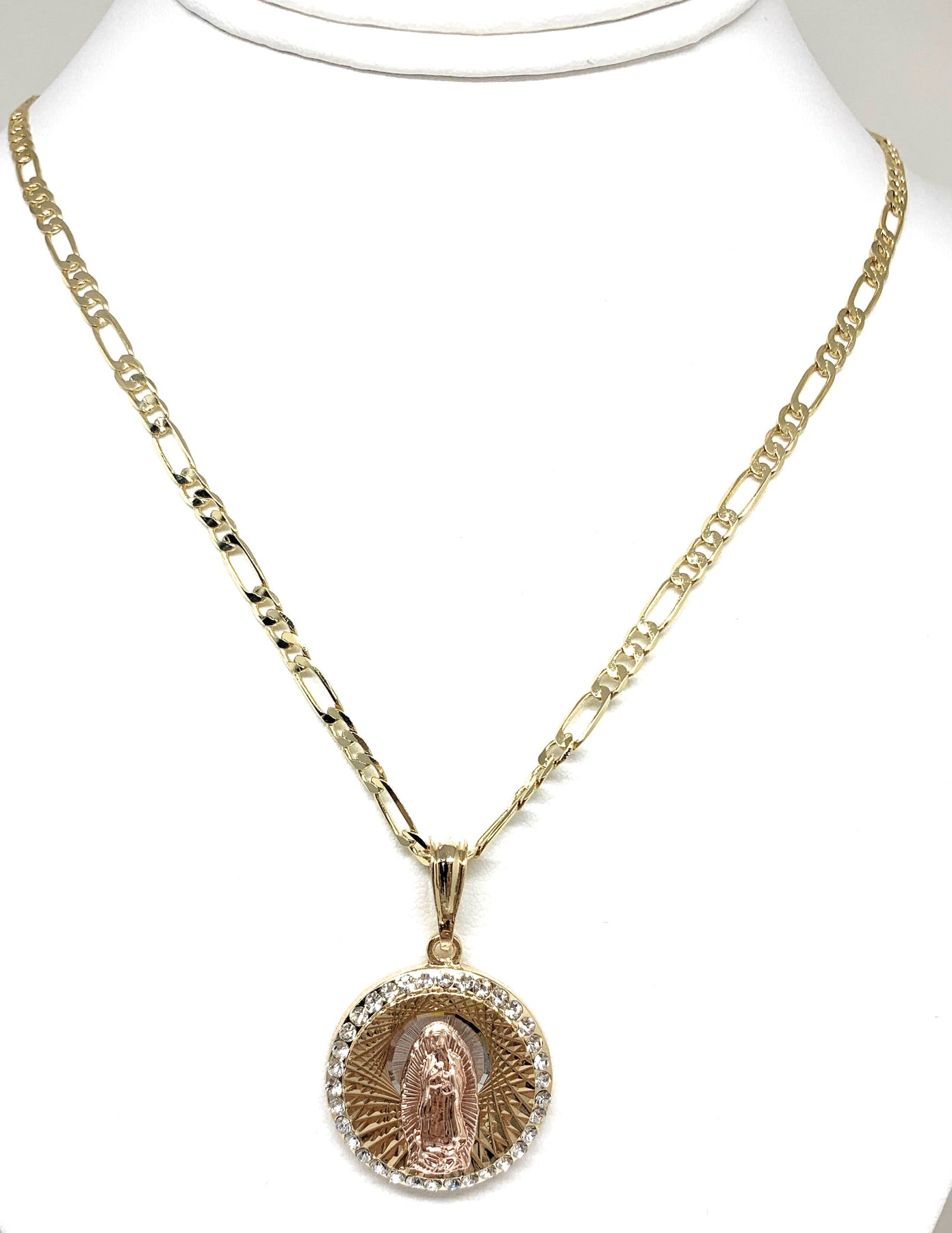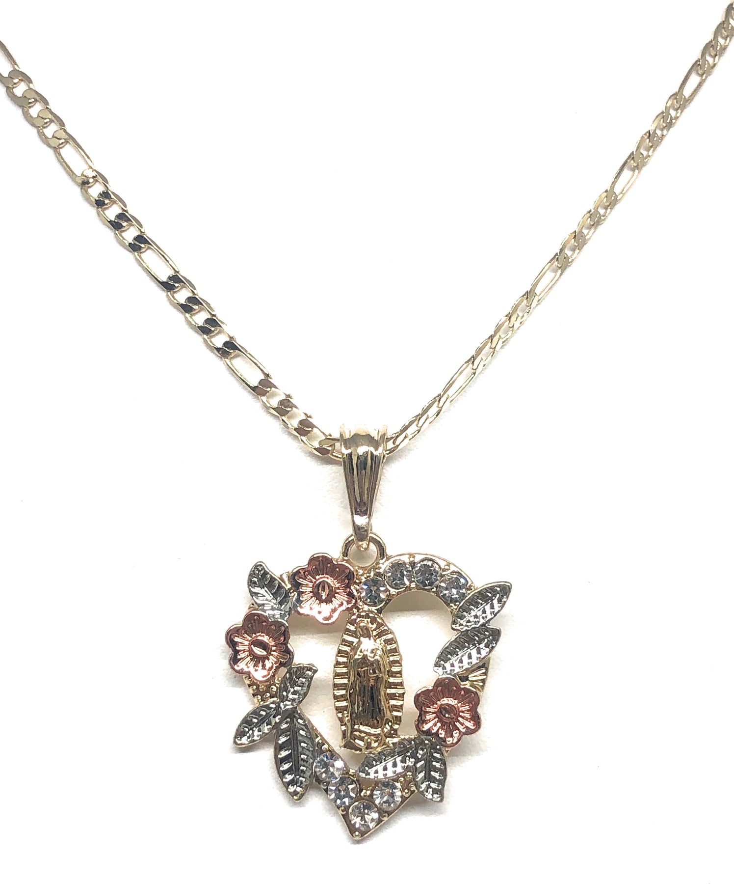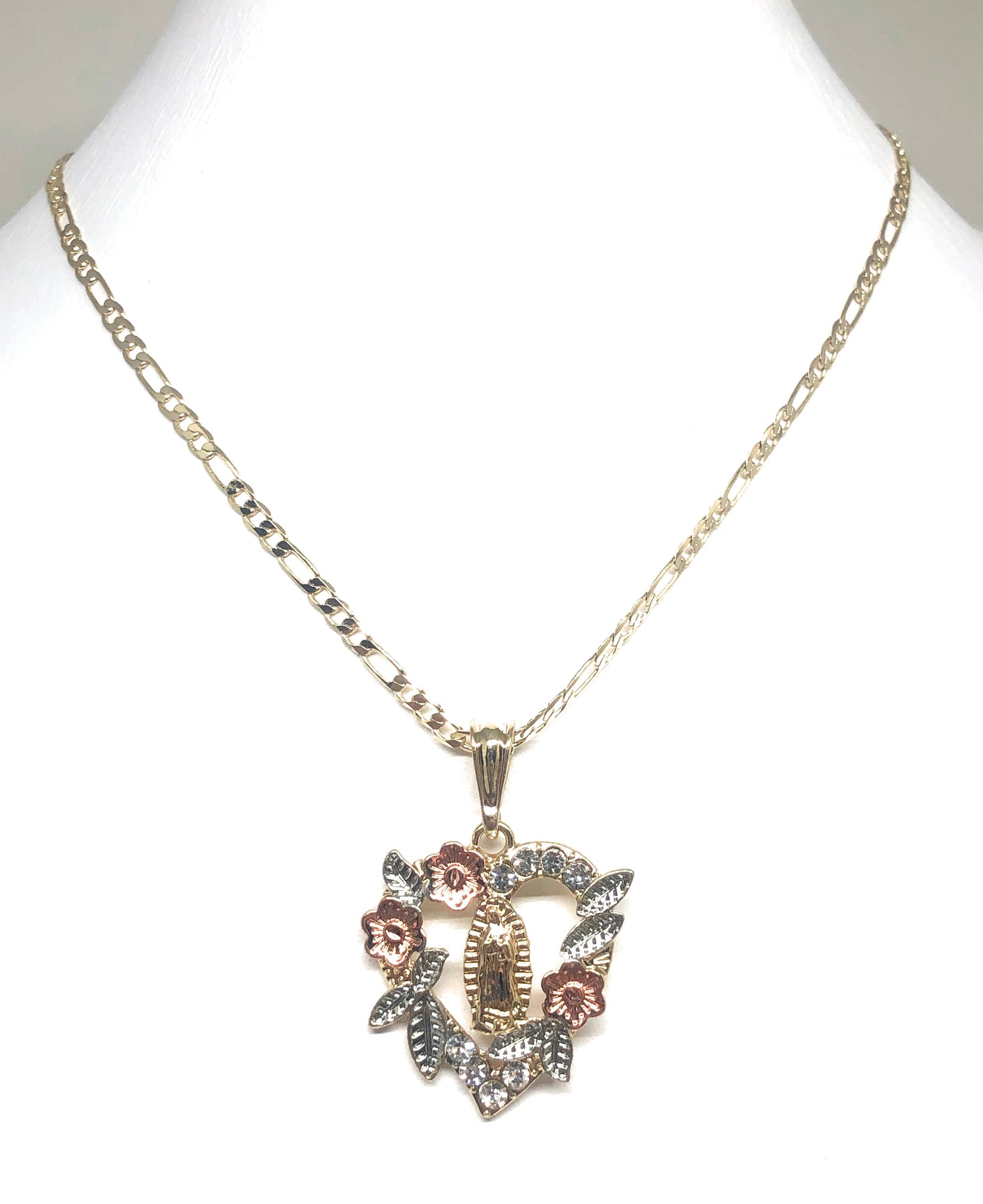 Gold Plated Tri-Color Virgin Mary CZ Heart Flower Pendant Necklace Figaro 24" Virgen de Guadalupe Medalla
