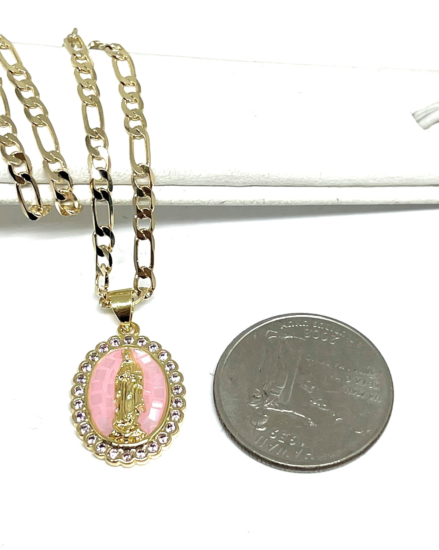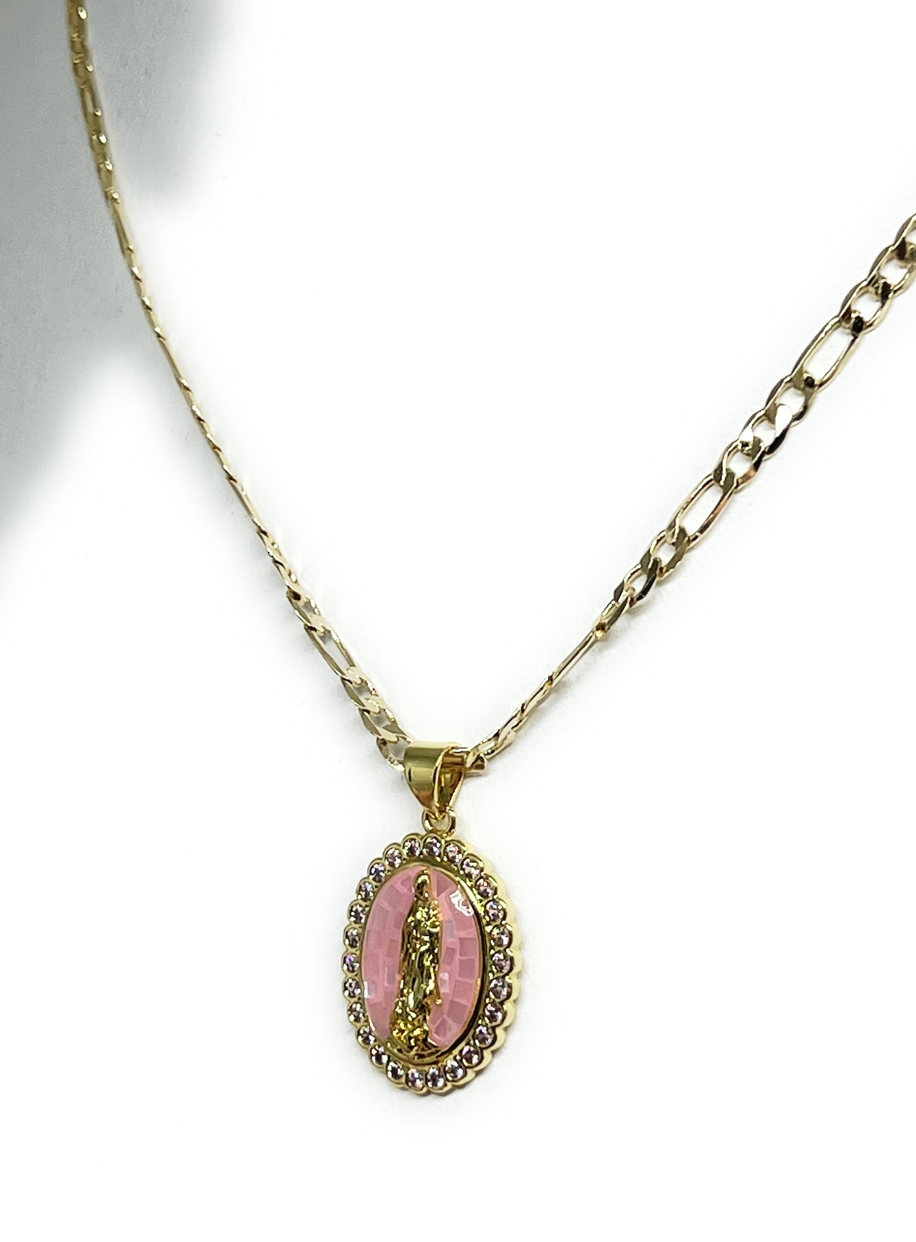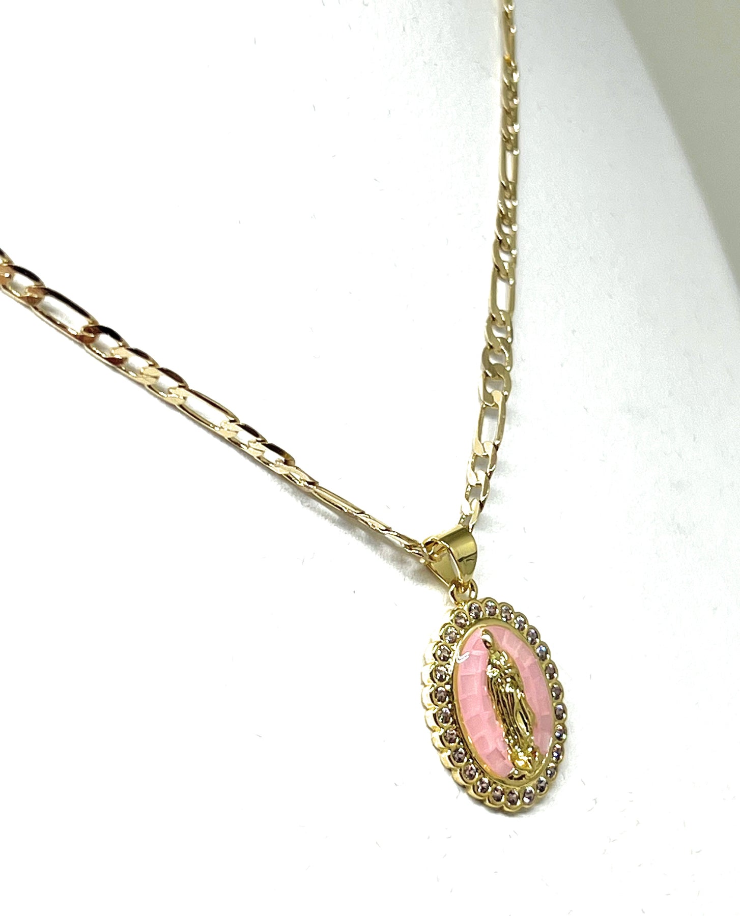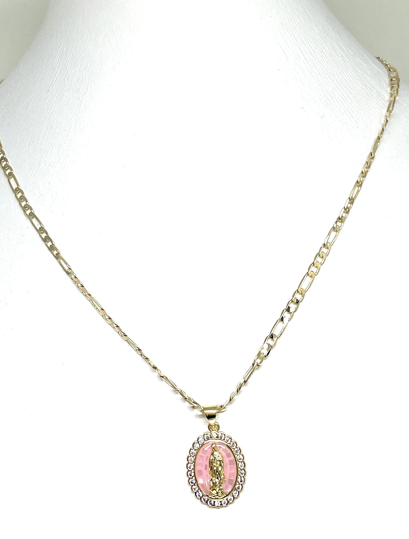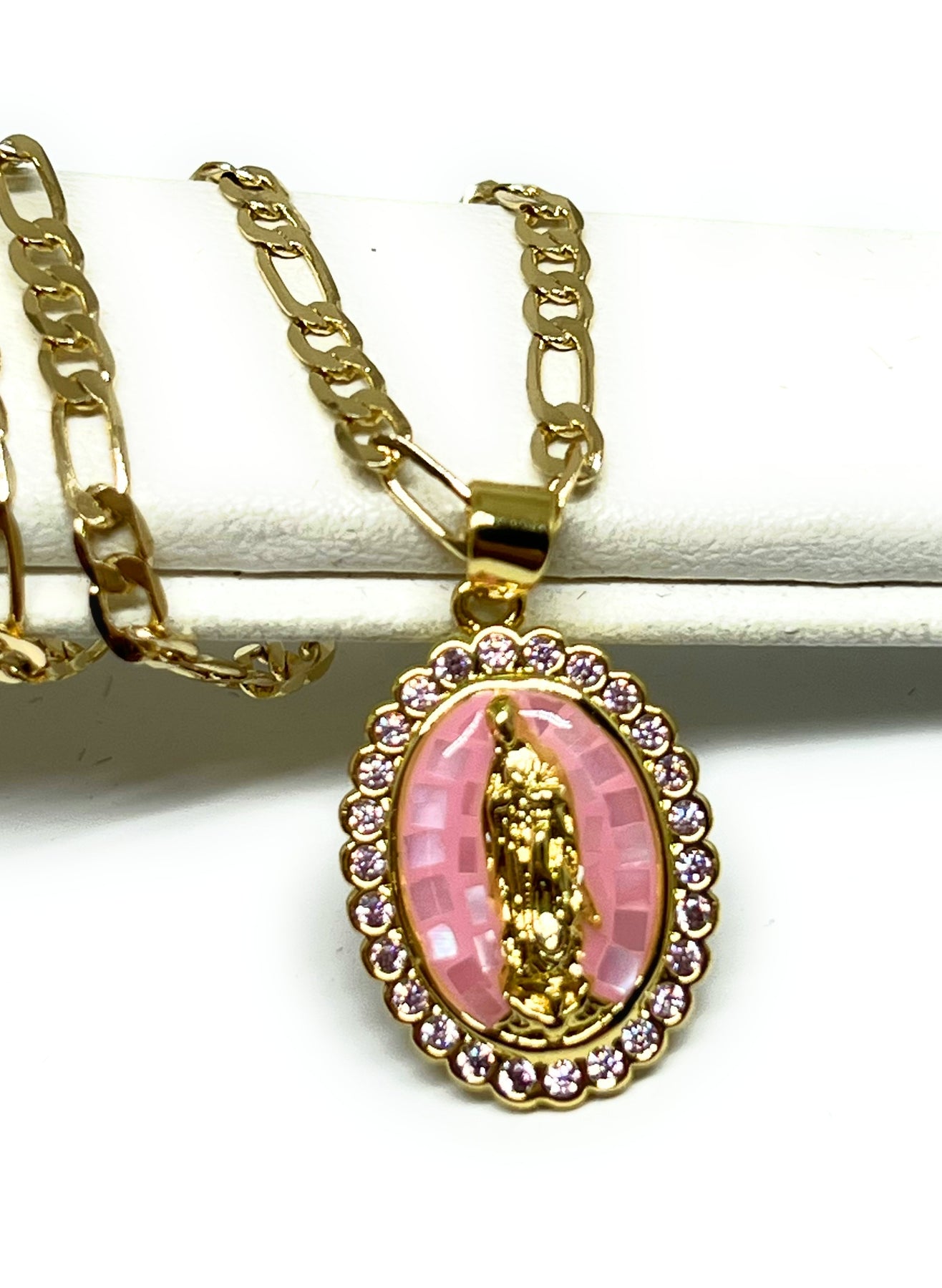 Gold Plated Virgin Mary Enamel Pink CZ Pendant Necklace 24" Virgen Guadalupe Medalla