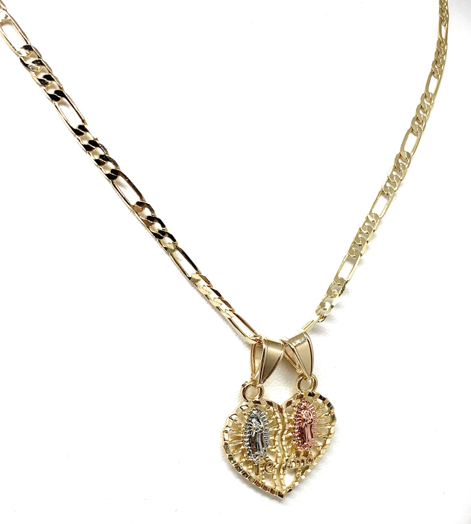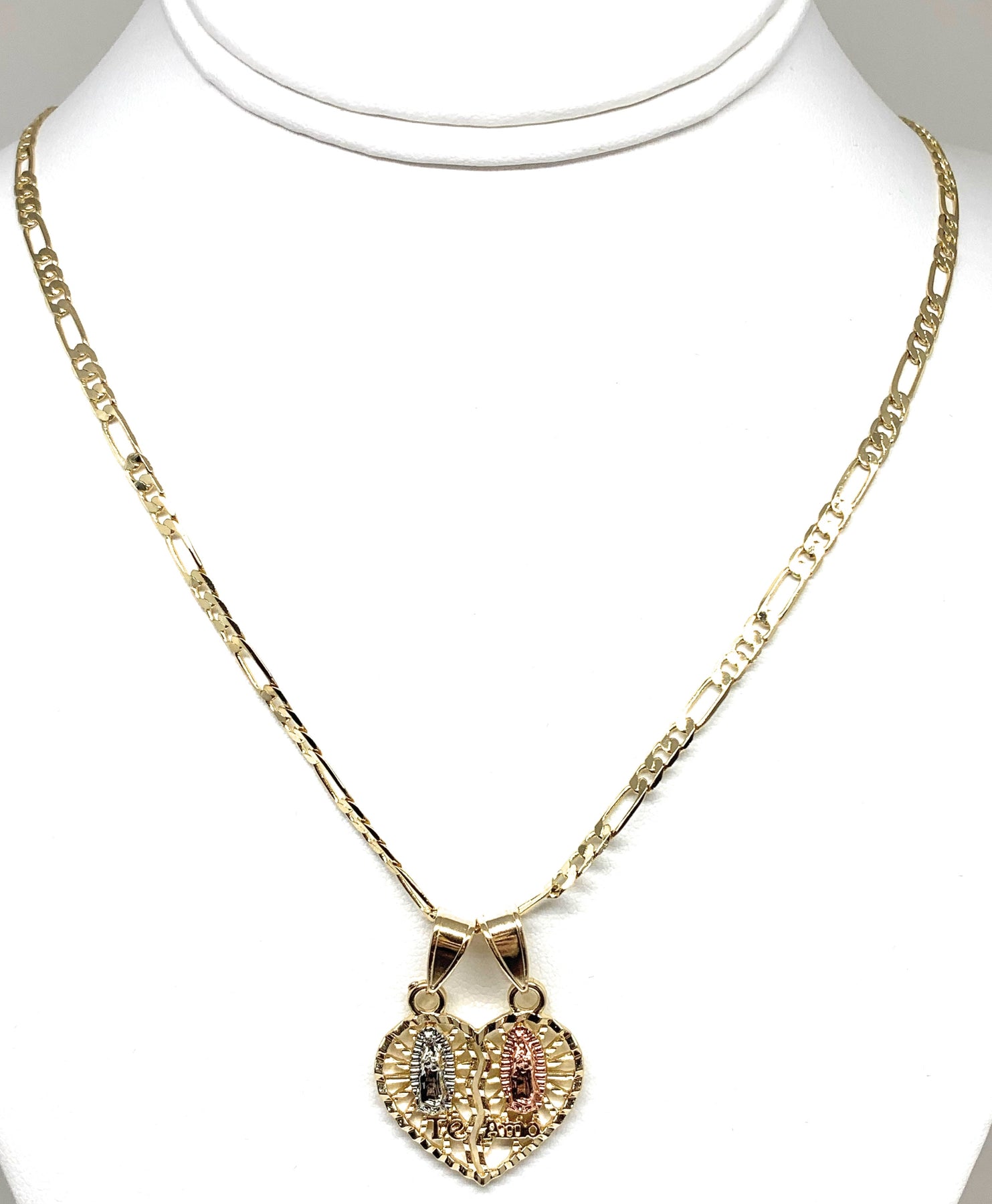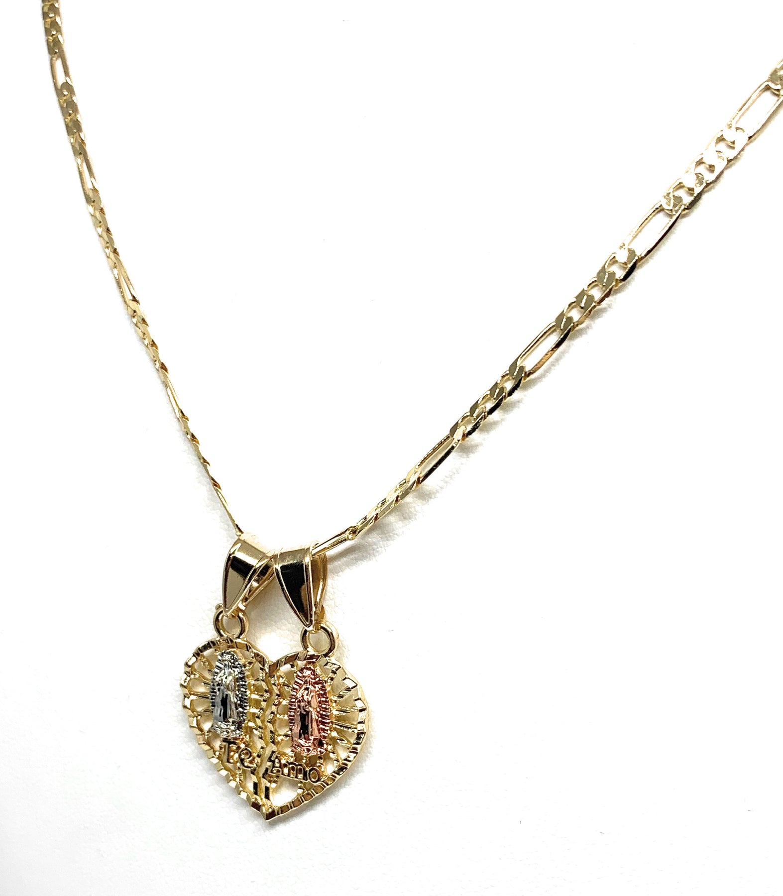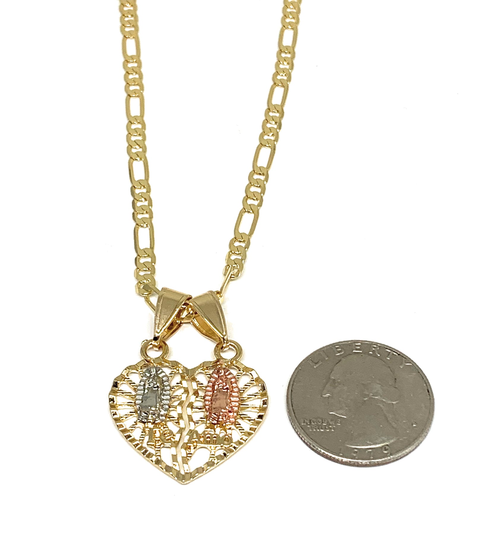 Gold Plated Tri-Color Double Virgin Mary "Te Amo" Heart Split Pendant Necklace 24" Virgen de Guadalupe