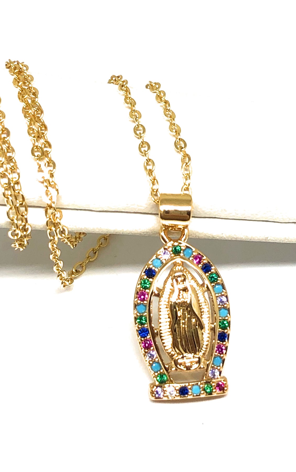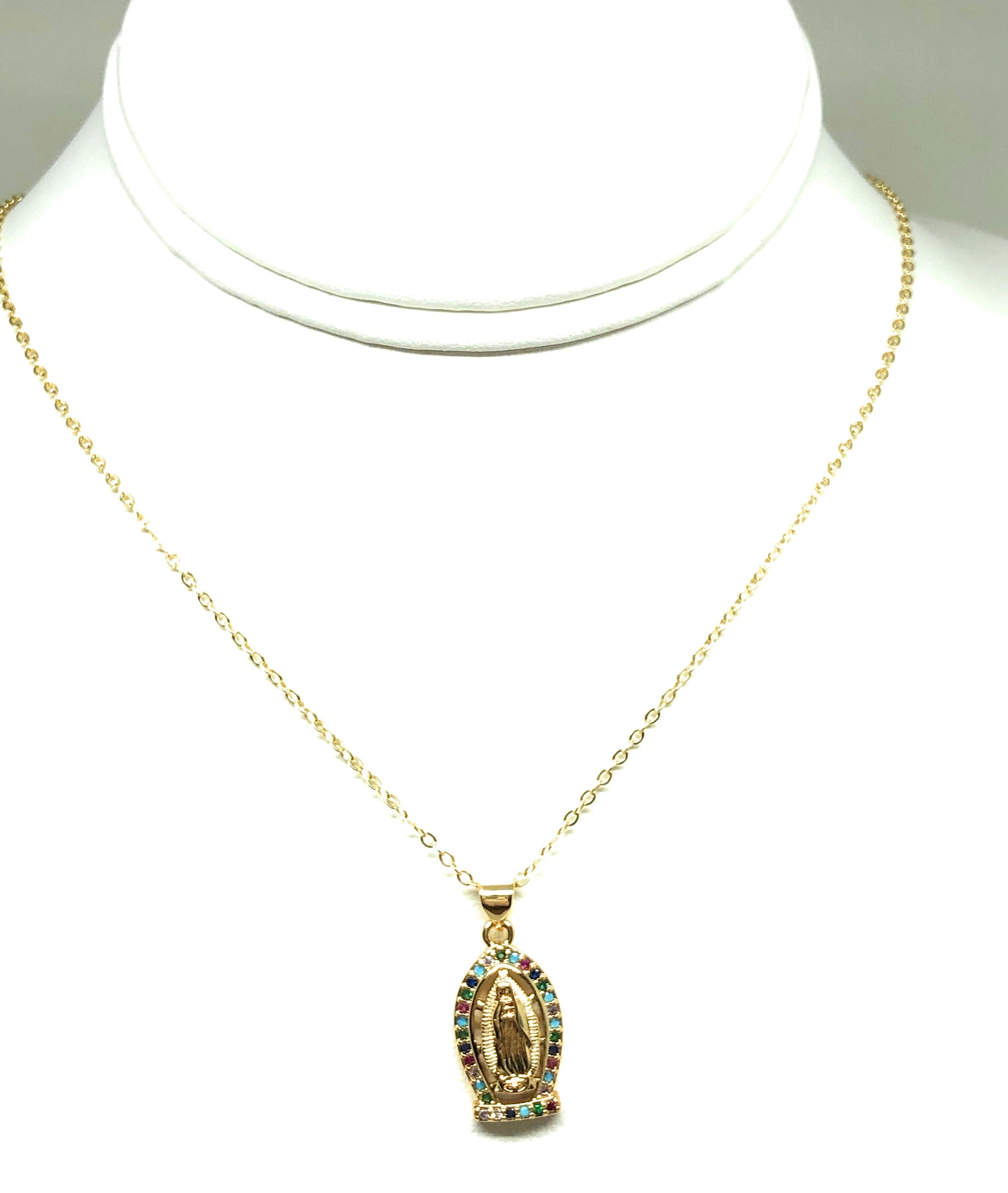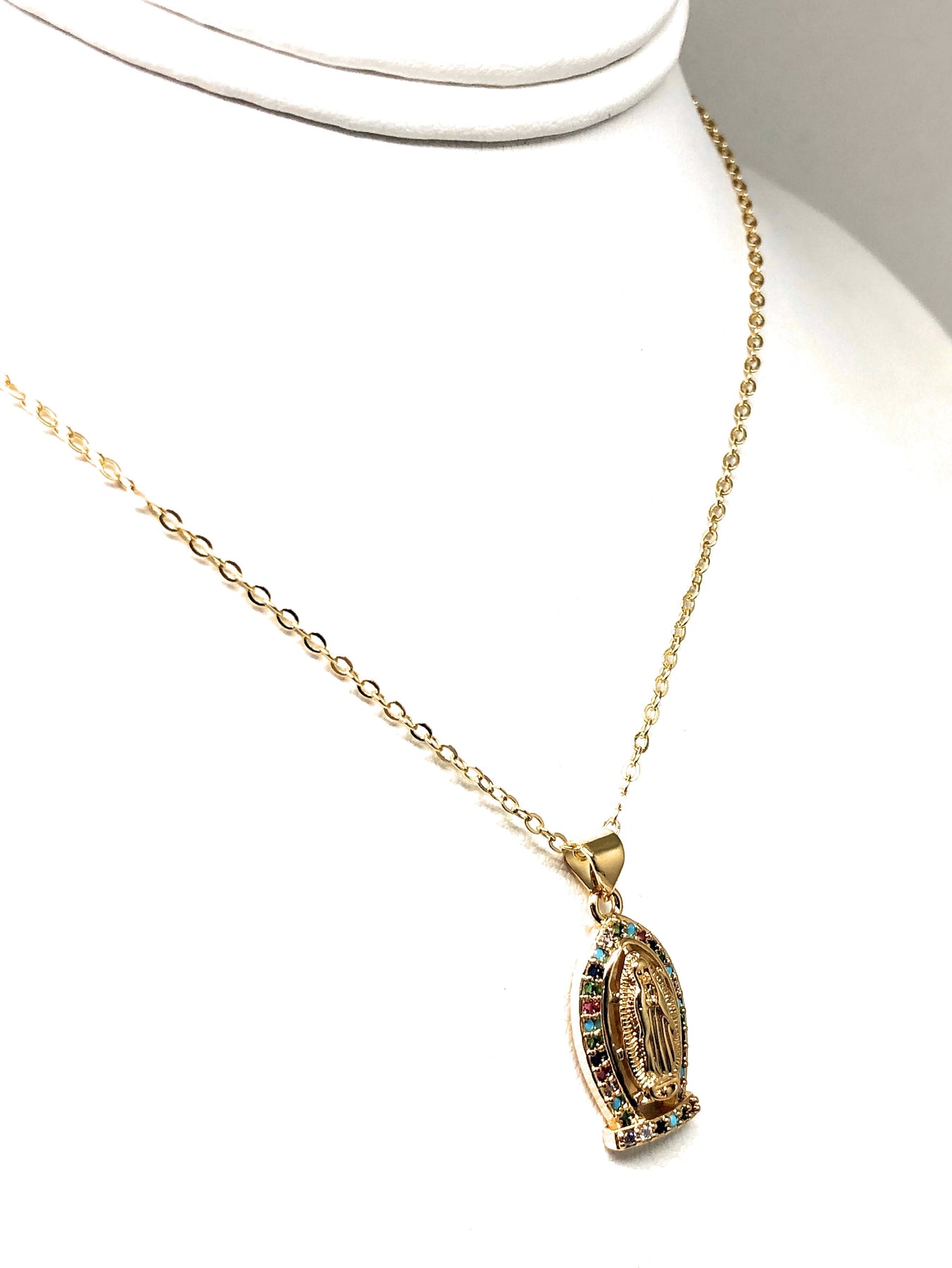 Gold Plated Virgin Mary Colorful Rhinestone Pendant Necklace 20” Virgen de Guadalupe