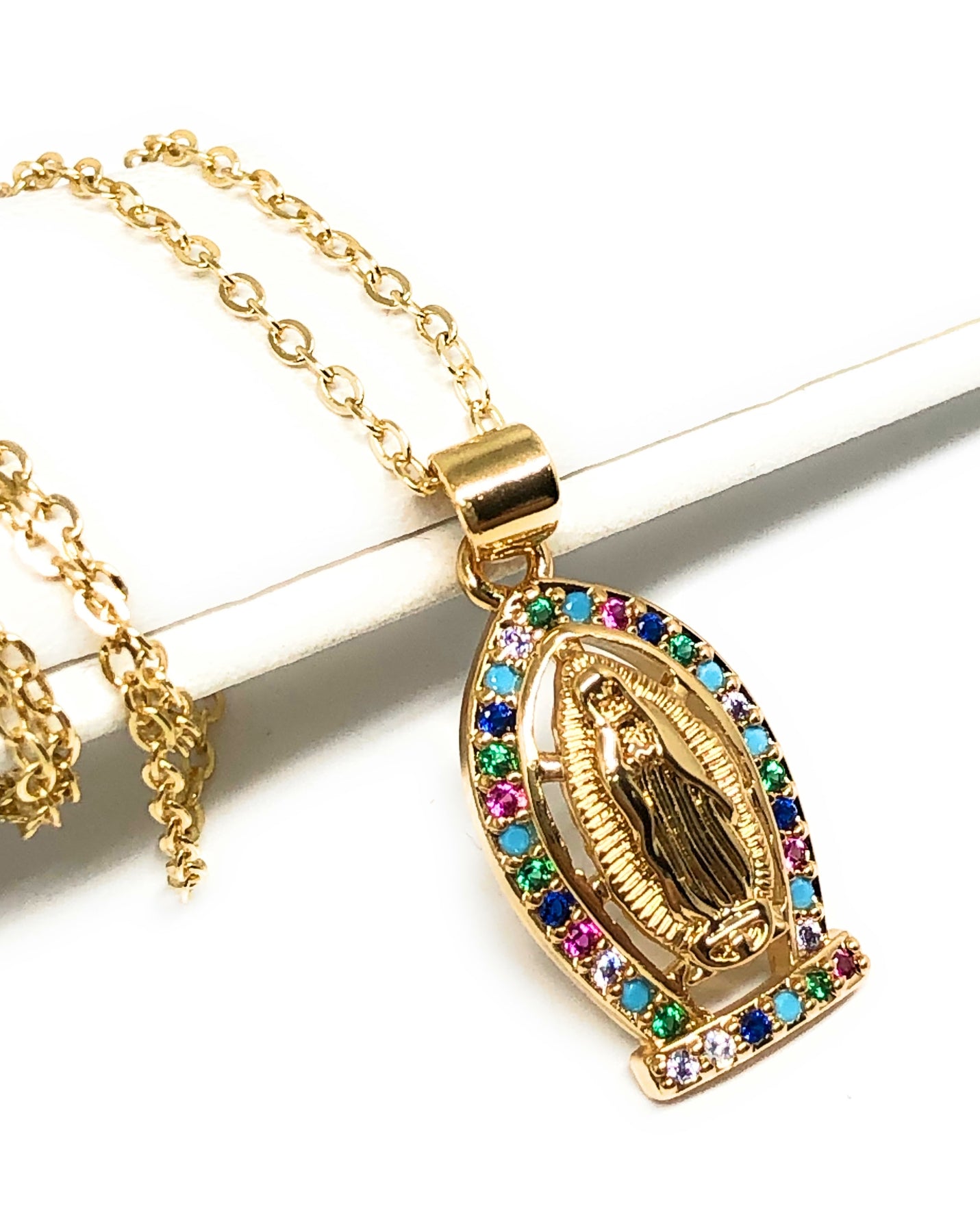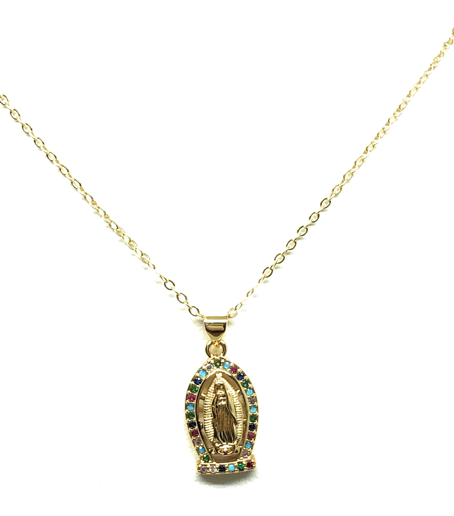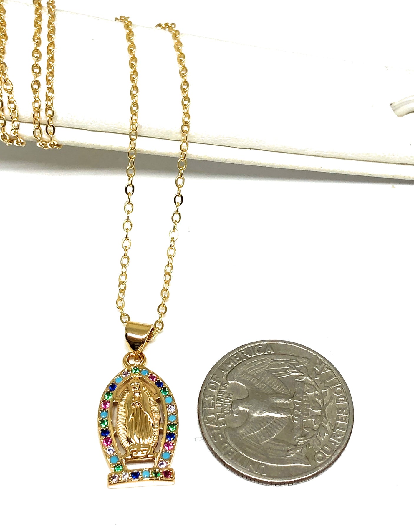 Gold Plated Virgin Mary Colorful Rhinestone Pendant Necklace 20” Virgen de Guadalupe