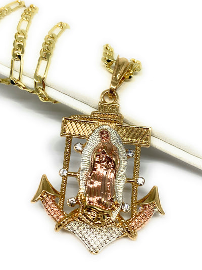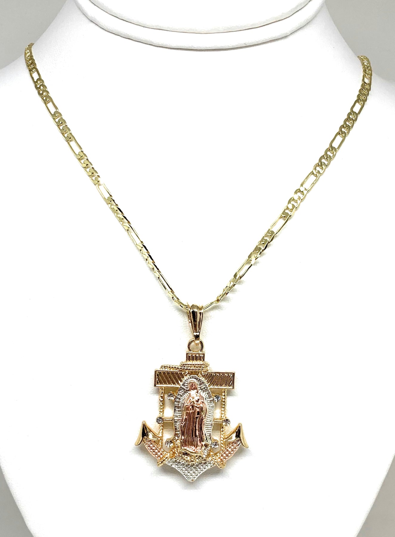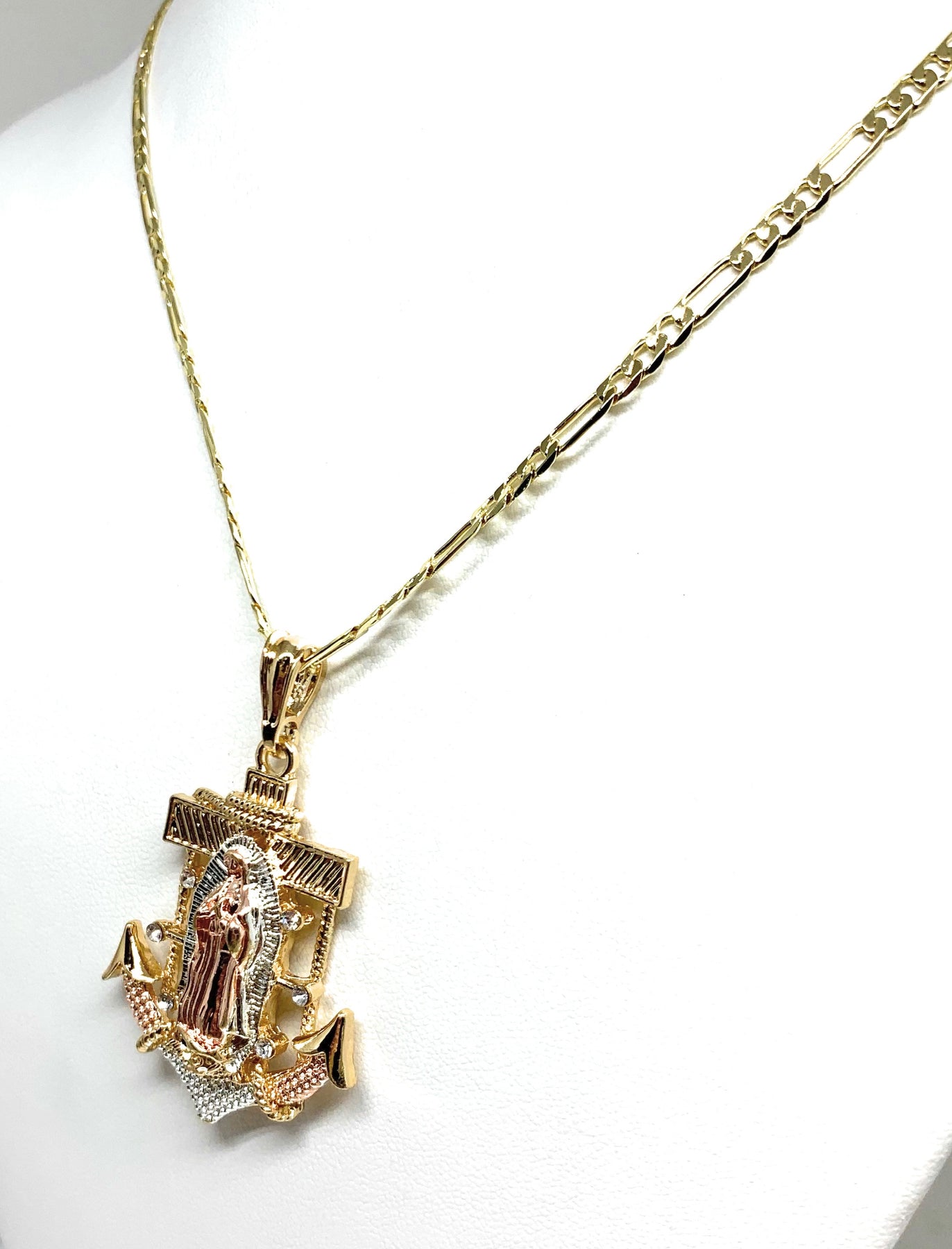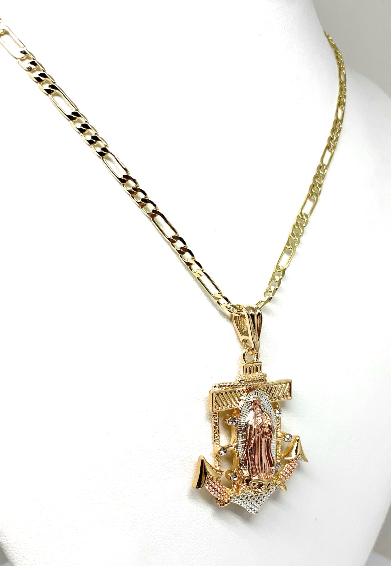 Gold Plated Tri-Color Virgin Mary Big XL Anchor Pendant 26" Figaro Chain