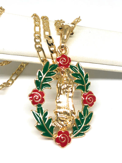 Gold Plated Tri-Color Virgin Mary Flower Pendant Necklace 24" Virgen de Guadalupe