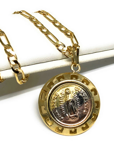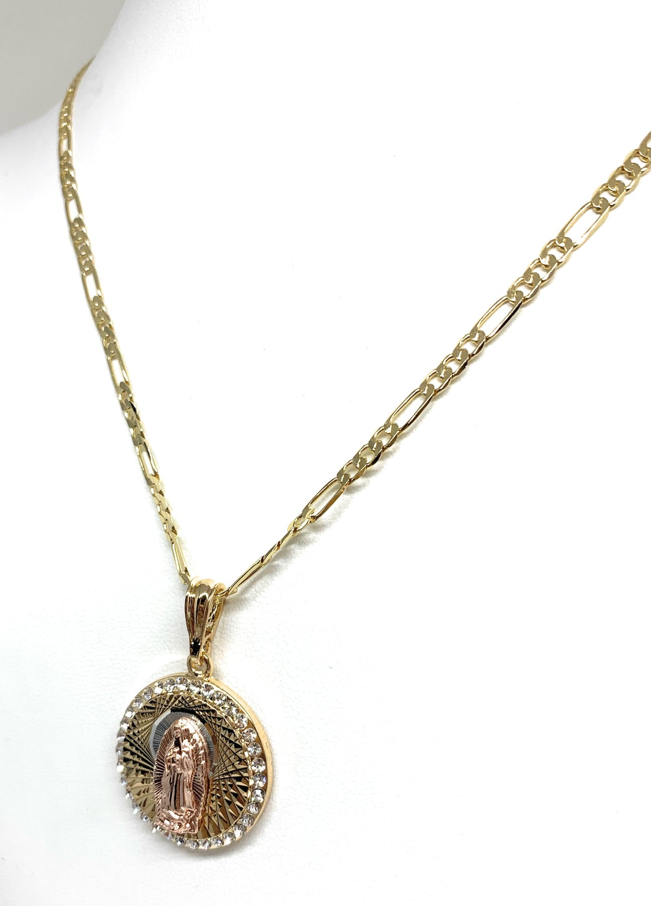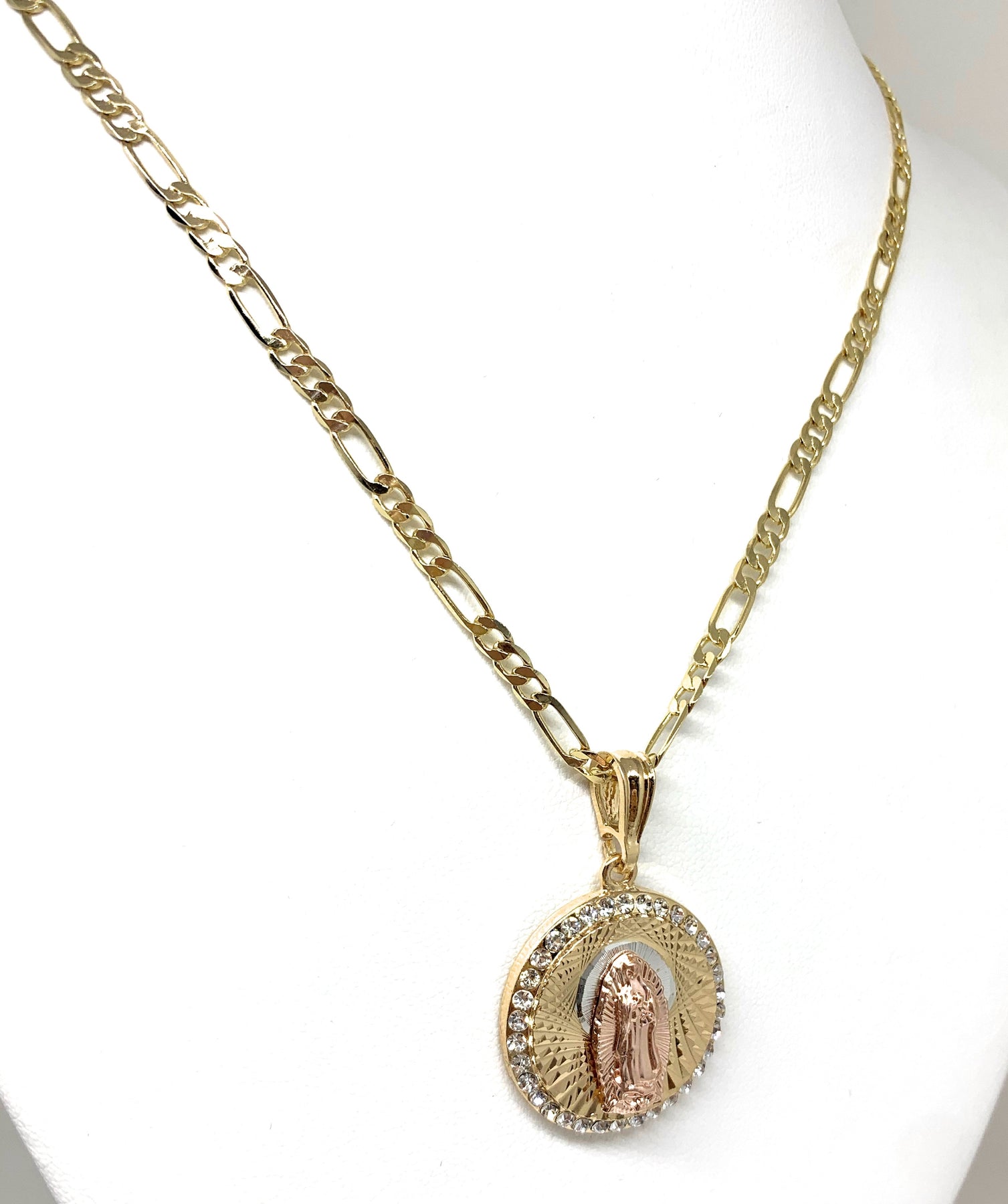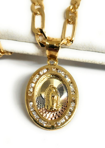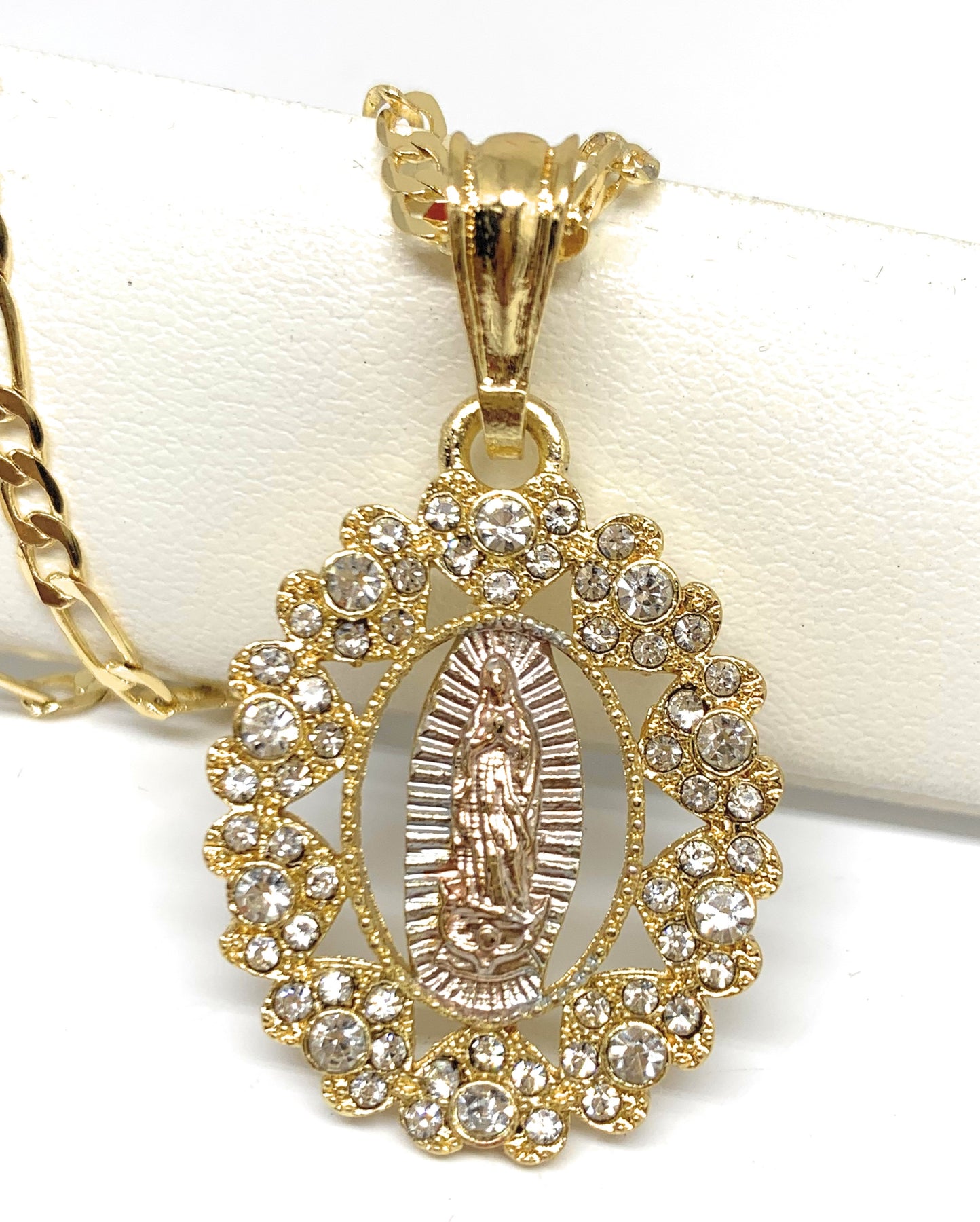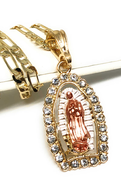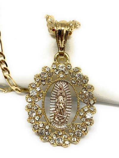 Gold Plated Tri-Color Classic Virgin Mary CZ Pendant Necklace 24" Virgen de Guadalupe Medalla