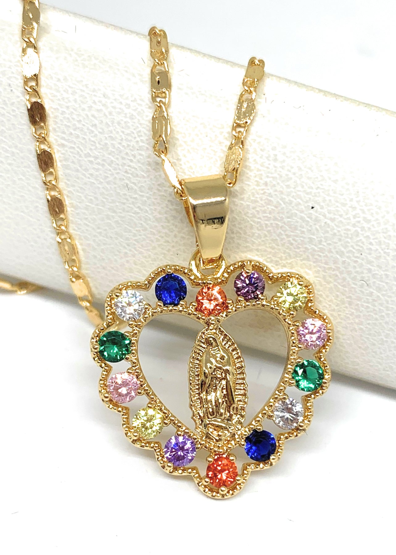 Gold Plated Virgin Mary Heart Colorful Pendant Necklace 18” Virgen Guadalupe (+FREE EARRINGS)