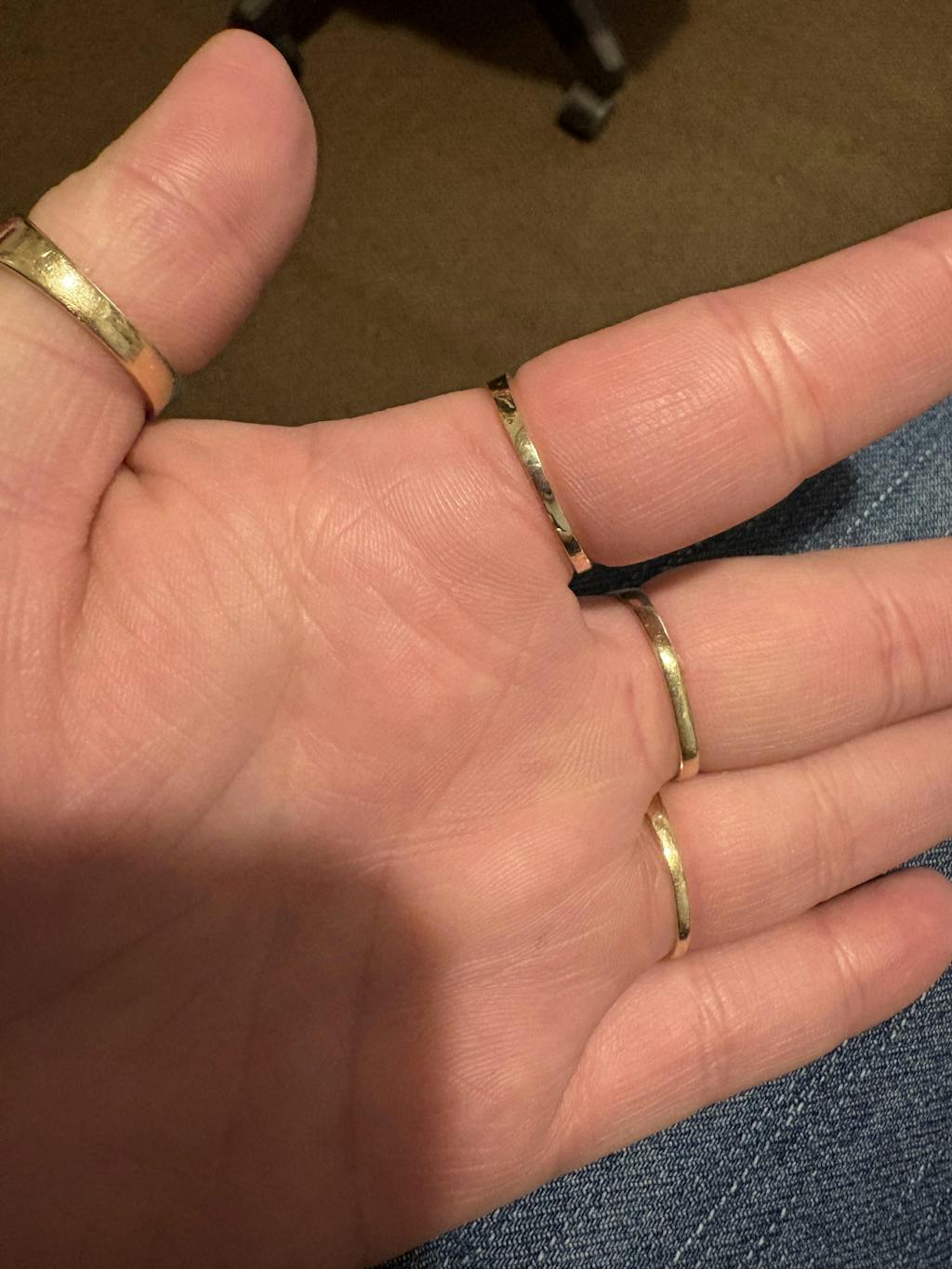 I love the ring it shins with the light a lot. It’s thin but not too thin it’s so so pretty. I got it a size 10 it fit perfectly. For reference in the picture the ring it’s next to it about 4.5 grams and this one I wanna say it around 2 on the dot. Very nice very very pretty really recommend.