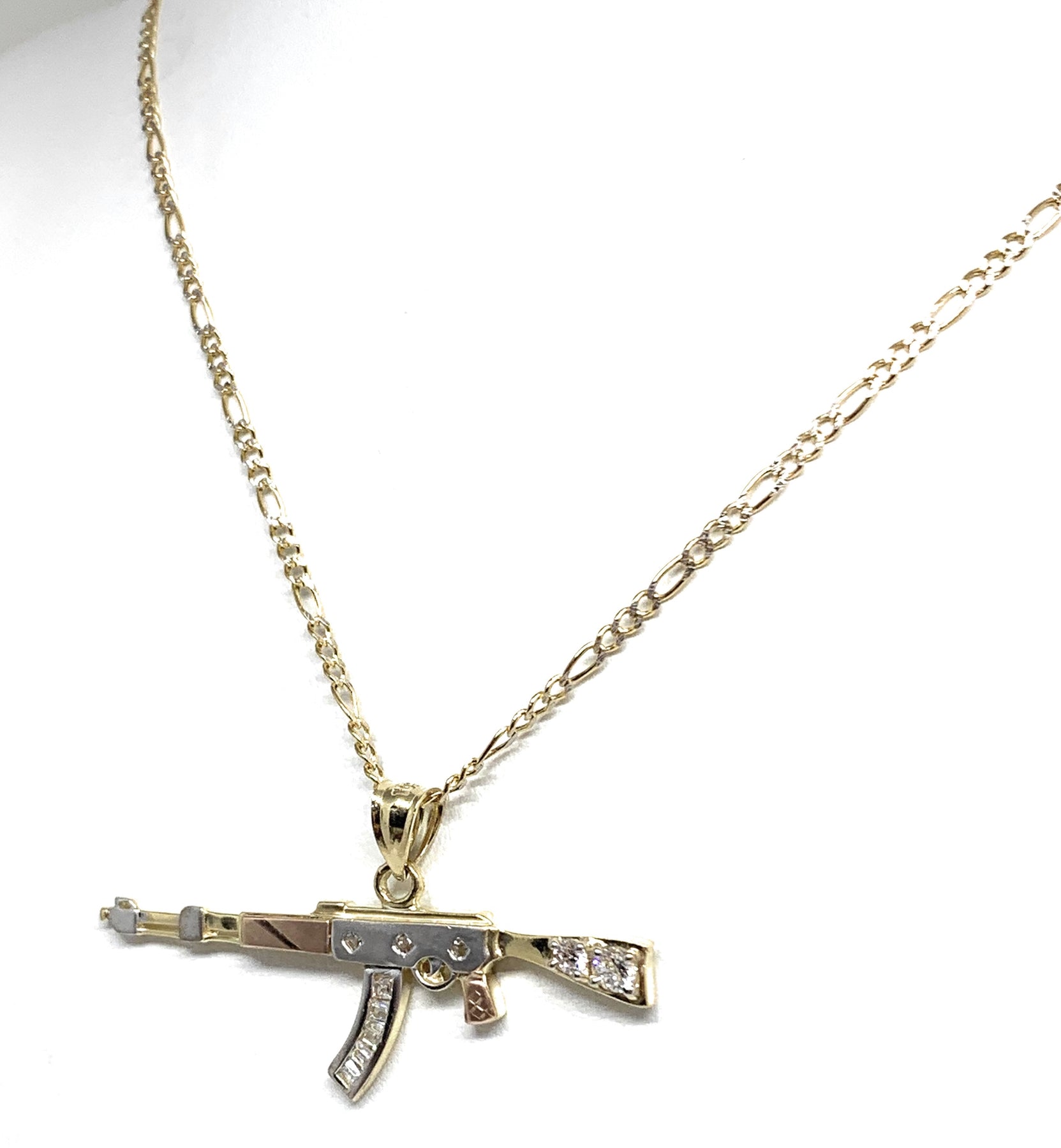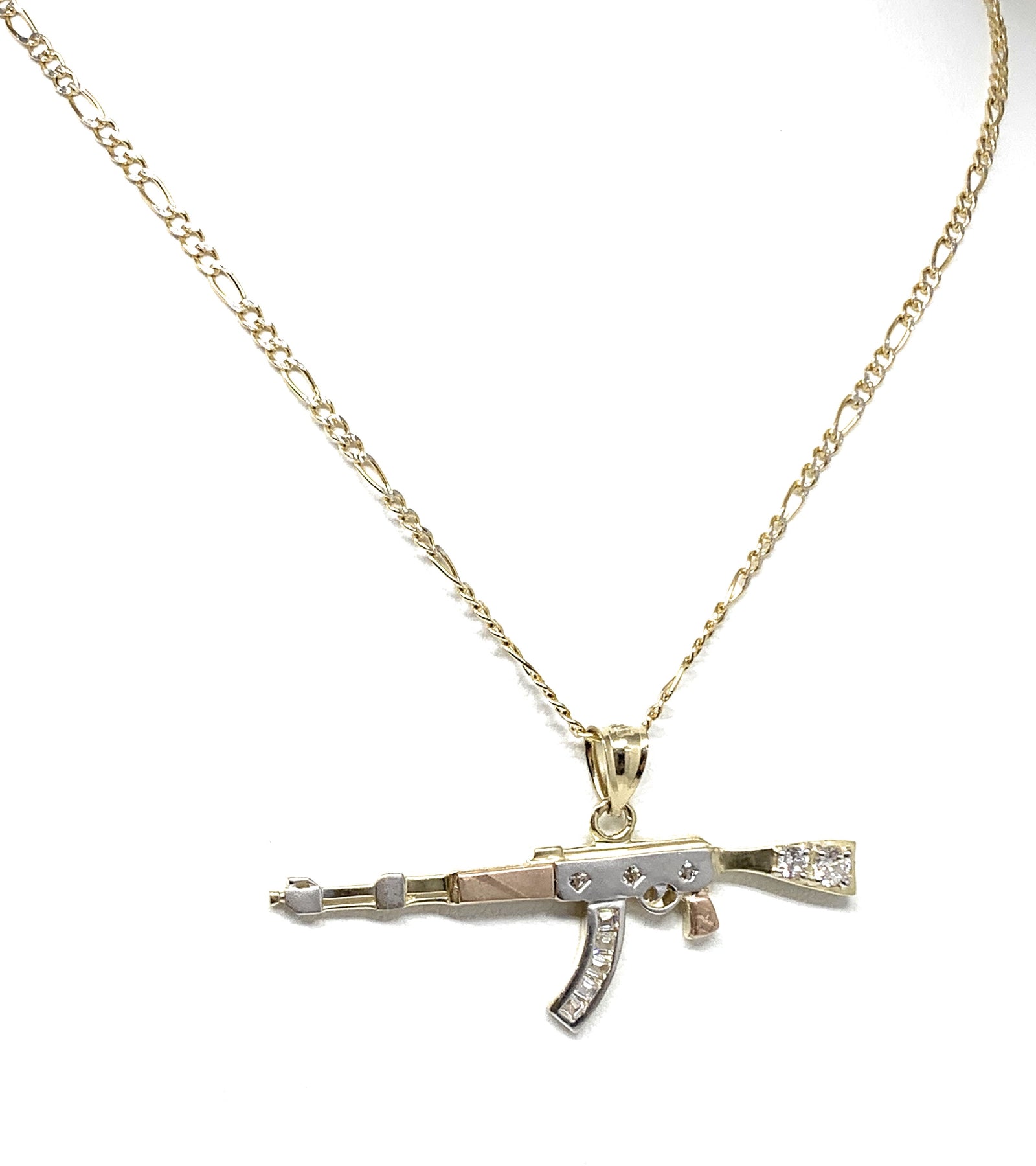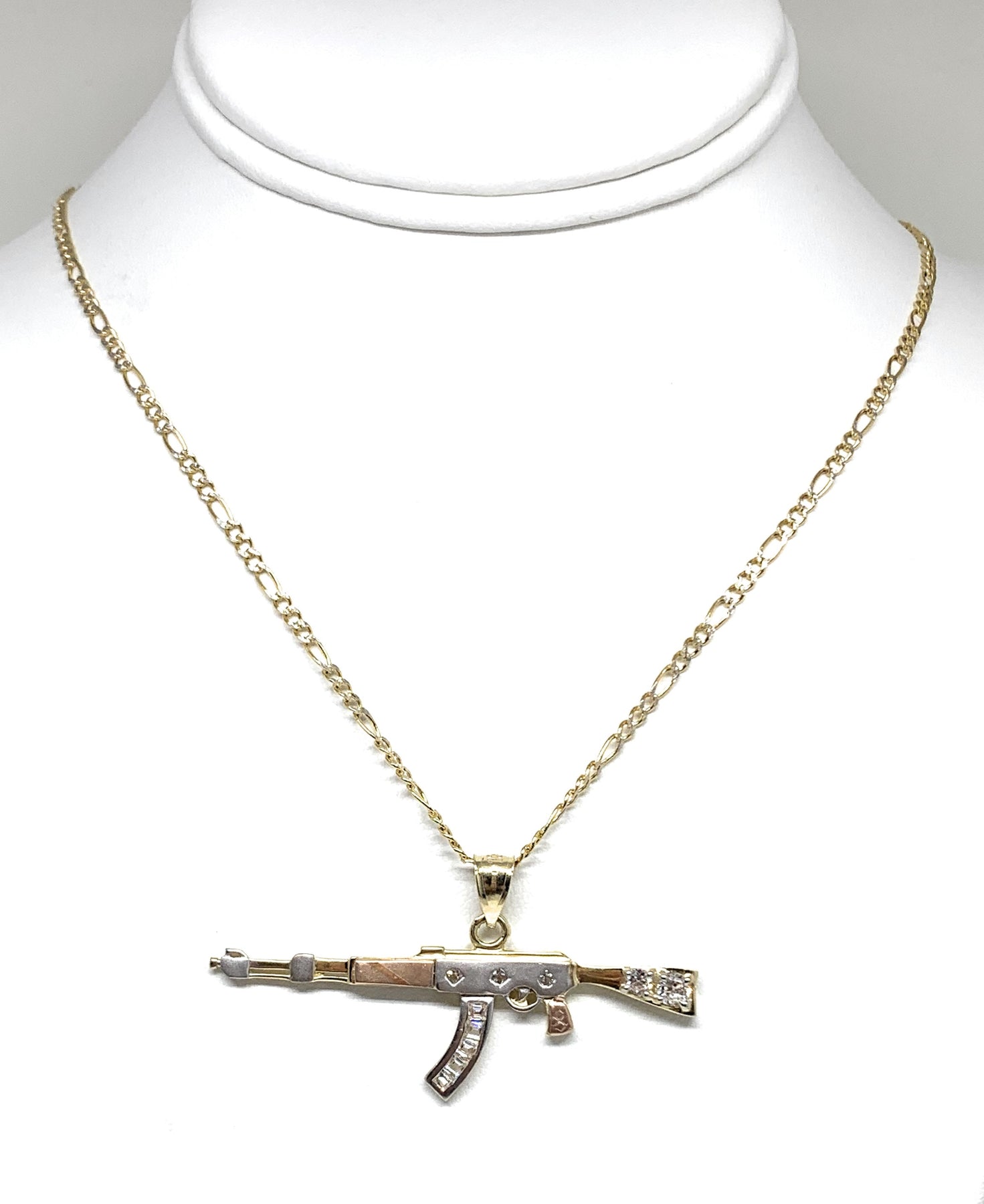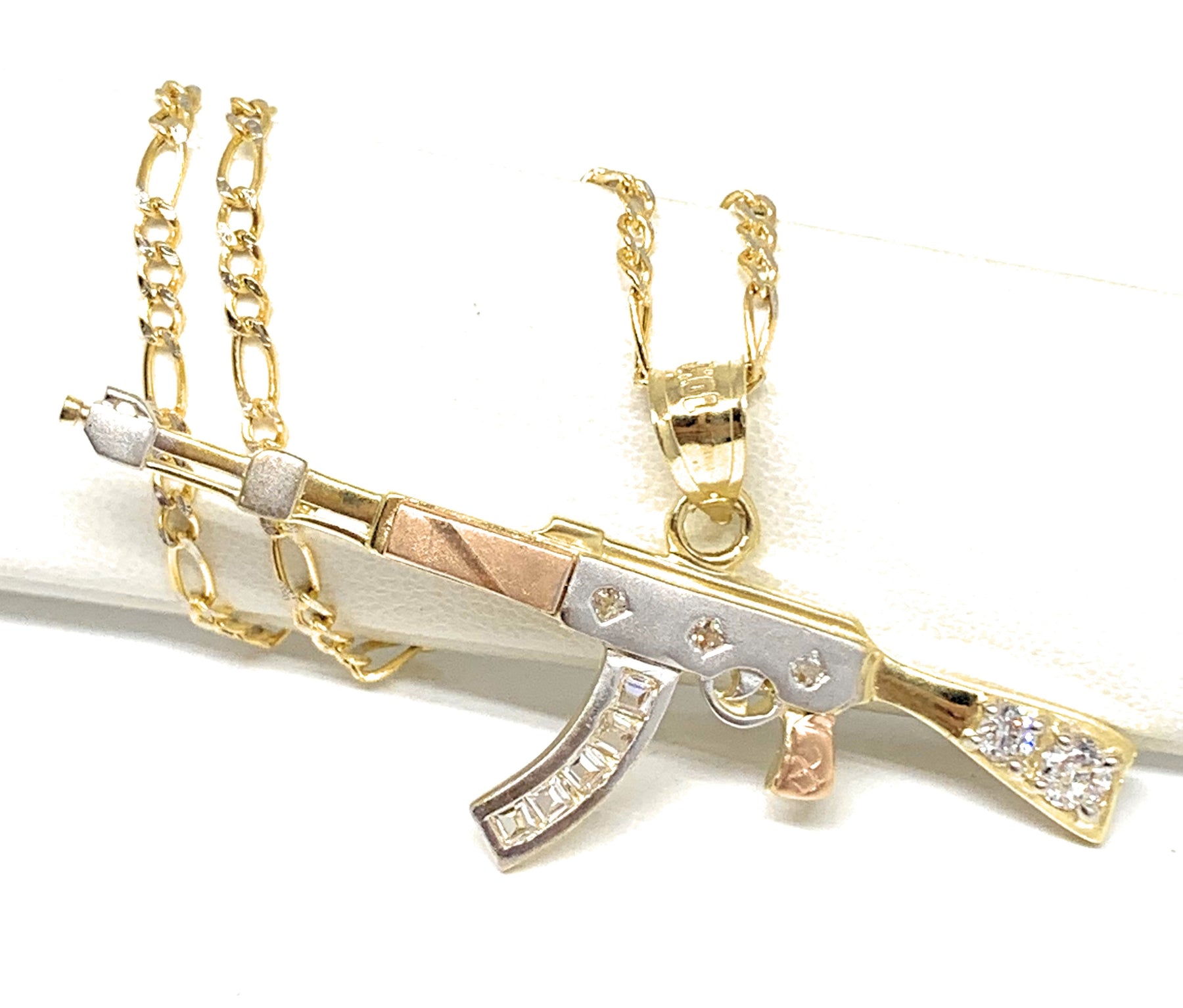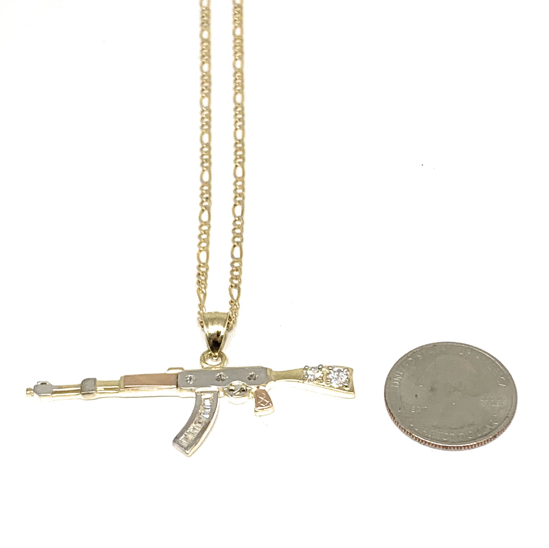 10k Solid Gold Tri-Color CZ Machine Gun AK-47 Pendant Necklace