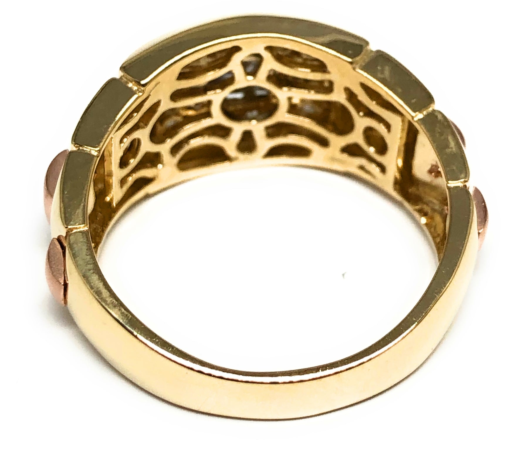 - Tri-color ring with rose and white gold and cubic zirconias.