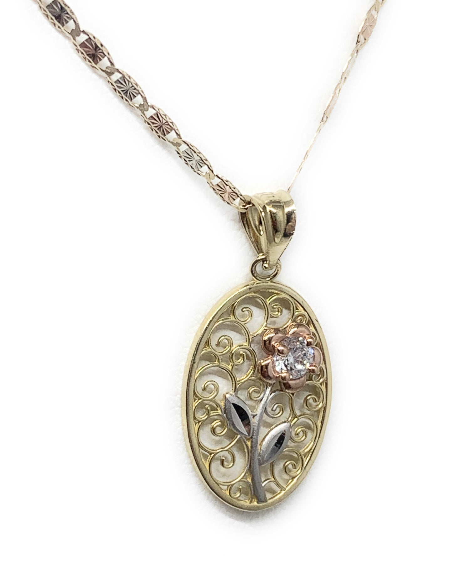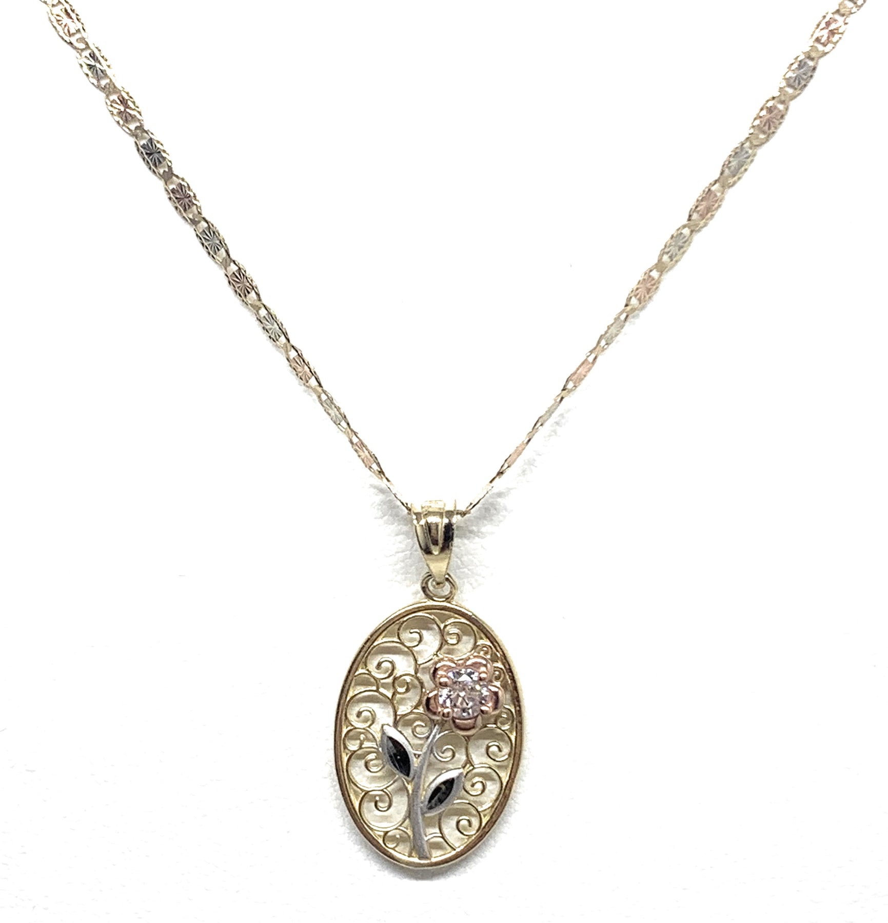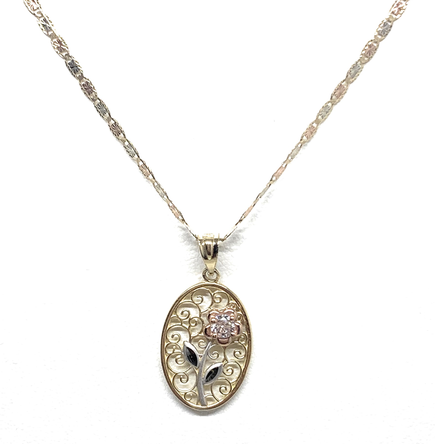 10k Solid Gold Tri-Color Flower CZ Filigran Pendant Necklace