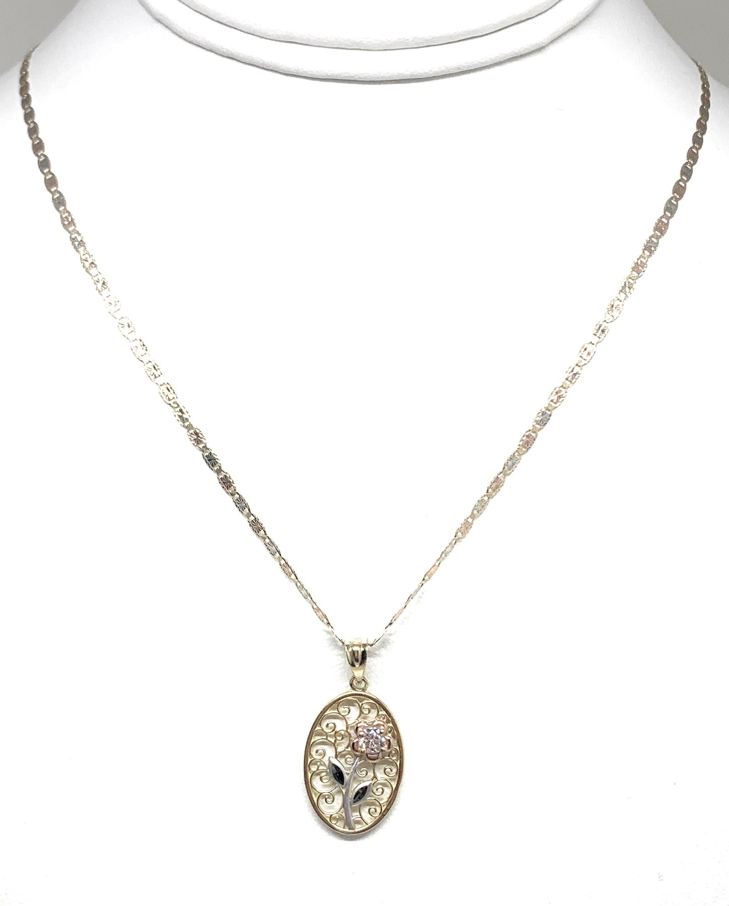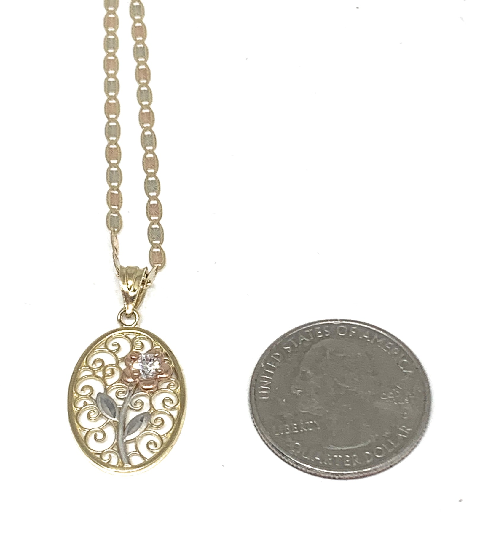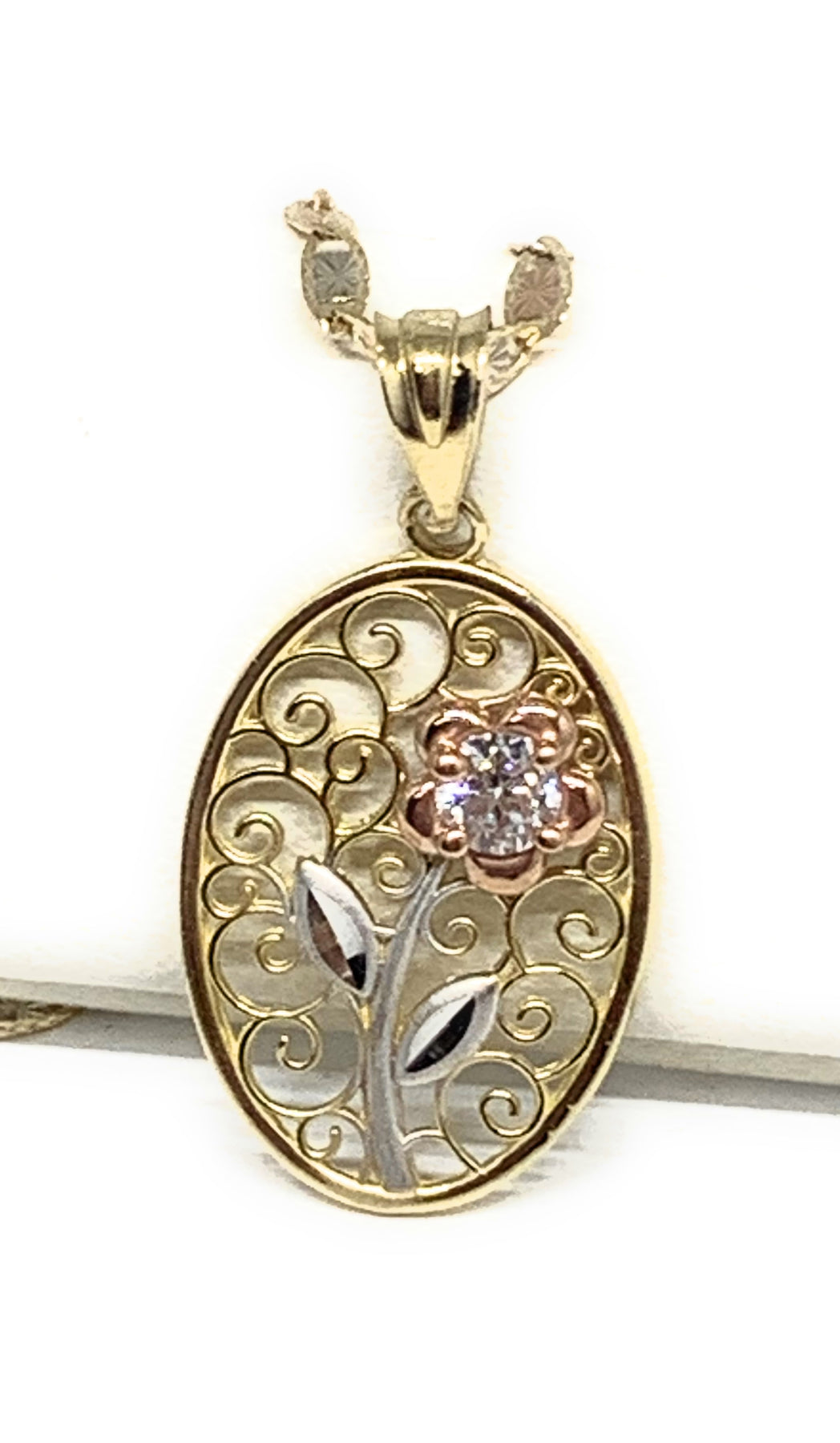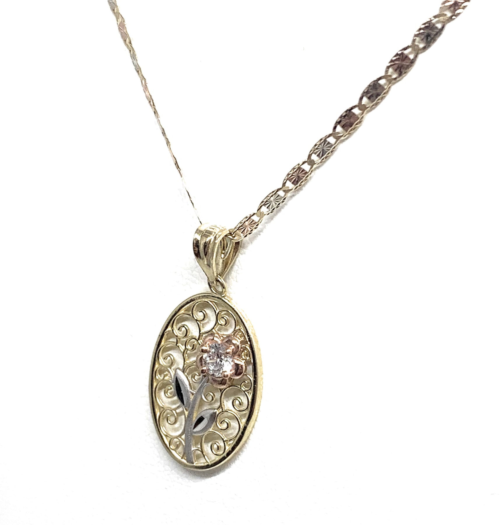 10k Solid Gold Tri-Color Flower CZ Filigran Pendant Necklace
