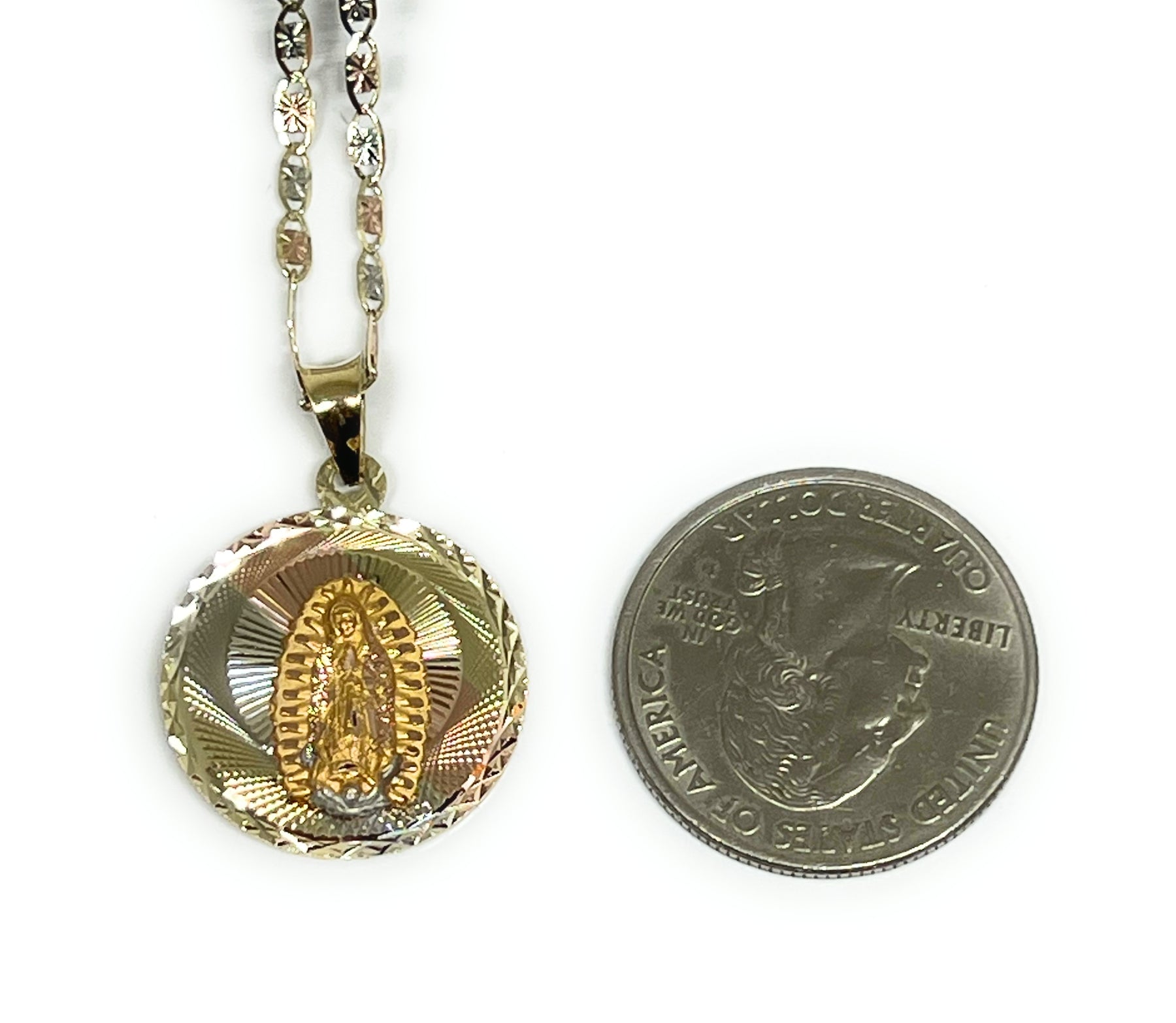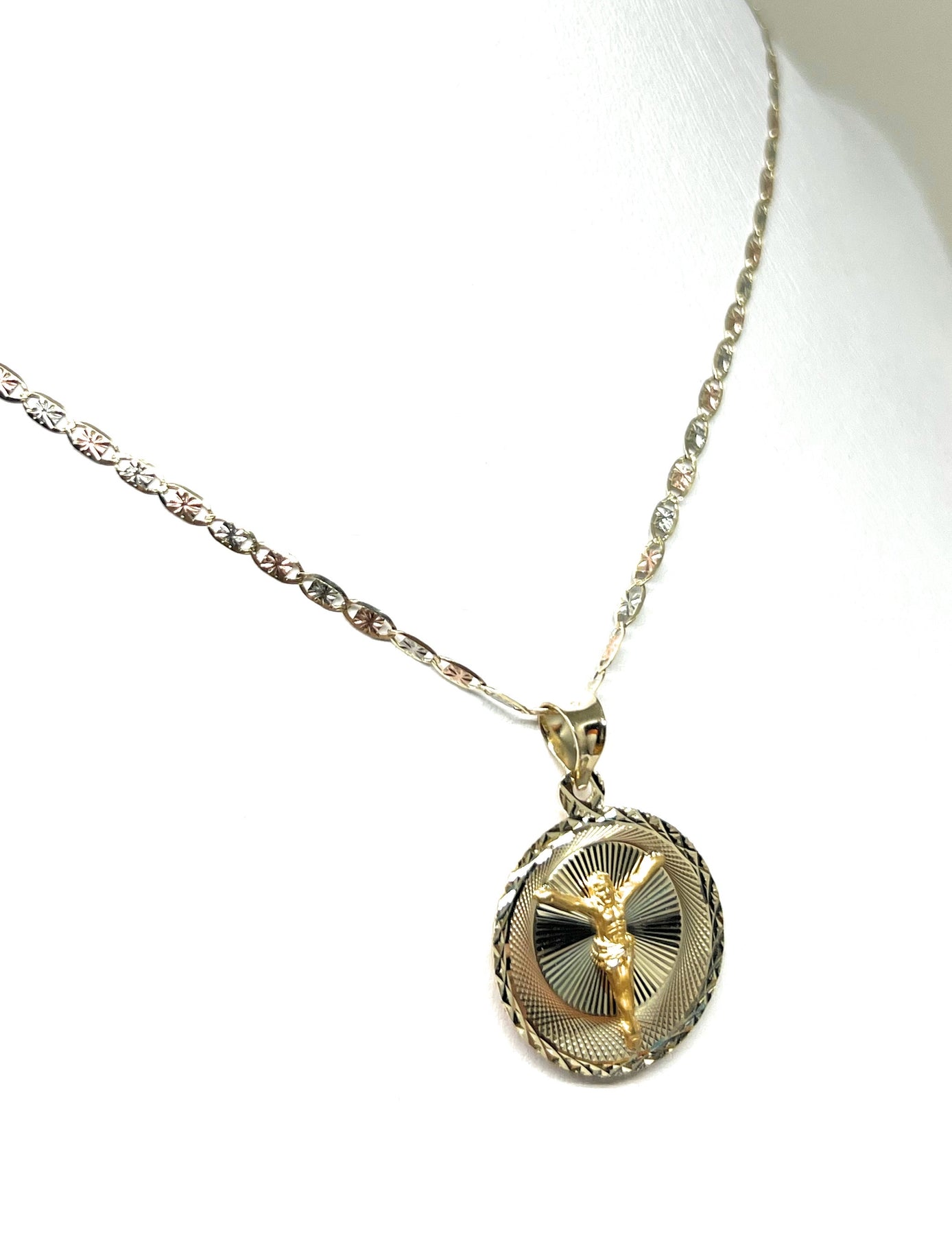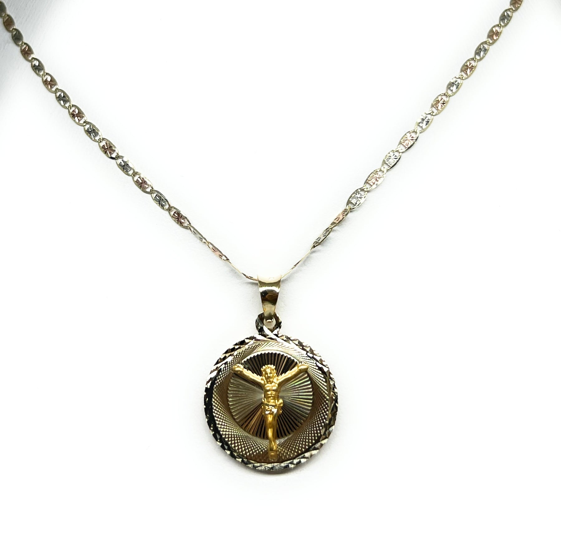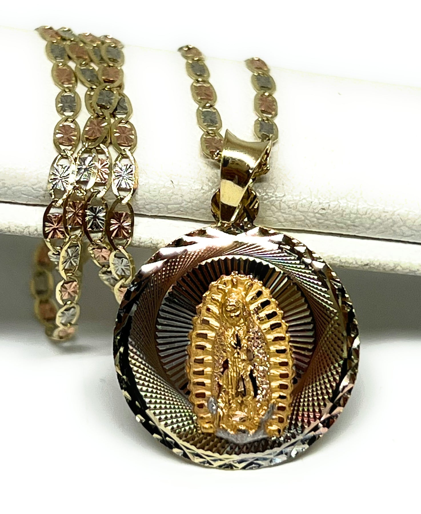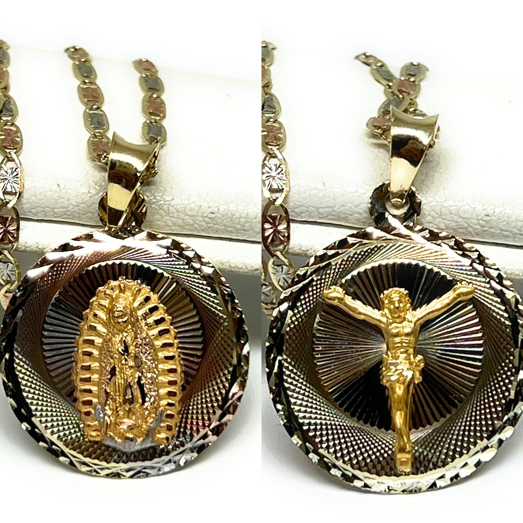 10k Solid Gold Tri-Color Jesus Body Crucifix & Virrgin Mary Double Sided Pendant Necklace (MADE IN MX)
