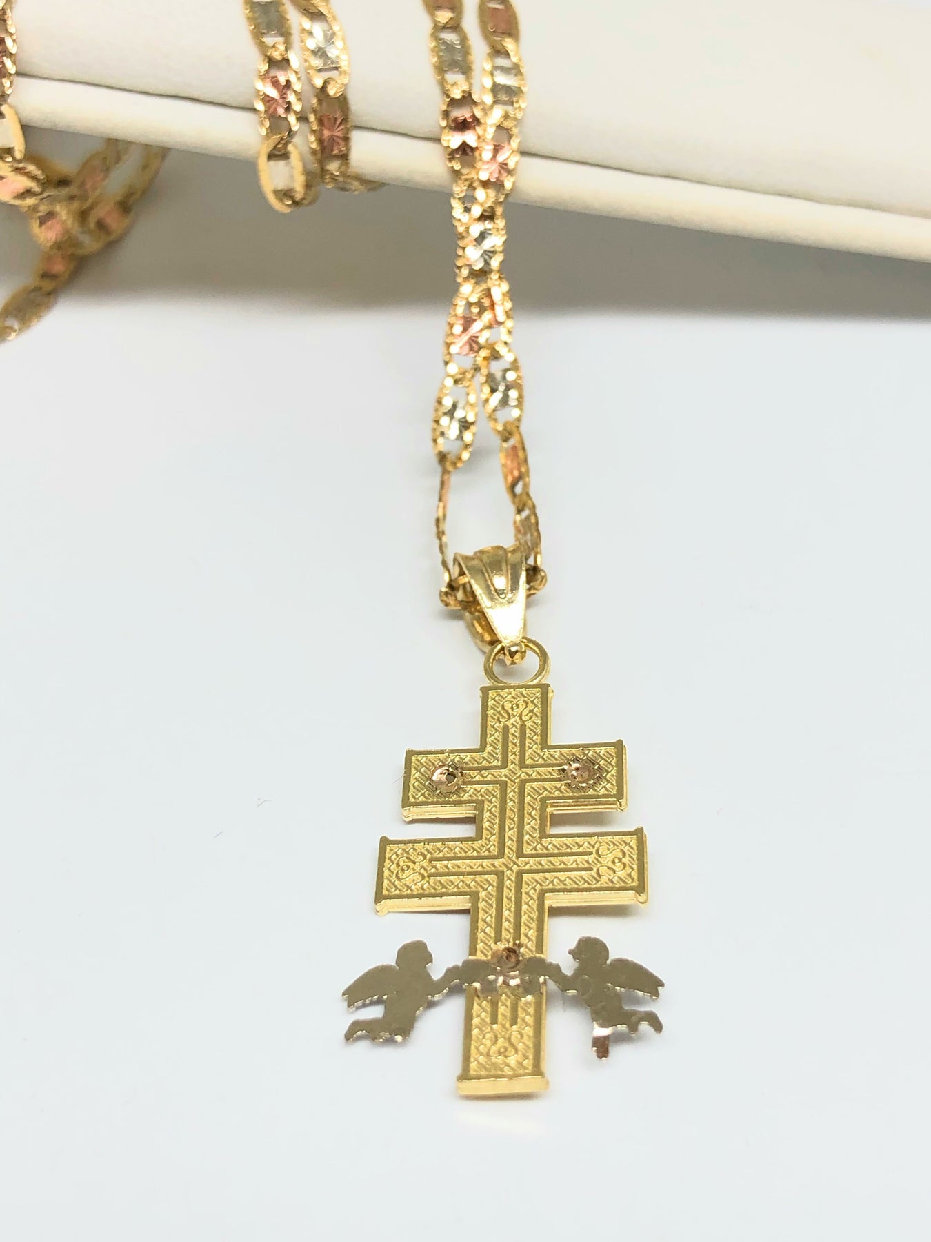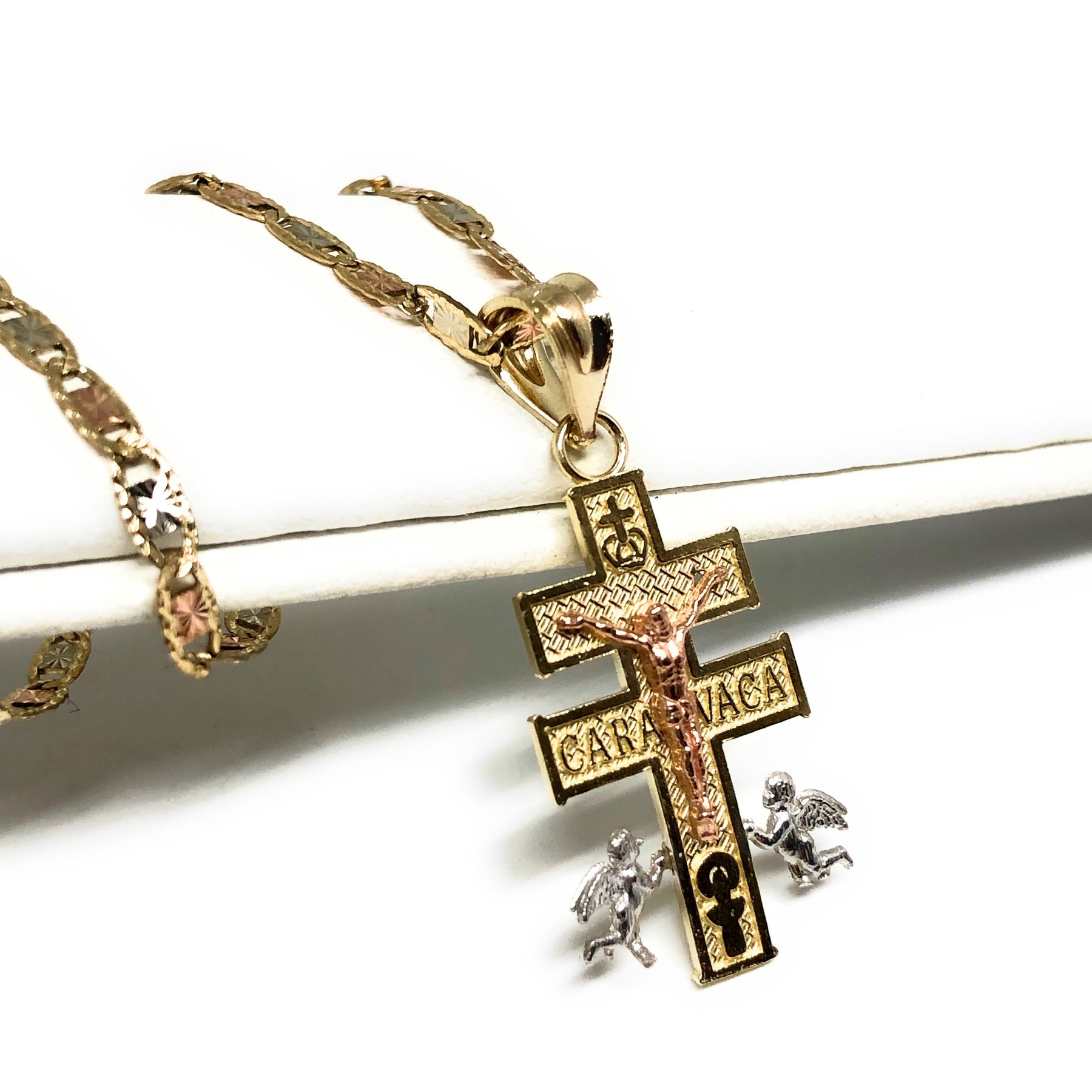 10k Solid Gold Tri-Color Jesus Caravaca Angel Crucifix Cross with Chain
