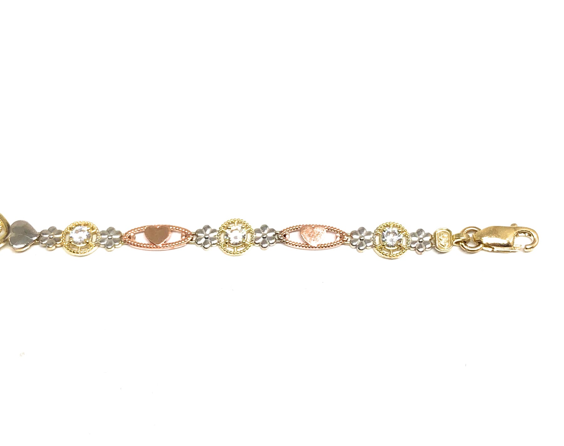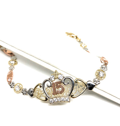 10k Solid Gold Tri-Color Mis 15 Años Crown Brracelet Cubic Zirconia 7.5"