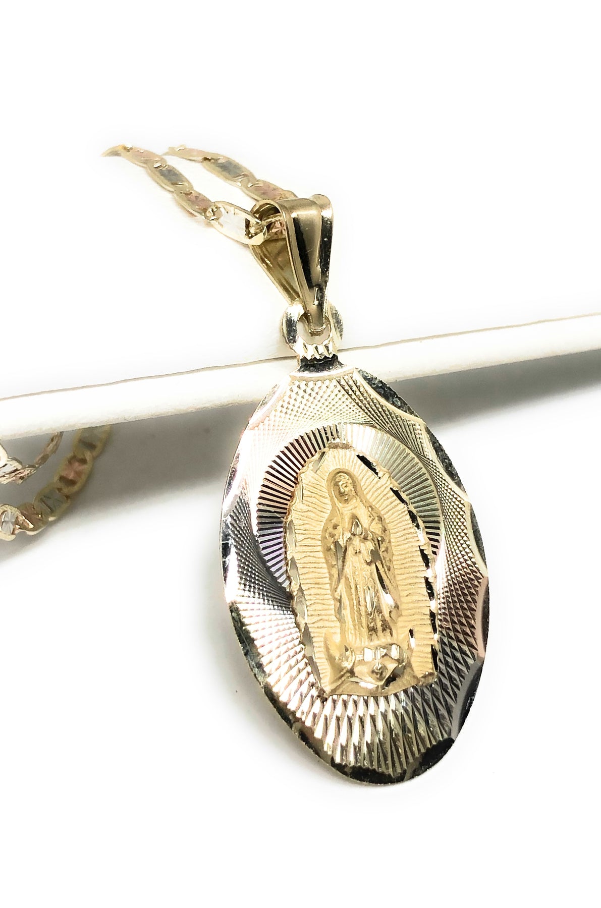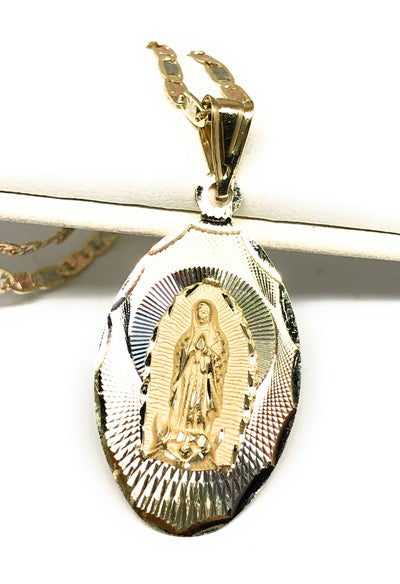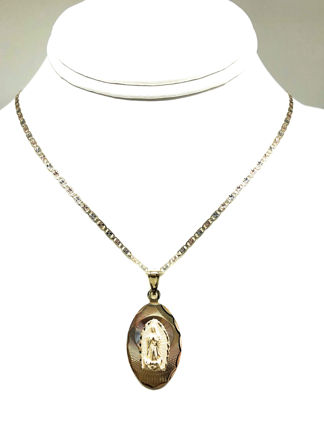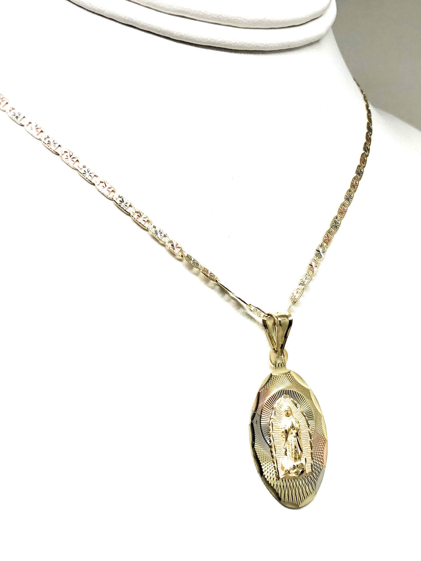 10k Solid Gold Tri-Color Oval Virrgin Mary Pendant Necklace Virrgen Gaudalupe Valentina Chain