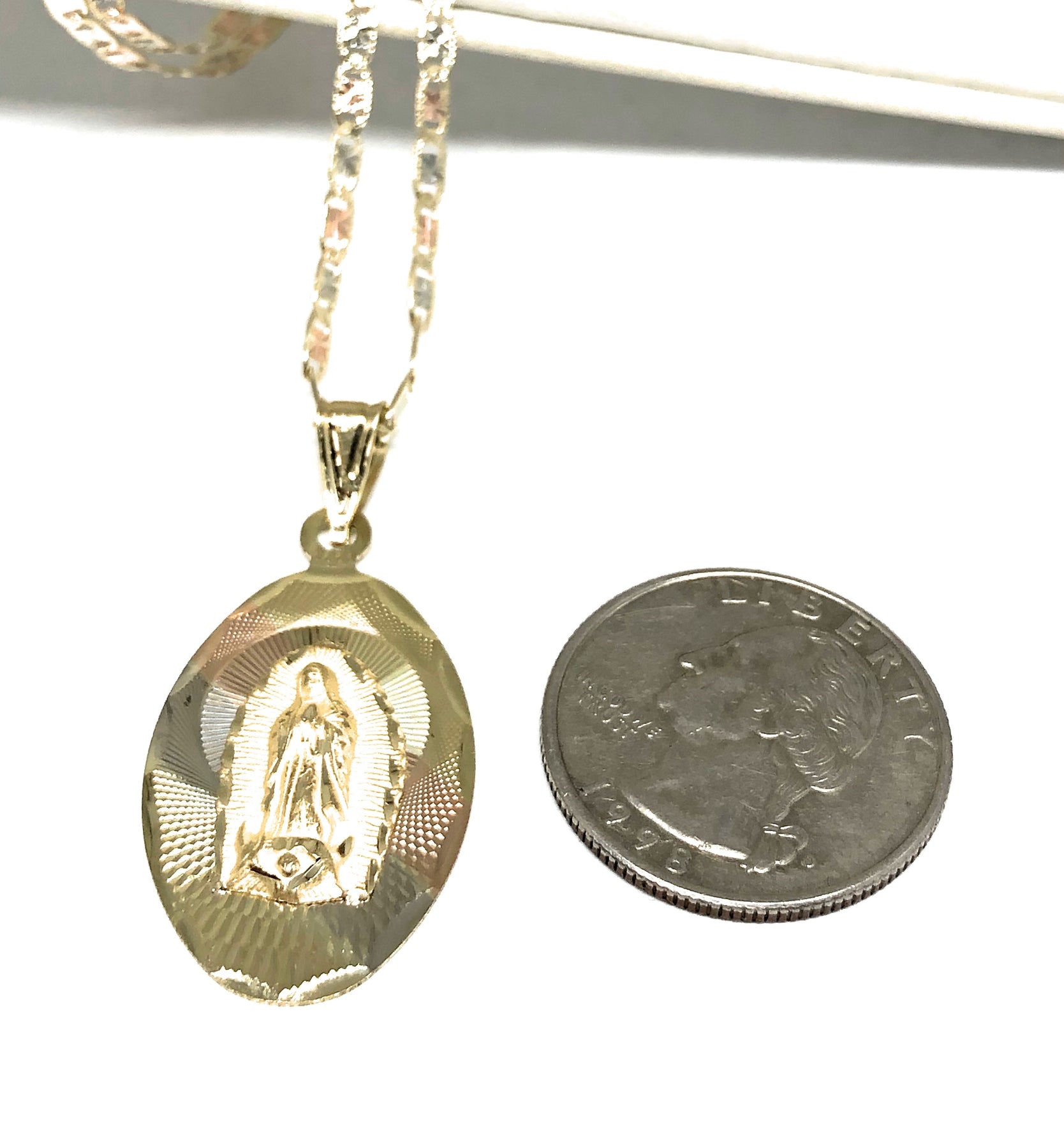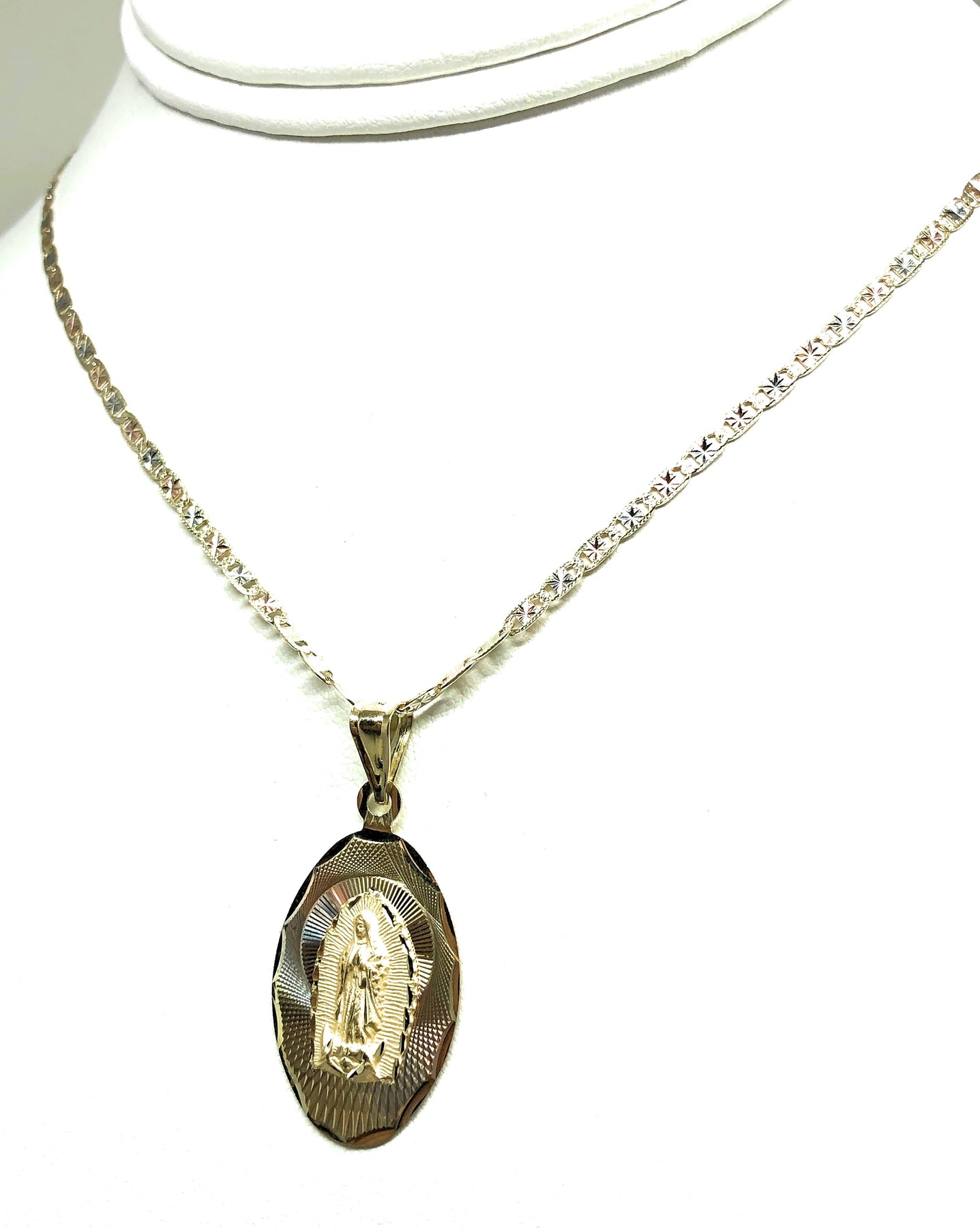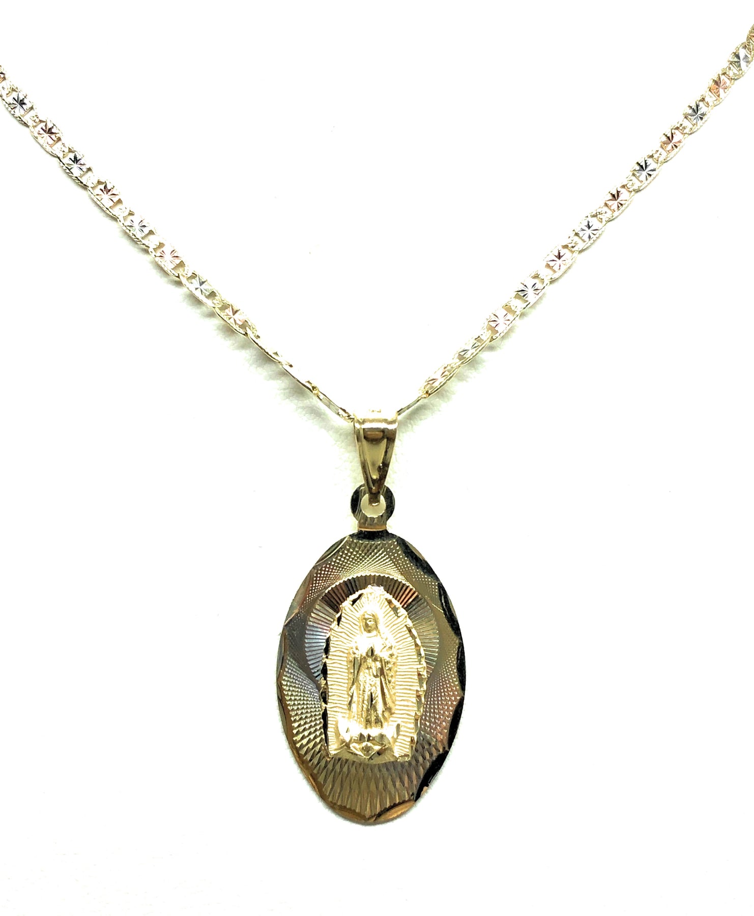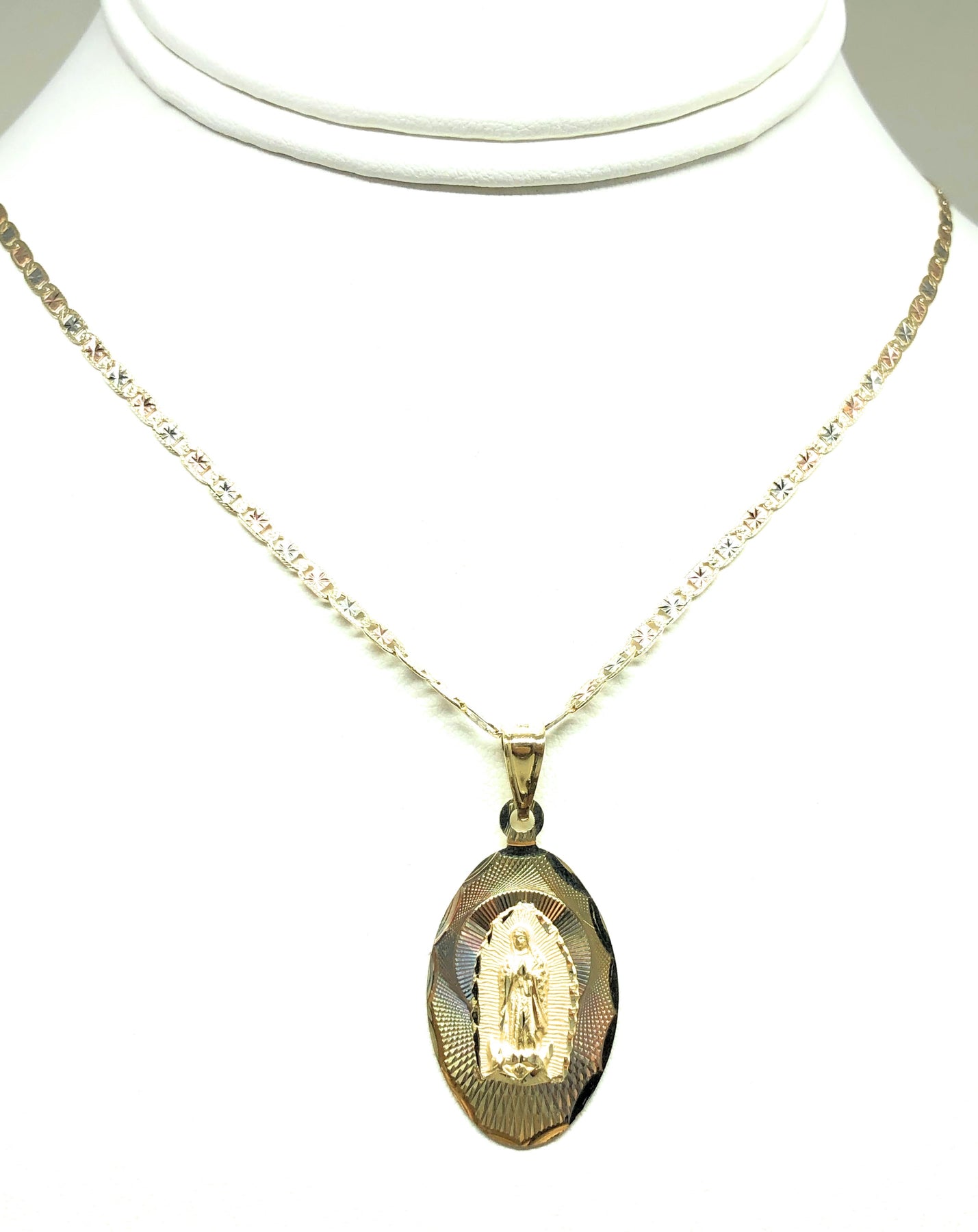 10k Solid Gold Tri-Color Oval Virrgin Mary Pendant Necklace Virrgen Gaudalupe Valentina Chain