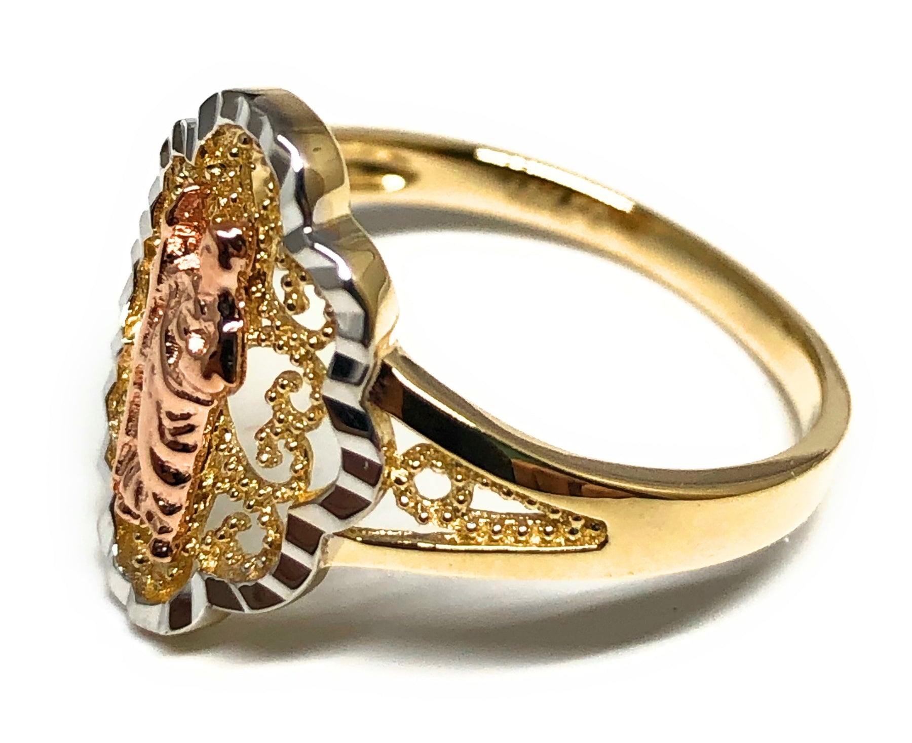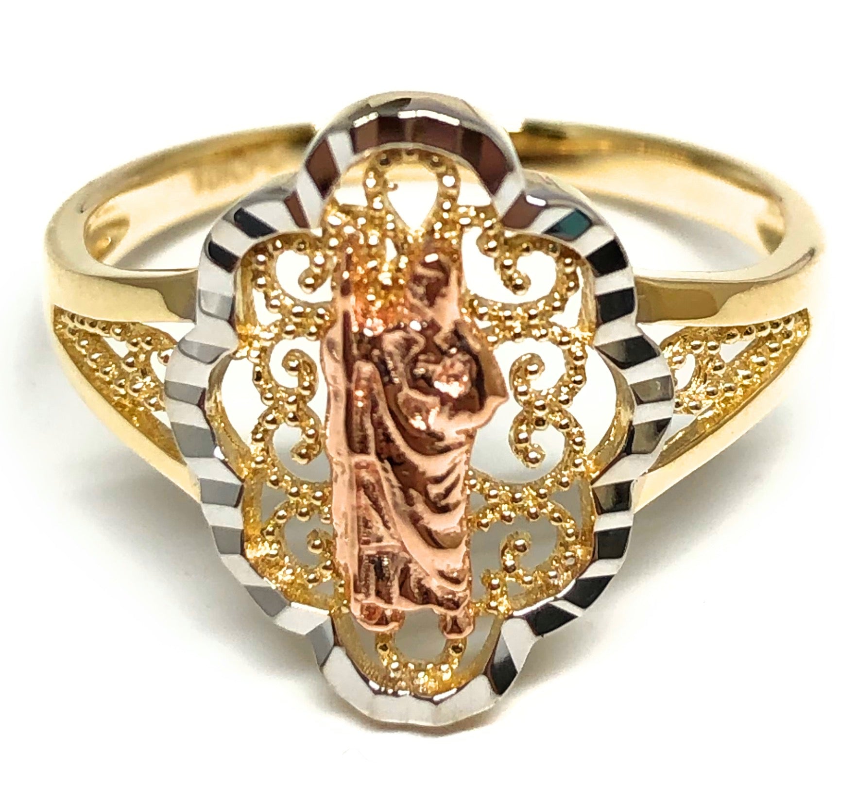 - Tri-Color Gold San Judas Classic Filigree ring is 10k solid gold guaranteed.