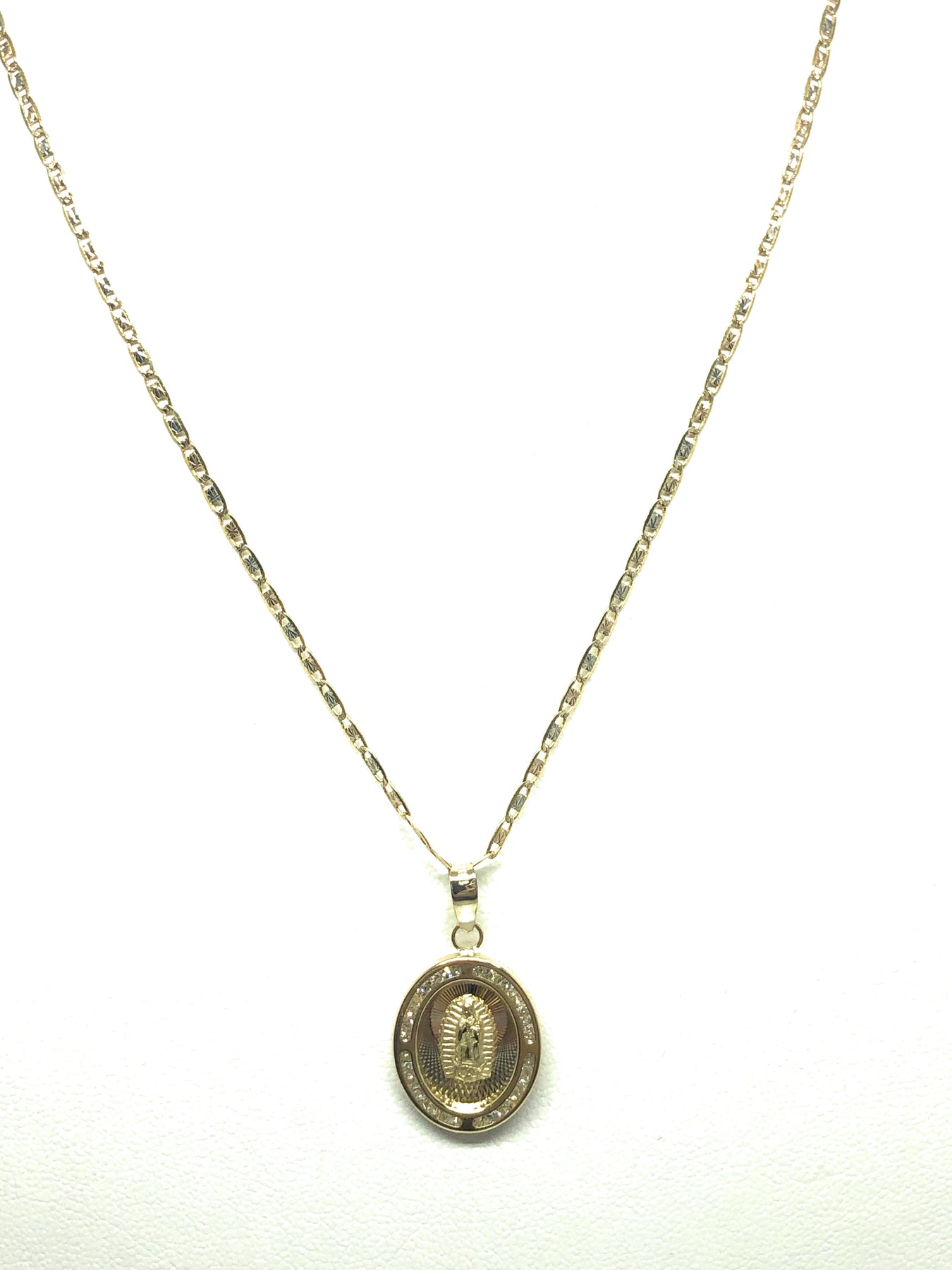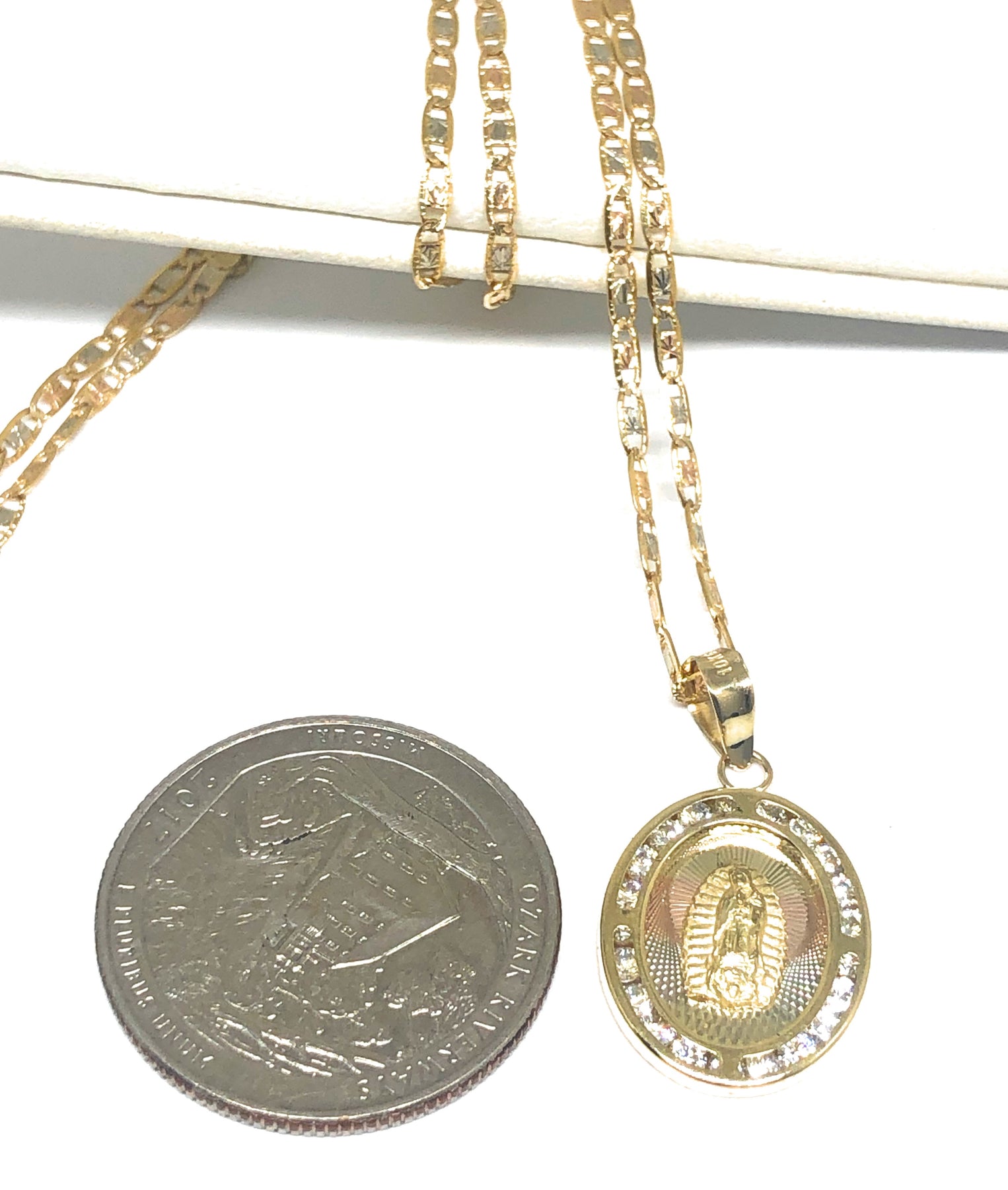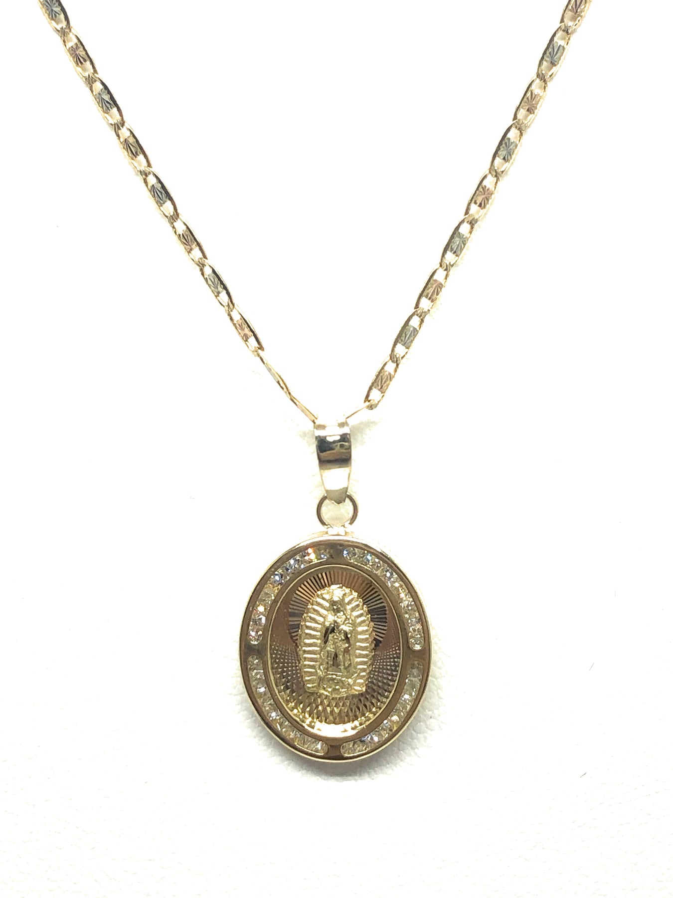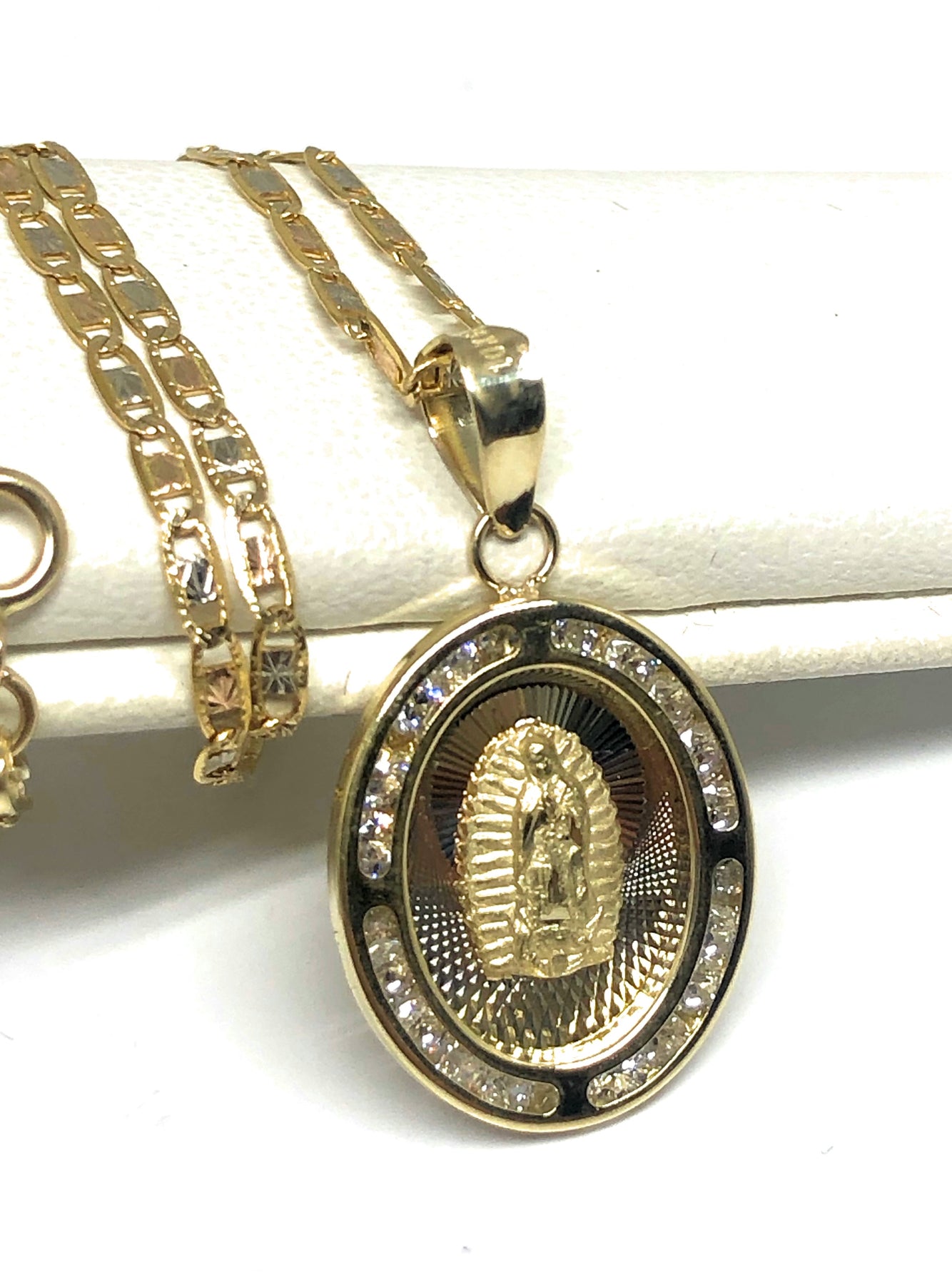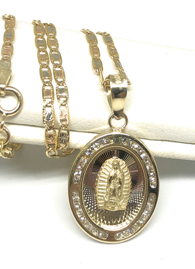10k Solid Gold Tri-Color Virrgin Mary CZ Oval Pendant Necklace Virrgen Gaudalupe