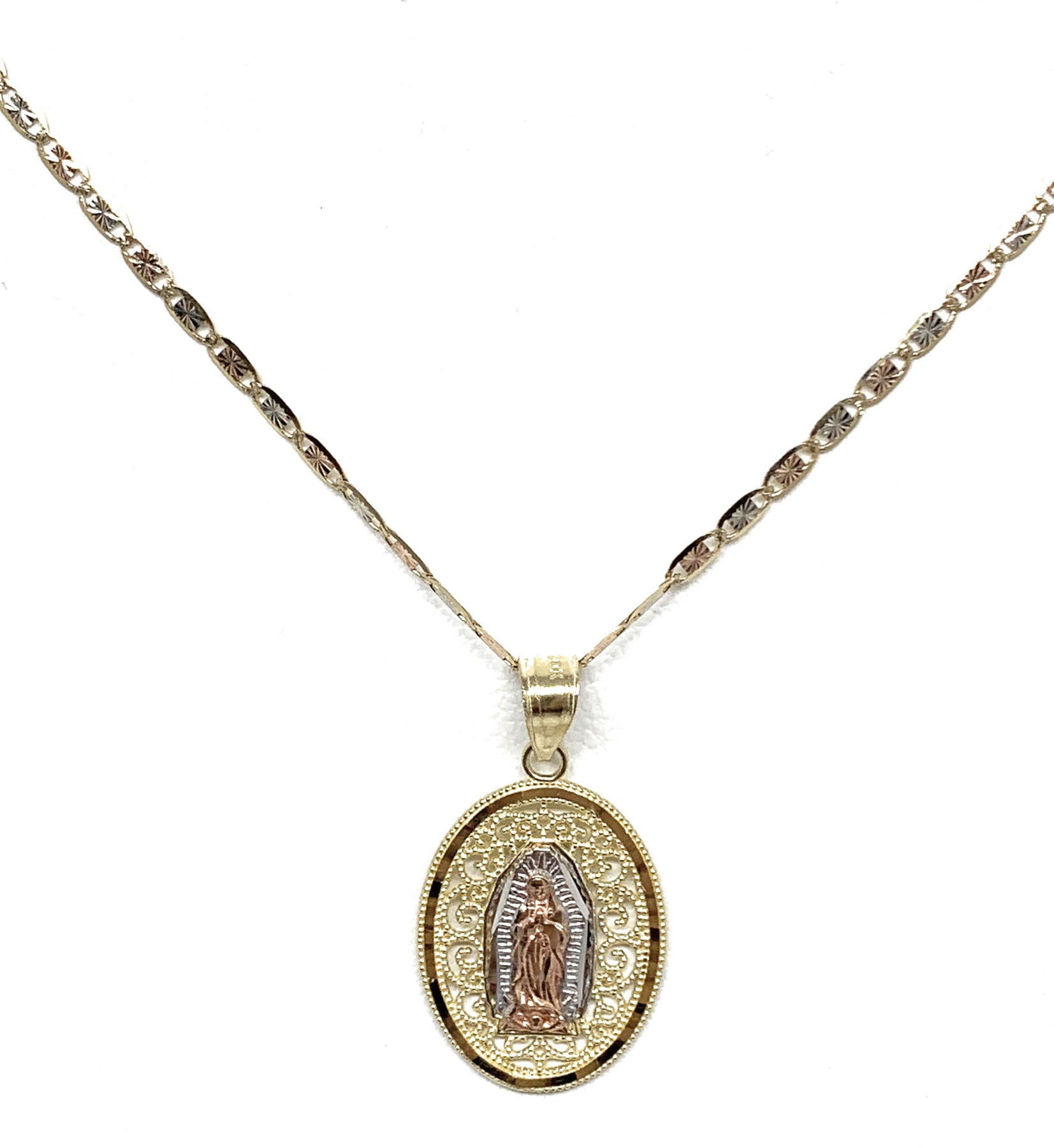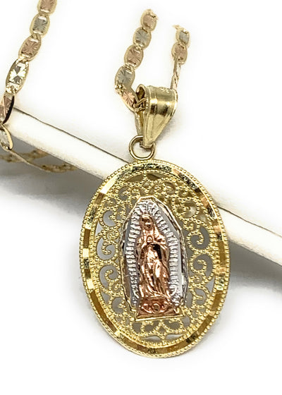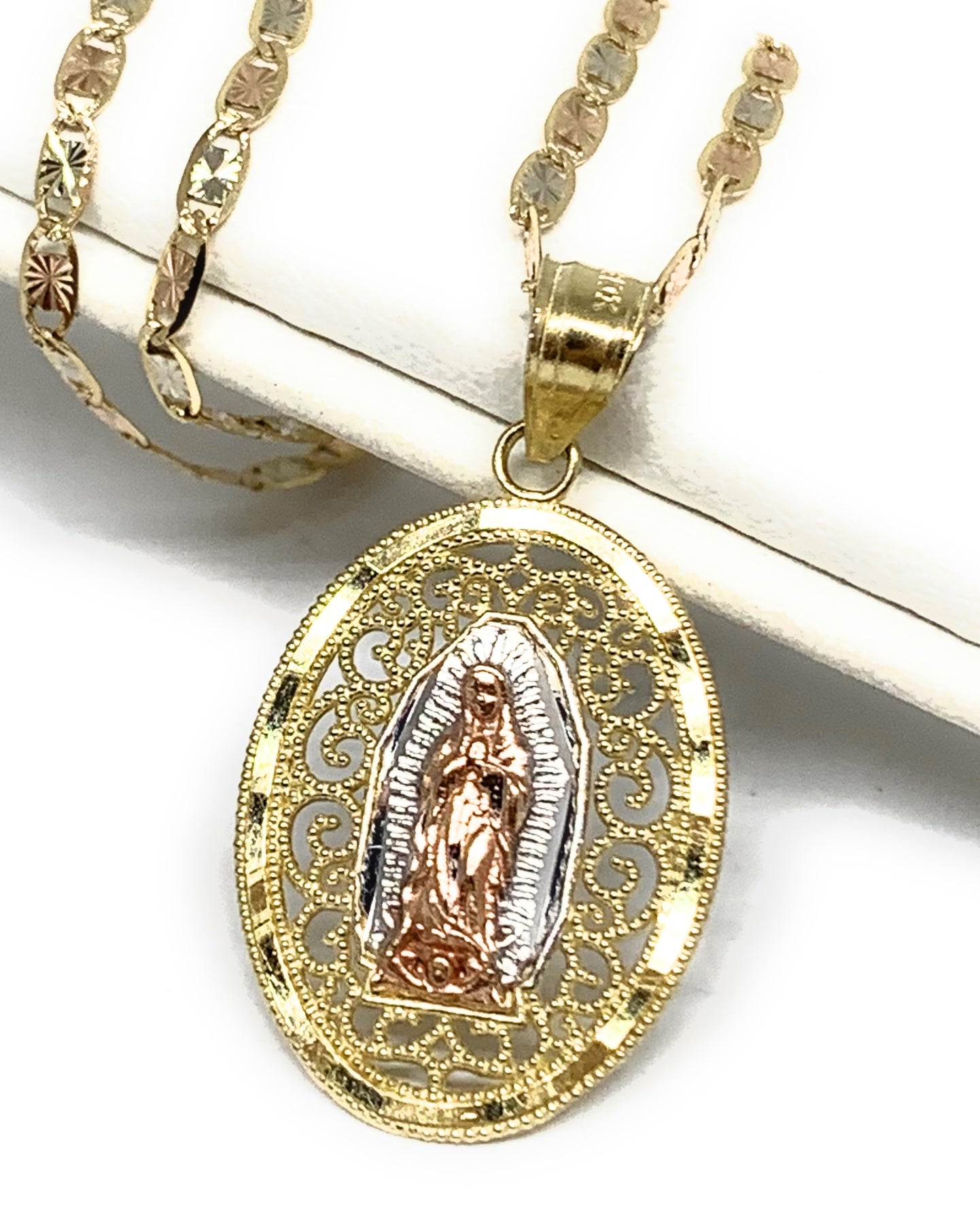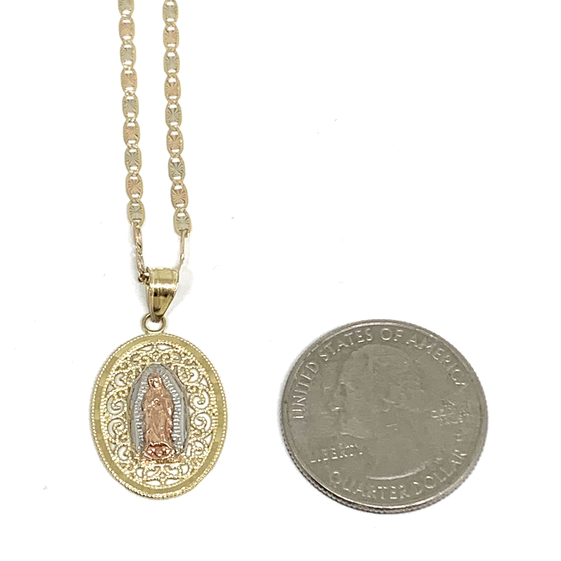 10k Solid Gold Tri-Color Virrgin Mary Filigran Pendant Virrgen Guadalupe Tri-Color Chain