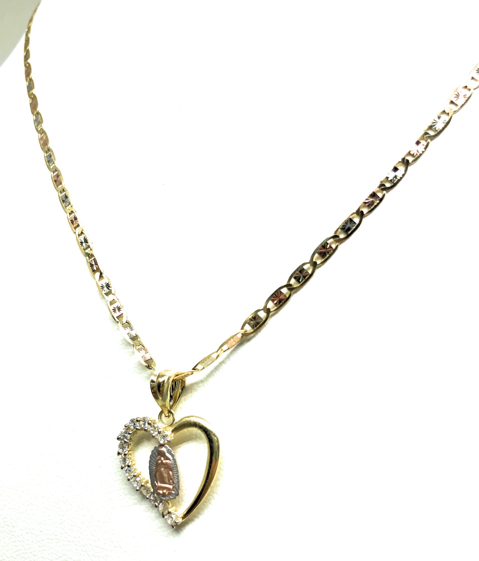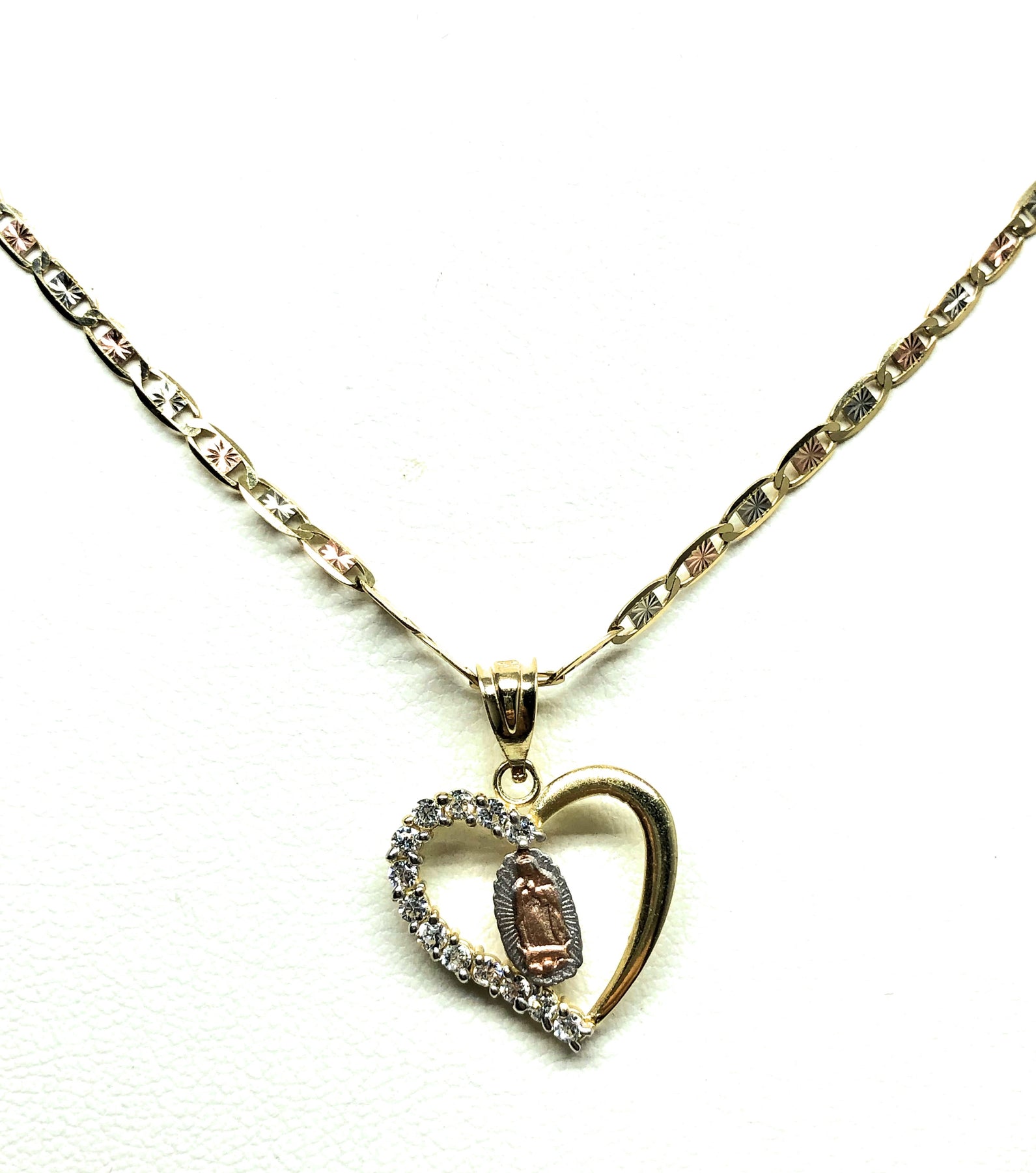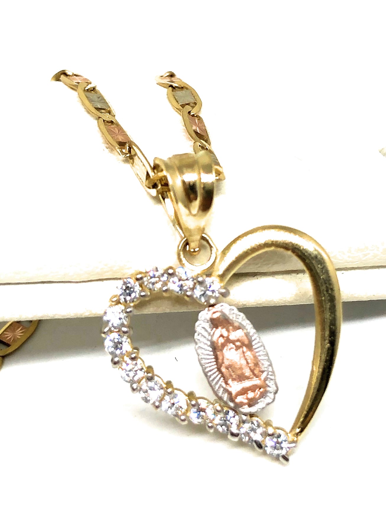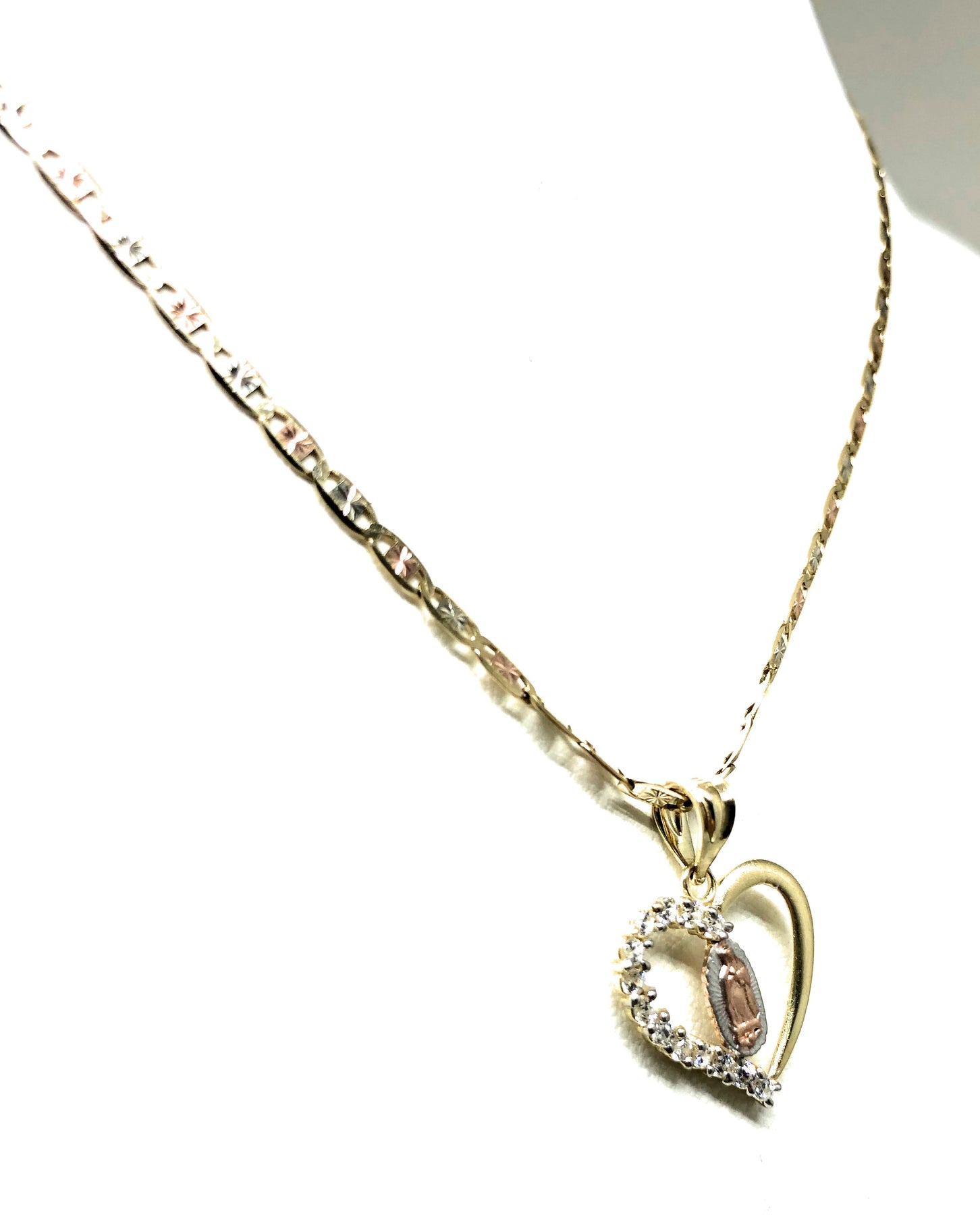 10k Solid Gold Tri-Color Virrgin Mary Heart CZ Pendant Necklace Virrgen Gaudalupe Valentina Chain