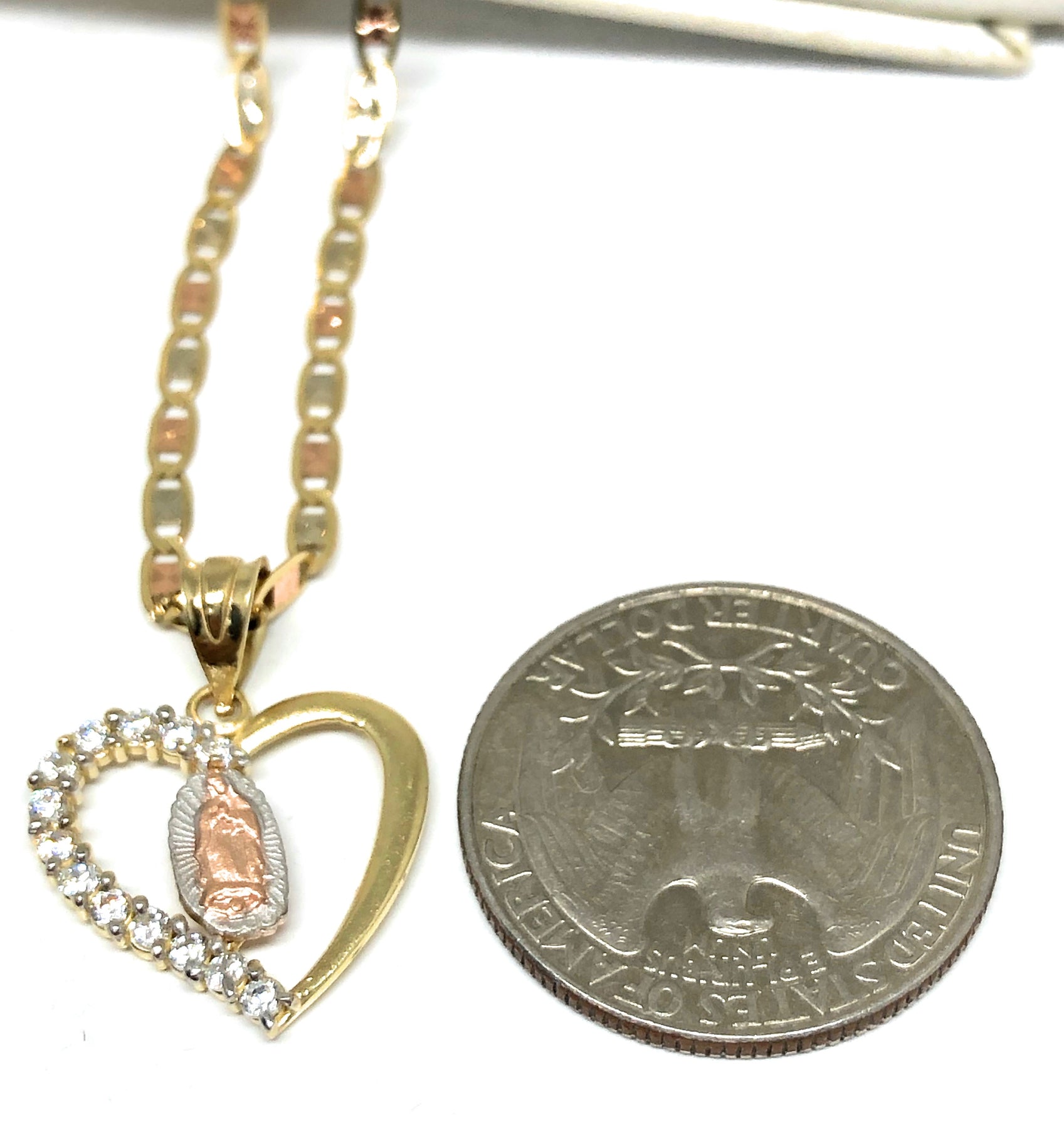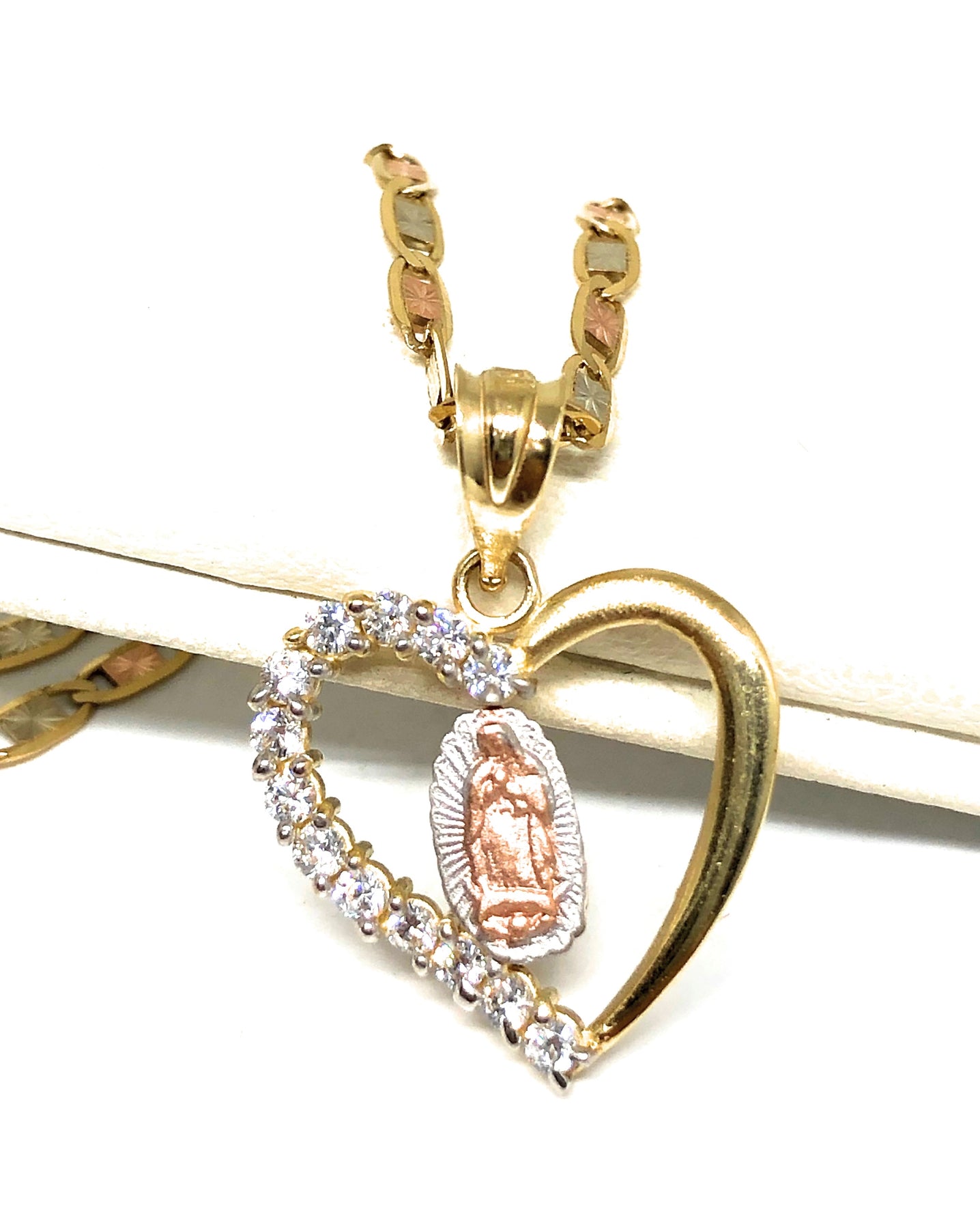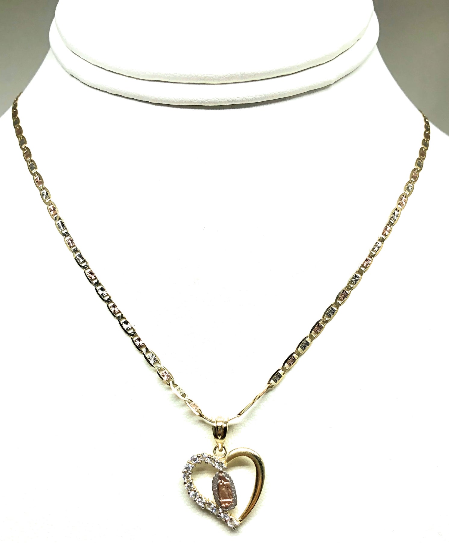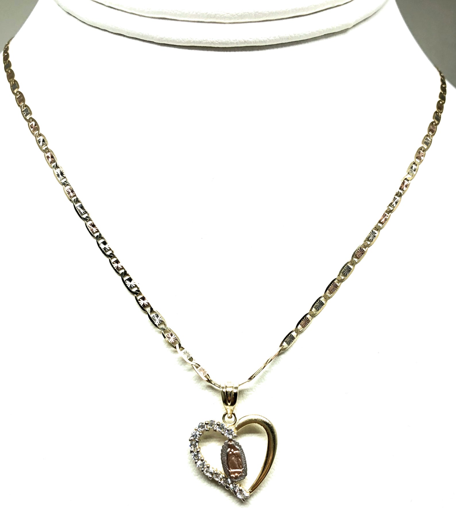 10k Solid Gold Tri-Color Virrgin Mary Heart CZ Pendant Necklace Virrgen Gaudalupe Valentina Chain