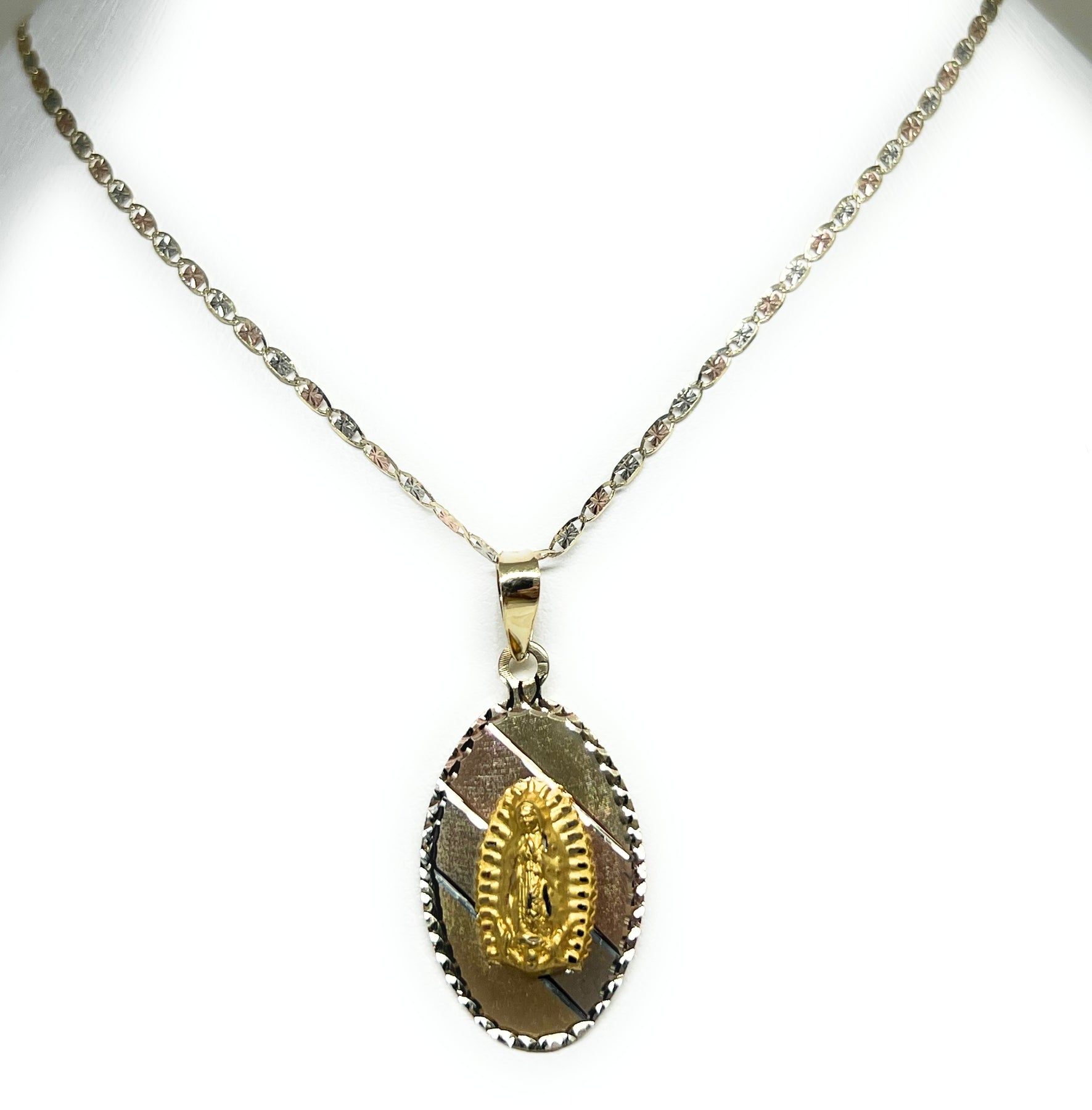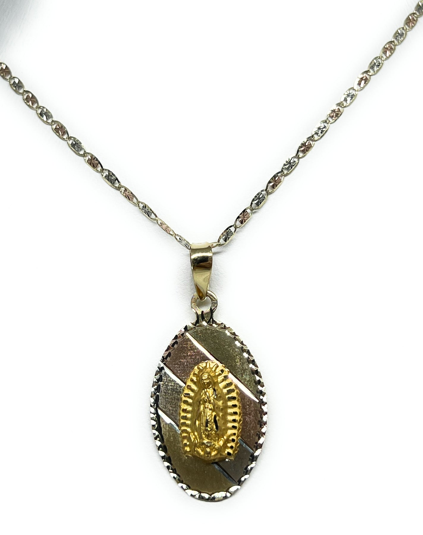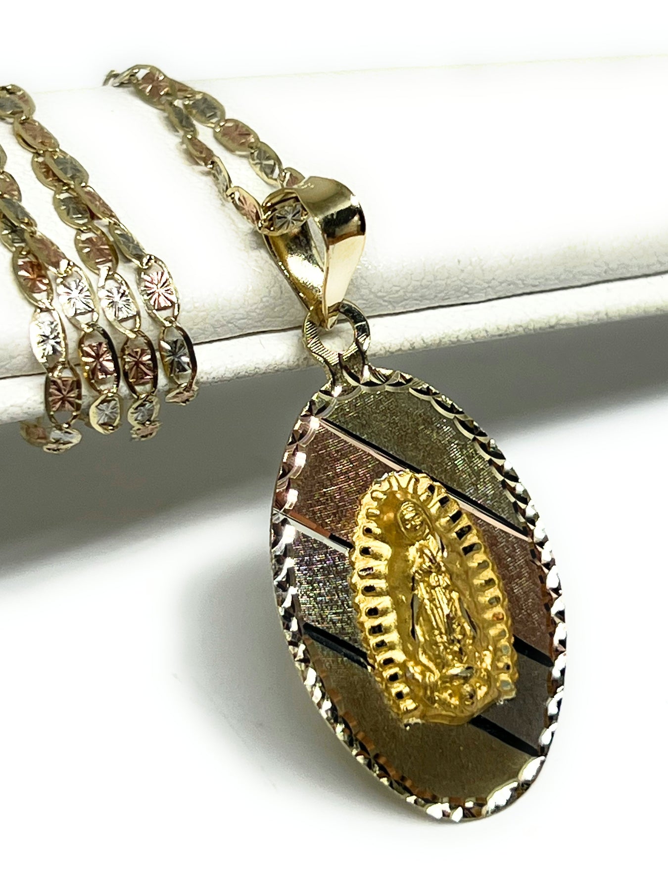 10K SOLID GOLD TRI-COLOR VIRRGIN MARY OVAL PENDANT NECKLACE VIRRGEN GAUDALUPE (MADE IN MX) (SM, MED)